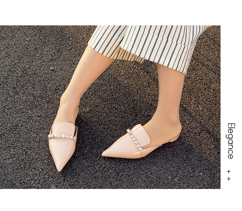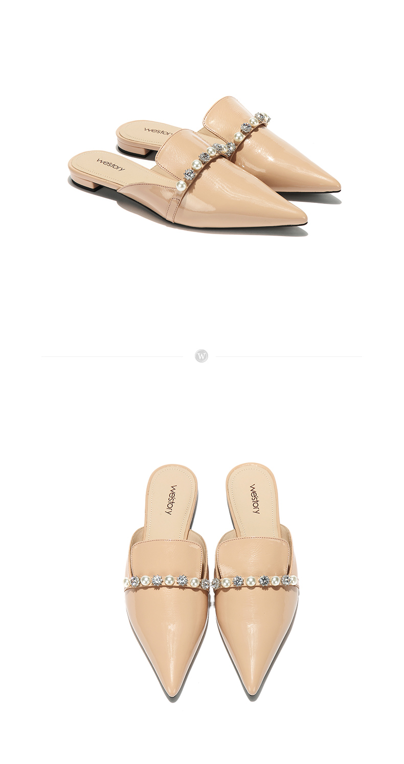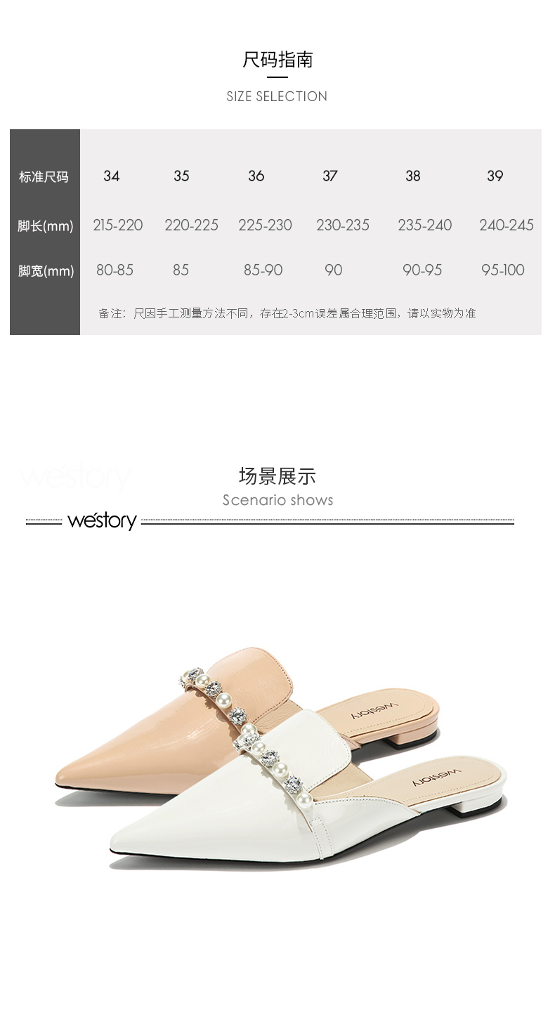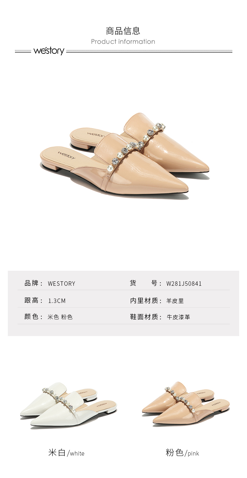 westory2018欧美尖头亮皮平跟包头方跟水钻珍珠女穆勒拖鞋W281J50841