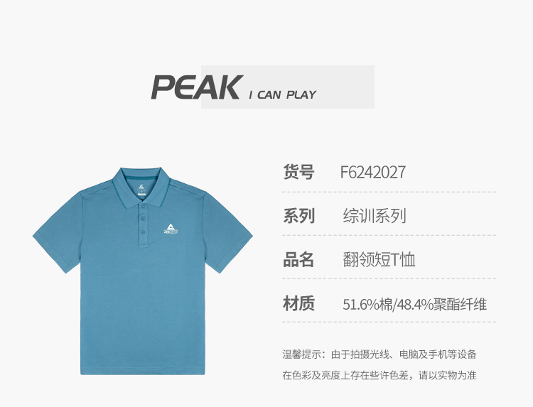 匹克2024年夏季新款轻运动系列男款翻领短T恤F6242027