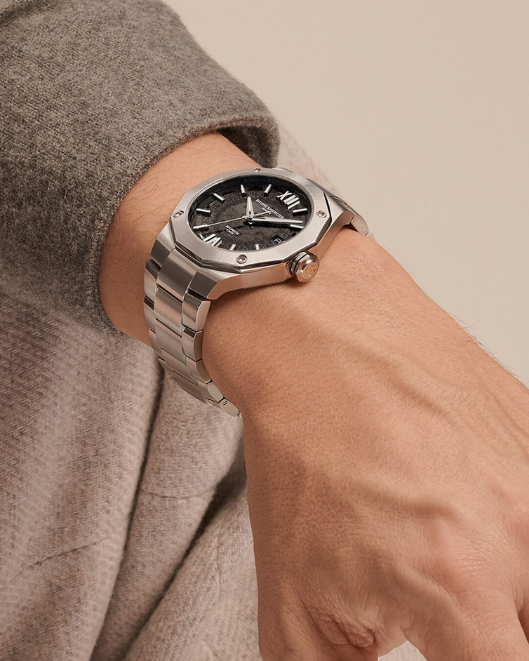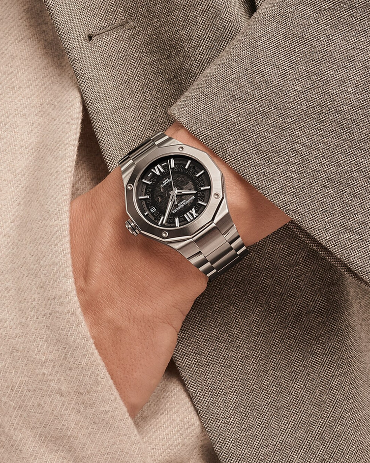 镜面材质 | 蓝宝石水晶玻璃 | 表盘 | 精钢表壳 黑色饰以山海饰纹的烟熏灰色透明蓝宝石水晶玻璃,铆钉式罗马数字与时标覆有夜光涂层 (C1, 蓝光),多面的镀铑指针,日期视窗位于3点钟位置 四颗螺钉十二边形表圈 八边形的自由表冠饰有PHI 品牌标识浮雕 |