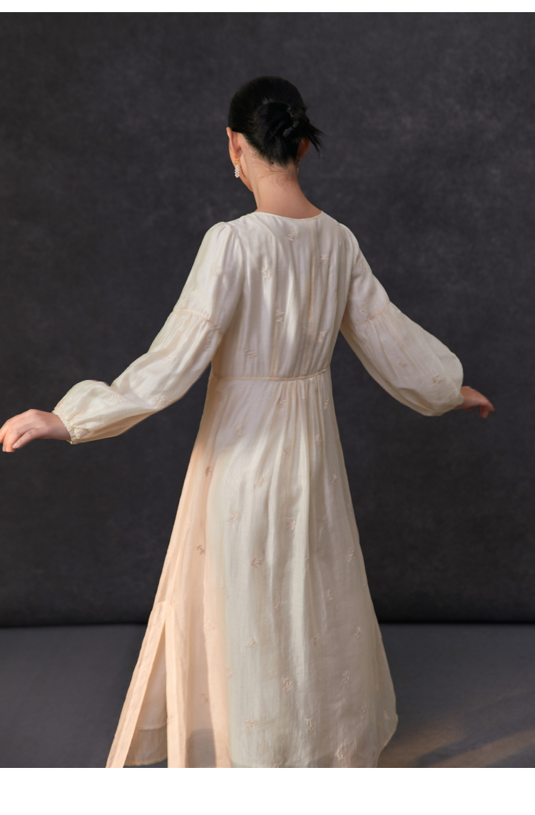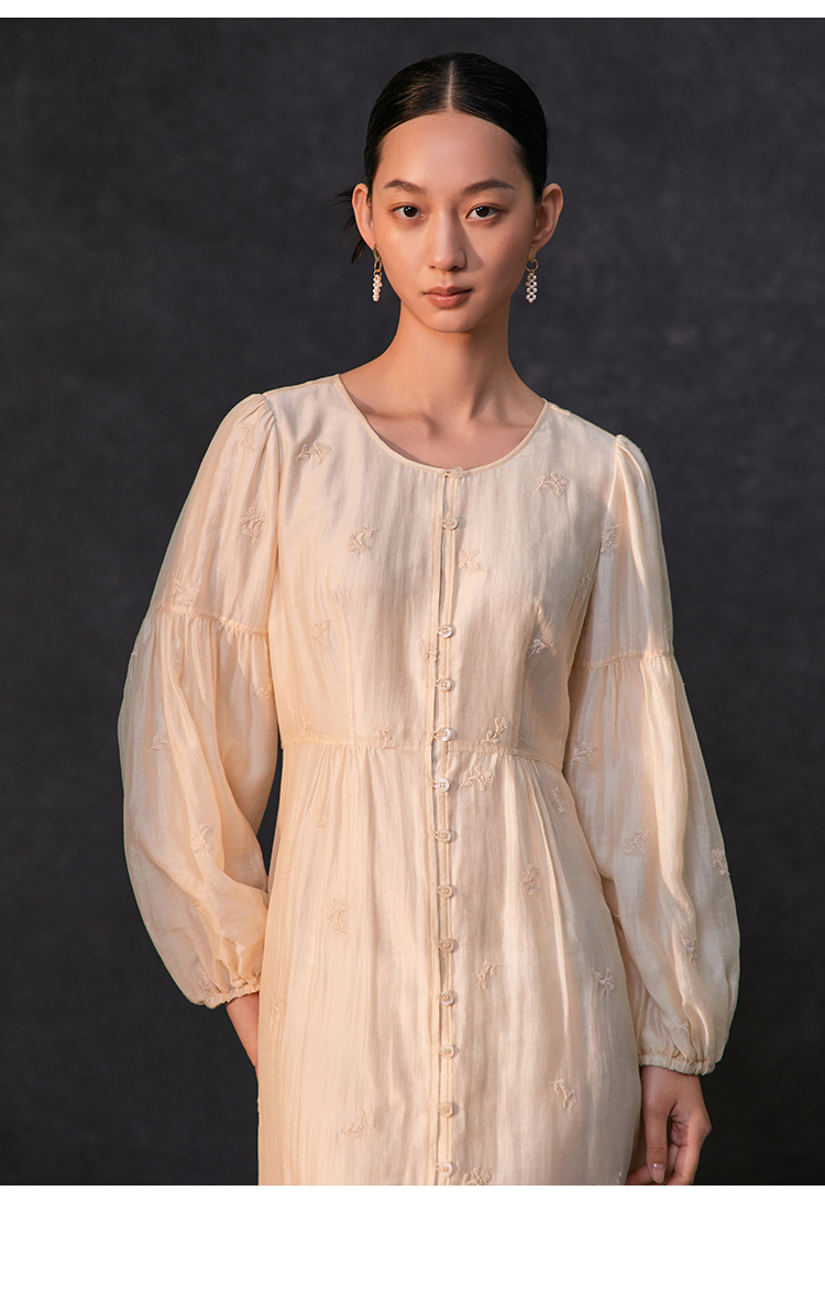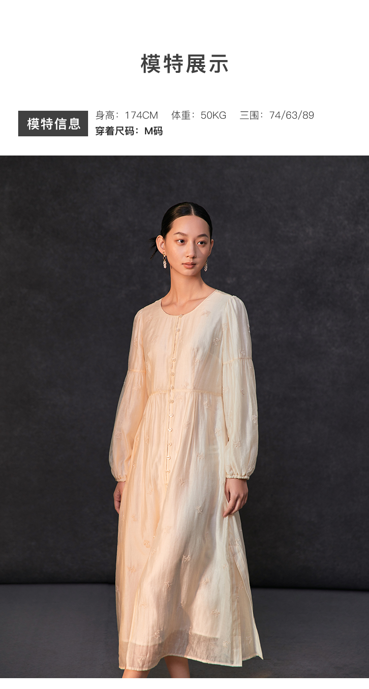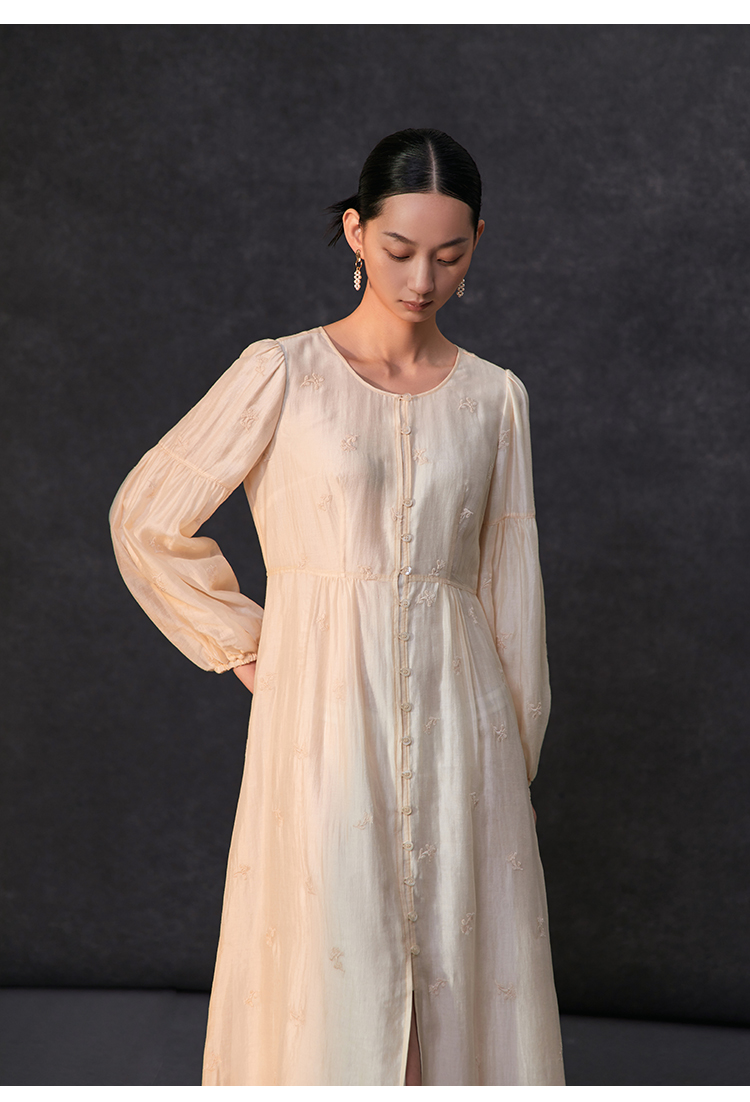 Famecoco重工绣花高腰气质天丝连衣裙女正肩长袖长裙FAC1FA013