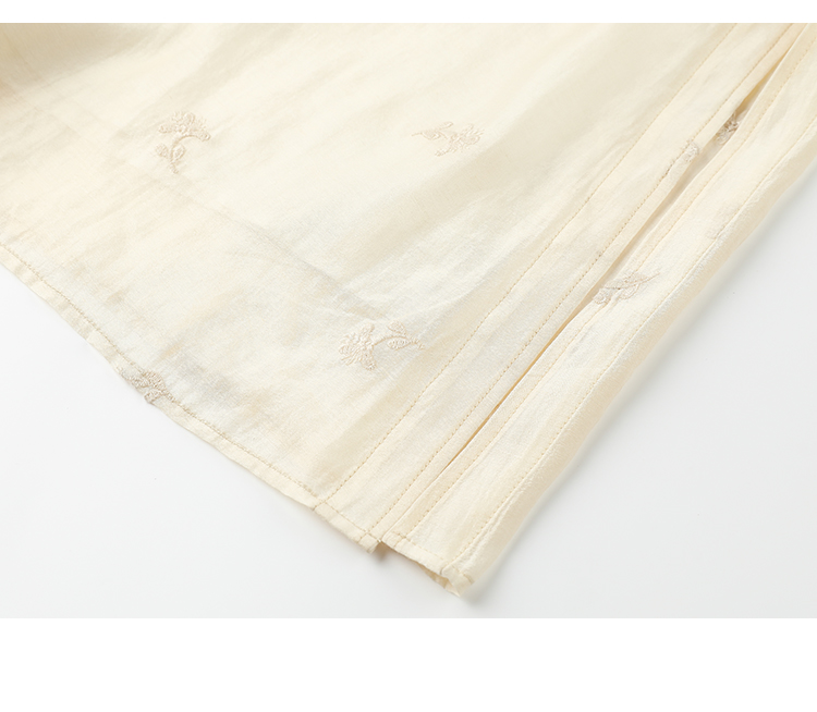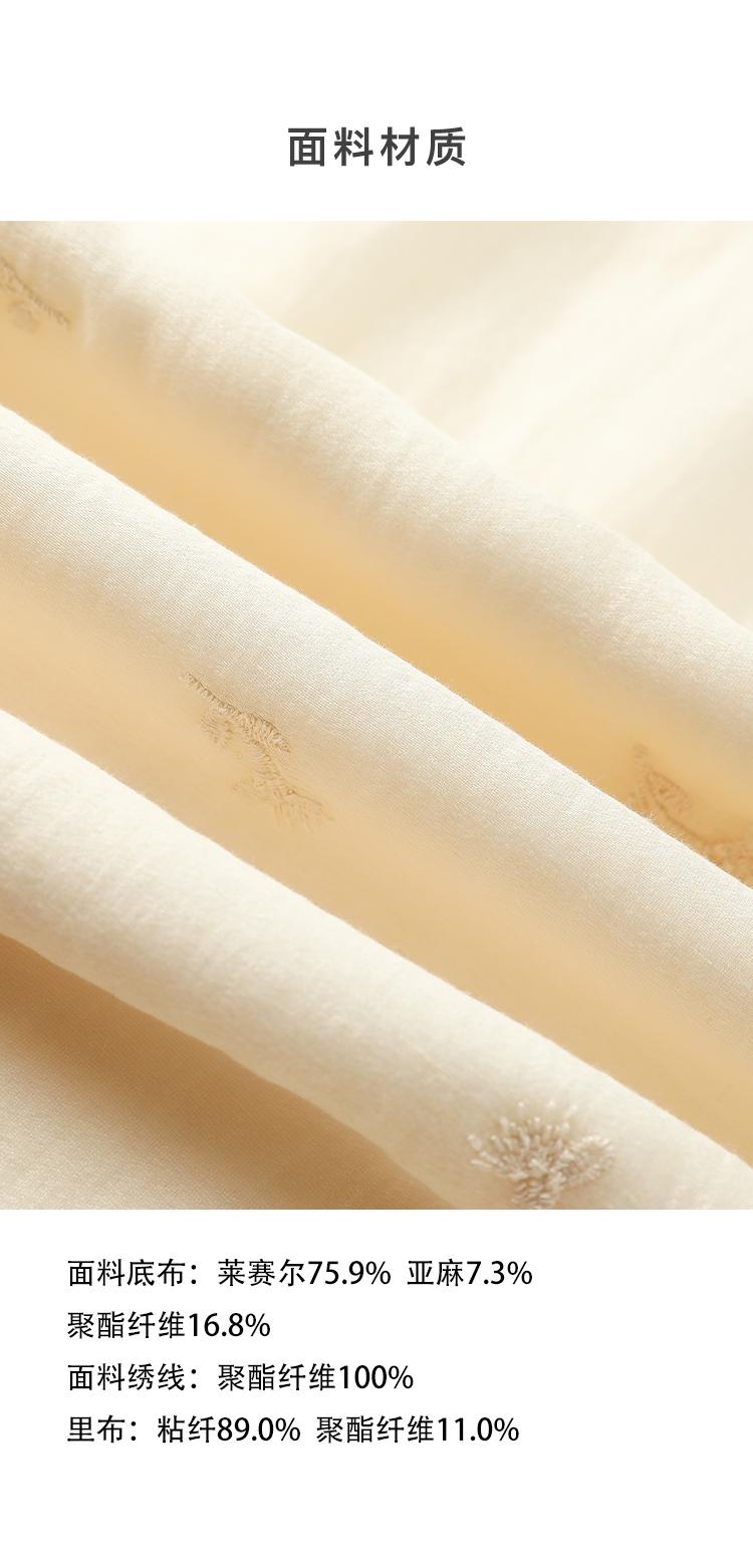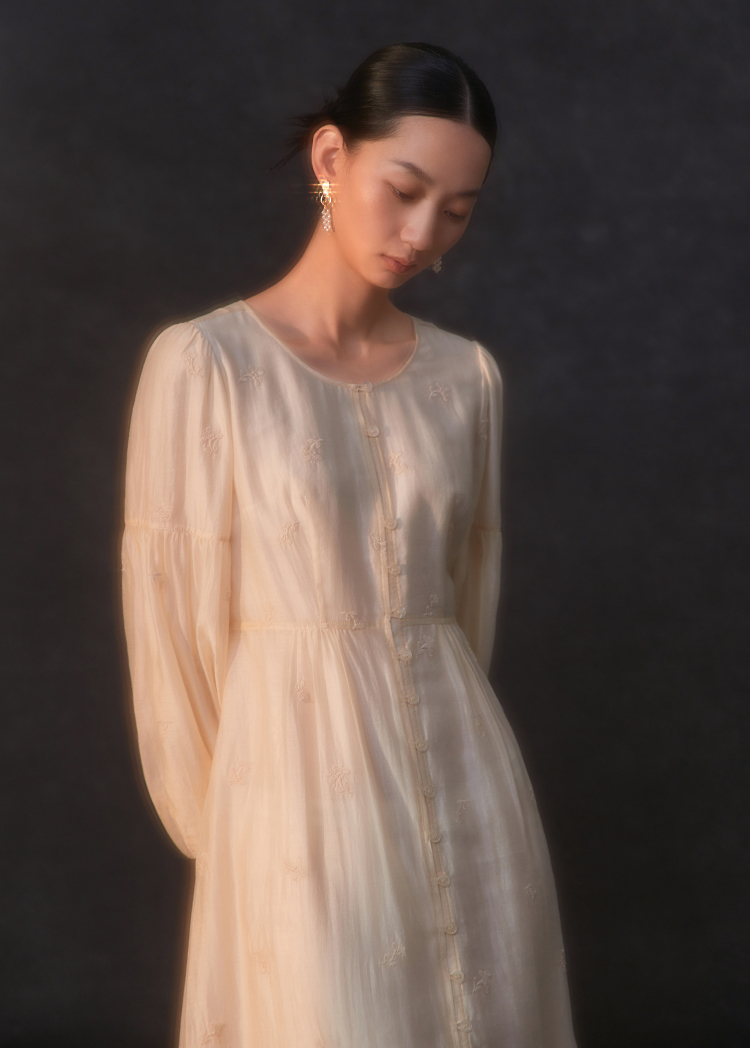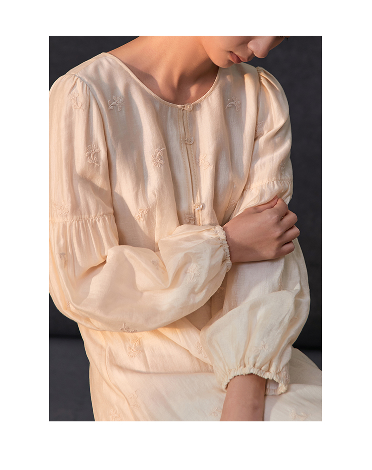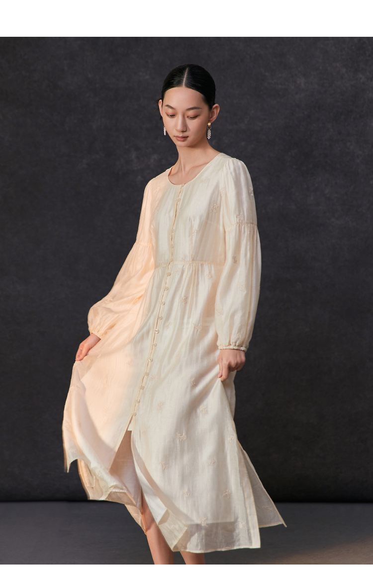 Famecoco重工绣花高腰气质天丝连衣裙女正肩长袖长裙FAC1FA013
