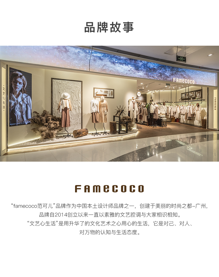 - Famecoco作为中国本土设计师品牌之一的她,创建于美丽的时尚花都广州,自2013年创立以来,一直致力于打造优雅、知性、文艺的穿着理念。