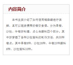 关于罐沙拉 早餐 Breakfasts 香蕉杏仁酱思慕雪………………………12 蓝莓早餐思慕雪…………………………13 绿鲜思慕雪………………………………15 蜜桃草莓思慕雪…………………………16 杧果思慕雪………………………………19 燕麦粒粥…………………………………20 燕麦水果杏仁露…………………………23 覆盆子黑莓思慕雪………………………24 沙拉 Salads 甜菜根胡萝卜沙拉………………………27 西瓜费塔奶酪沙拉………………………28 番茄奶酪沙拉……………………………31 玉米蓝莓沙拉……………………………32 四季豆费塔奶酪沙拉……………………35 大麦角瓜沙拉……………………………36 酸模叶蜜桃沙拉…………………………37 豌豆苗樱桃萝卜沙拉……………………38 西南风味沙拉……………………………40 芝麻菜松子帕玛森奶酪沙拉………………42 羽衣甘蓝牛油果沙拉………………………43 大麦羽衣甘蓝沙拉…………………………44 鹰嘴豆希腊沙拉……………………………47 大白芸豆综合蔬菜沙拉……………………48 菠菜樱桃萝卜藜麦沙拉……………………50 布格麦食沙拉……………………………53 草莓山羊奶酪沙拉…………………………54 亚洲风味蔬菜沙拉…………………………55 考伯沙拉…………………………………56 石榴洋梨沙拉……………………………59 香酥帕尔玛火腿奶油生菜沙拉……………60 水果沙拉…………………………………63 牛油果莎莎酱沙拉…………………………64 棕榈心沙拉………………………………65 凯萨沙拉…………………………………66 苹果苦苣沙拉……………………………67 菠菜蓝莓蓝纹奶酪沙拉……………………68 托斯卡纳面包沙拉…………………………70 ...... 沙拉油醋酱 Salad Dressings 柠檬油醋酱………………………… 13 红酒油醋酱………………………… 16 青柠油醋酱………………………… 19 蓝莓油醋酱………………………… 23 法式油醋酱………………………… 24 雪利酒油醋酱……………………… 28 香脂醋油醋酱……………………… 31 和风油醋酱………………………… 97 苹果蜂蜜油醋酱………………… 111 白酒油醋酱……………………… 112 |