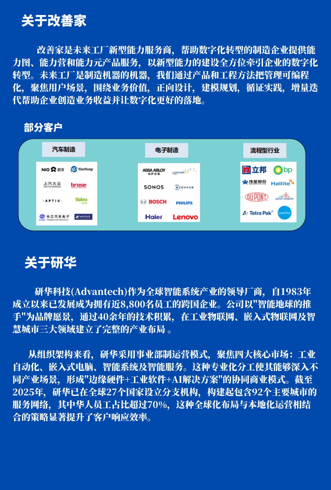 改善家是未来工厂新型能力服务商,帮助数字化转型的制造企业提供能力图、能力营和能力元产品服务,以新型能力的建设全方位牵引企业的数字化转型。