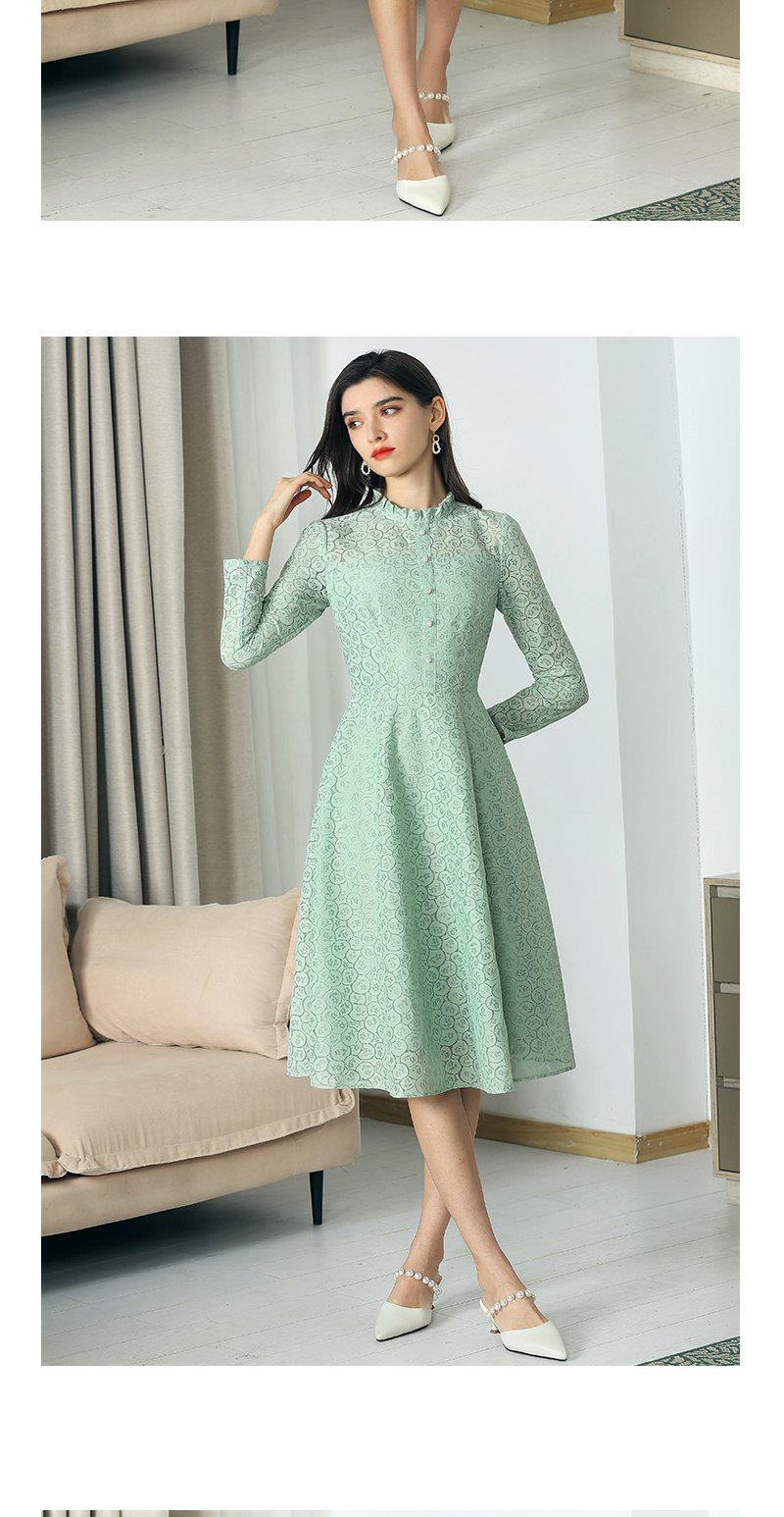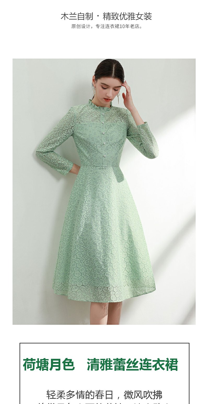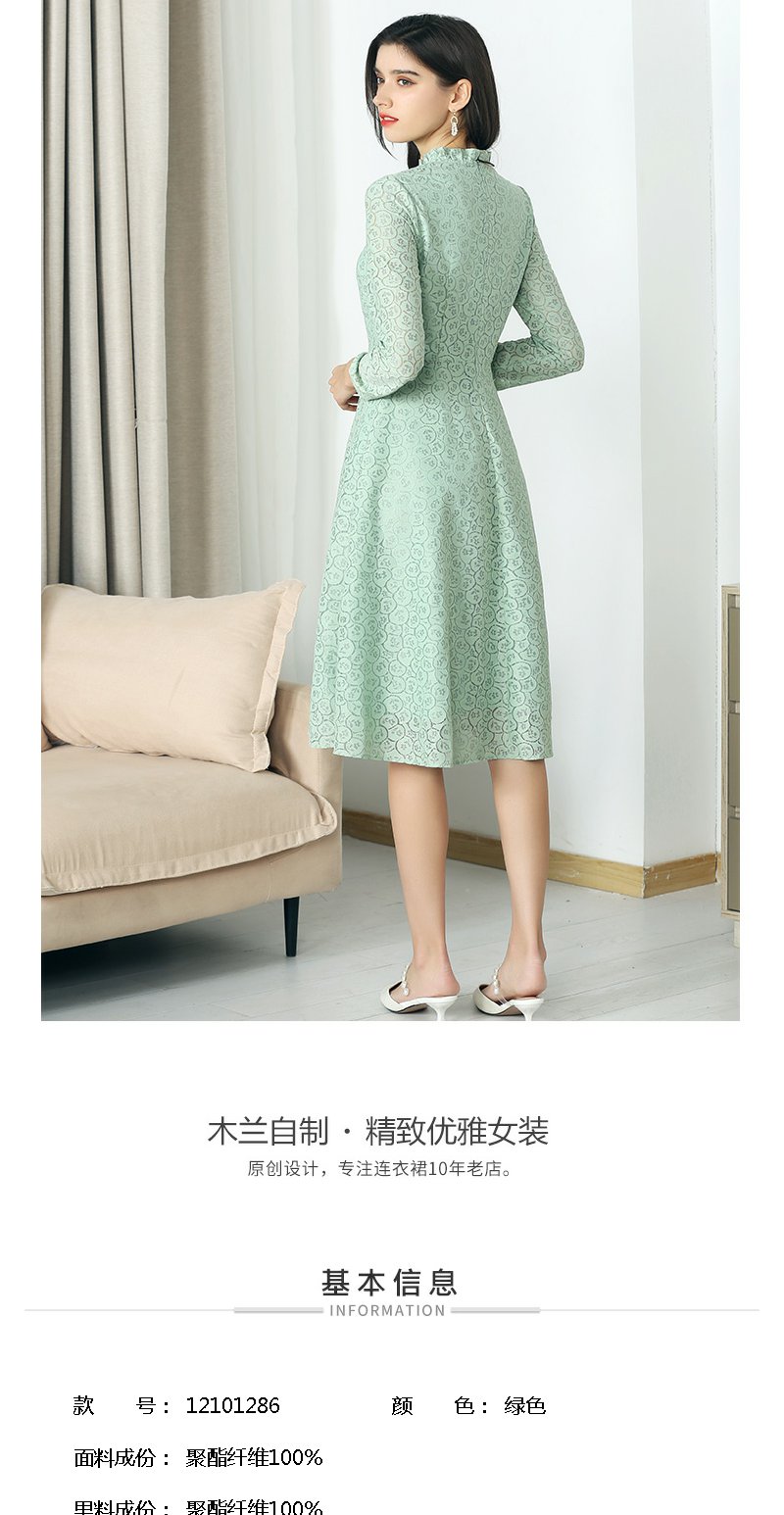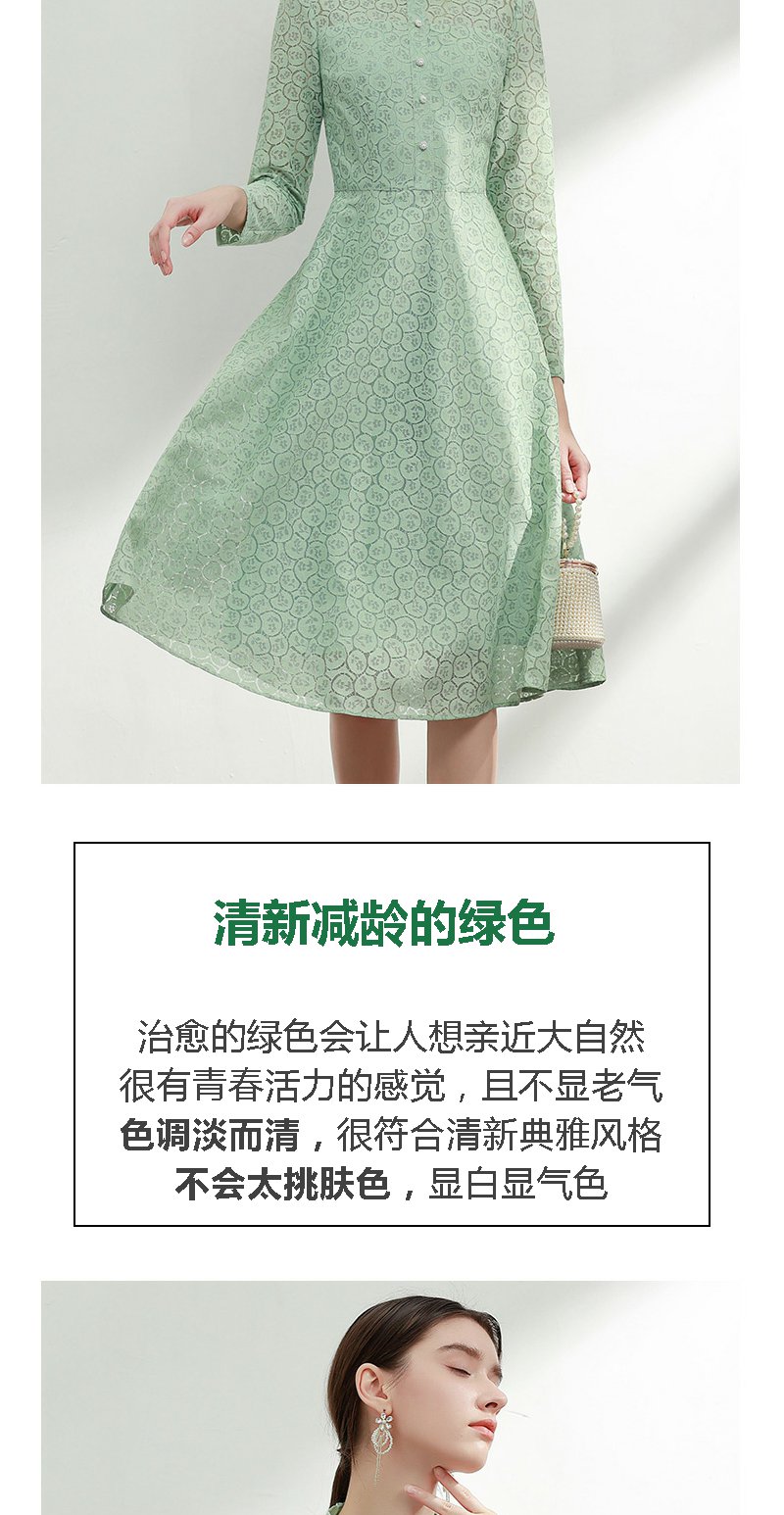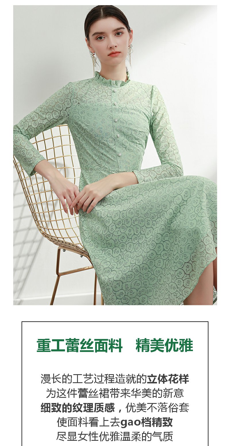 未风绿色蕾丝连衣裙女秋2024年秋季新款女装气质高腰减龄长袖裙子
