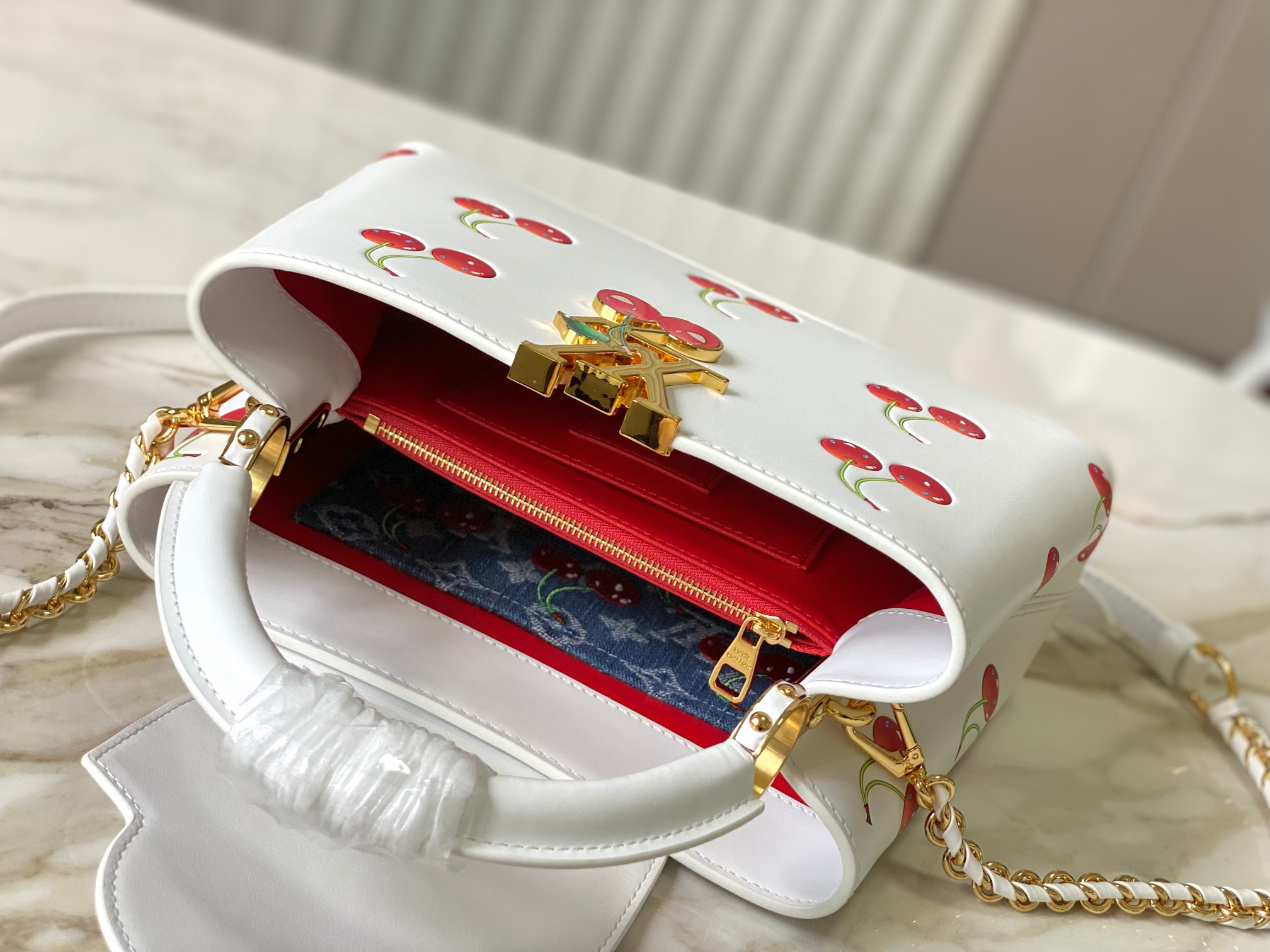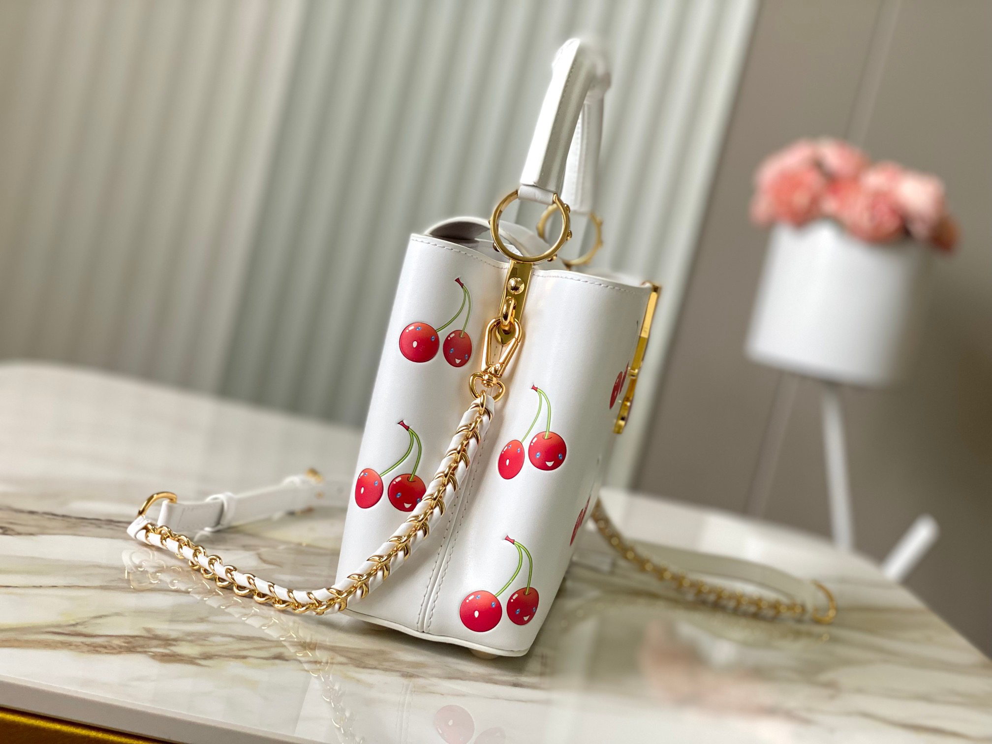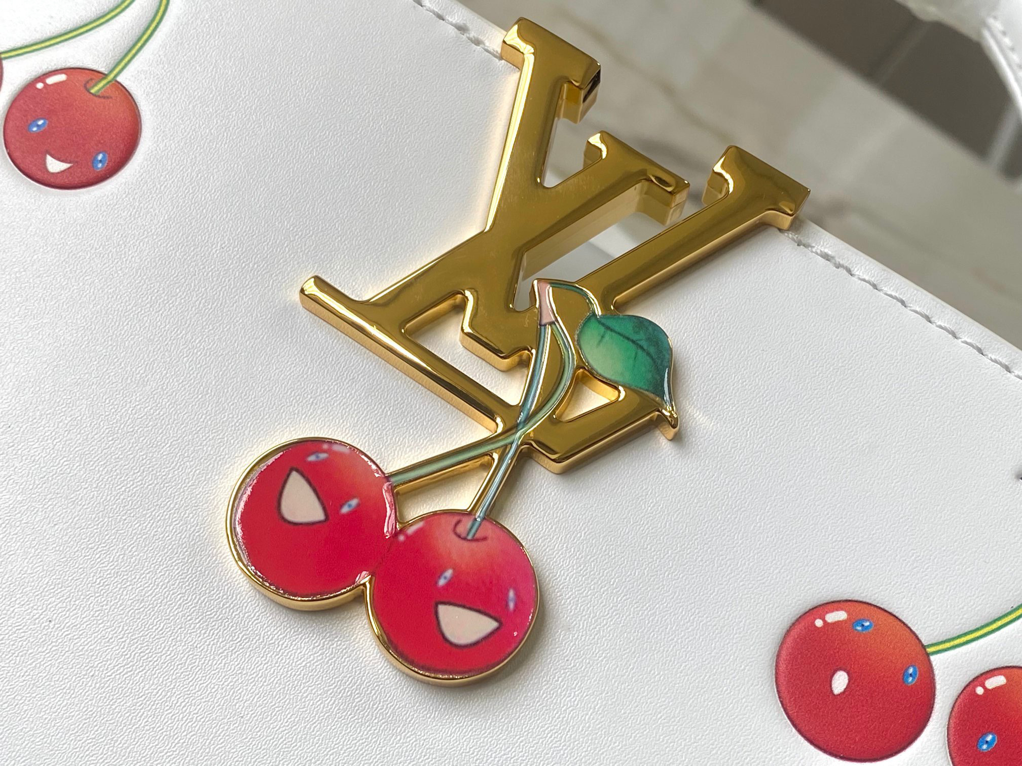 秋冬特惠💰1750 渠道级LV 新品 te级LV 动态芯片 M13251/M48865白拼樱桃链条 本款Capucines手袋以夏日风姿诠释路易威登x村上隆系列的潮流主张 牛皮革融入明丽的樱桃压纹图案 巧妙点明日本艺术家的标志性笔触 金属件和正面LV字母闪烁微妙莹泽 Size : 27 * 18 * 9 CM