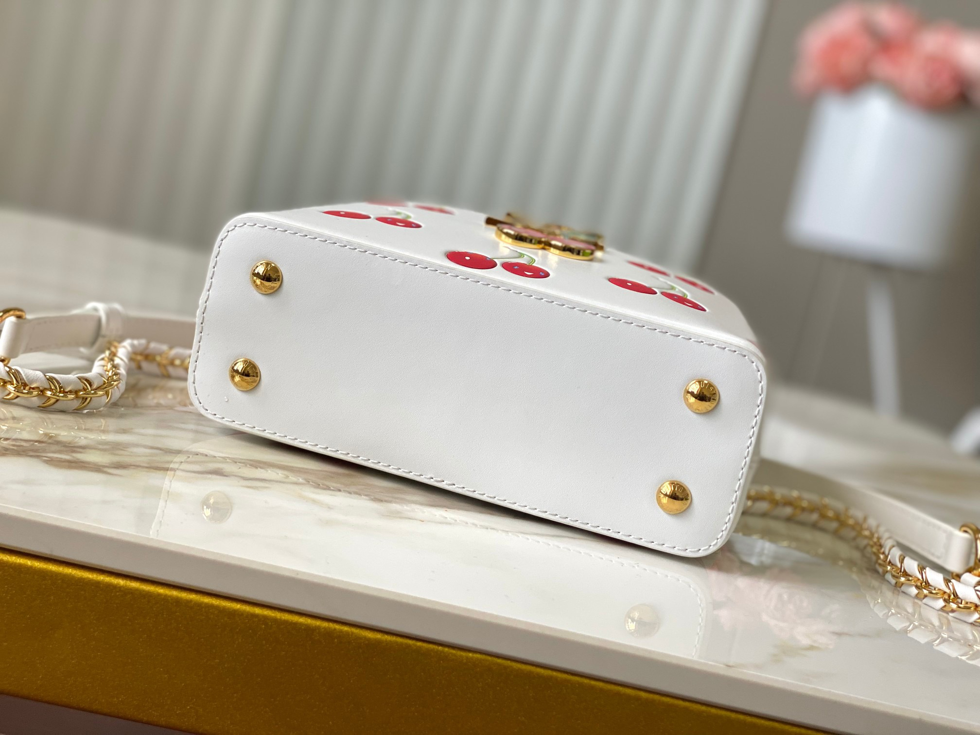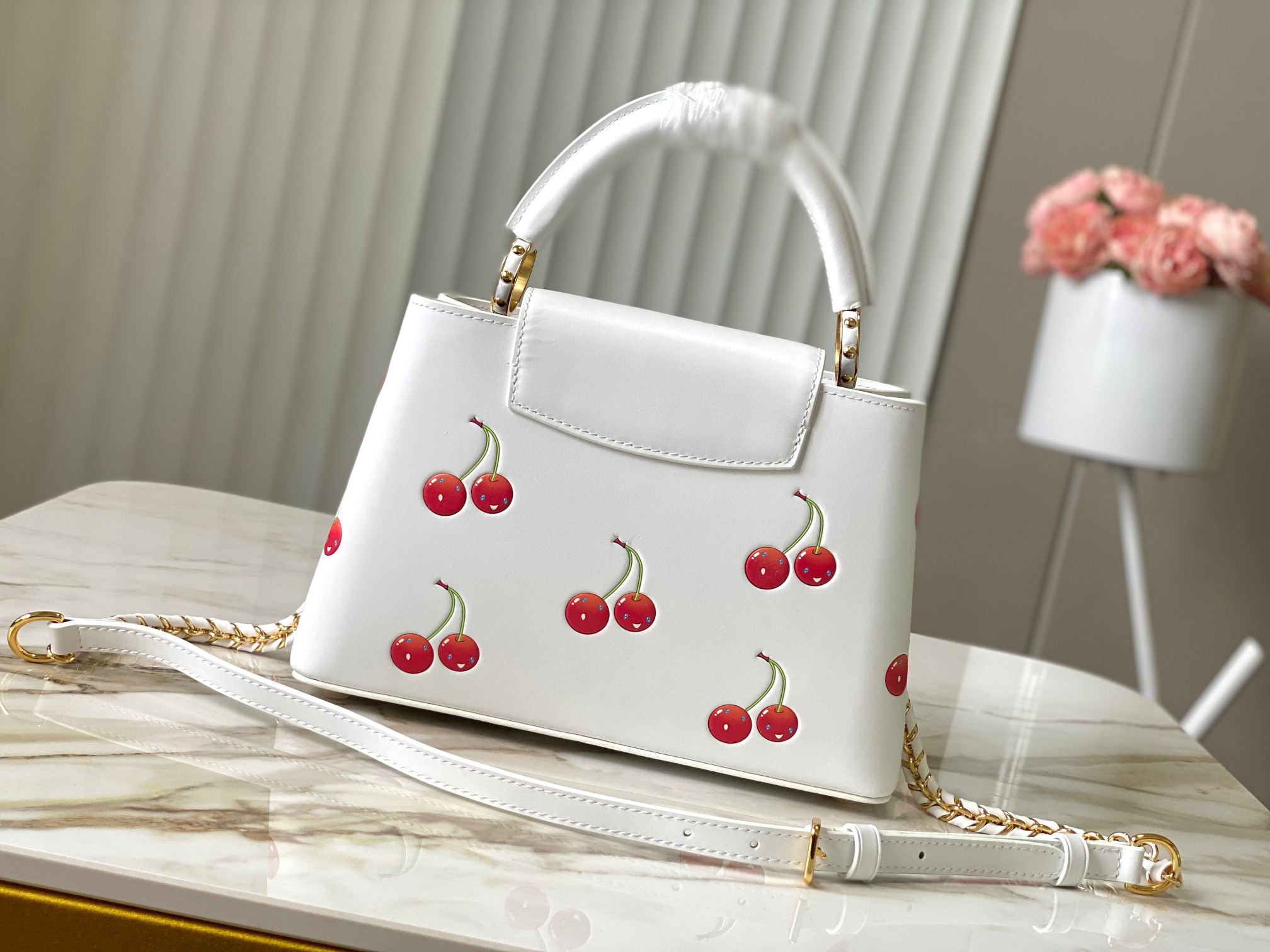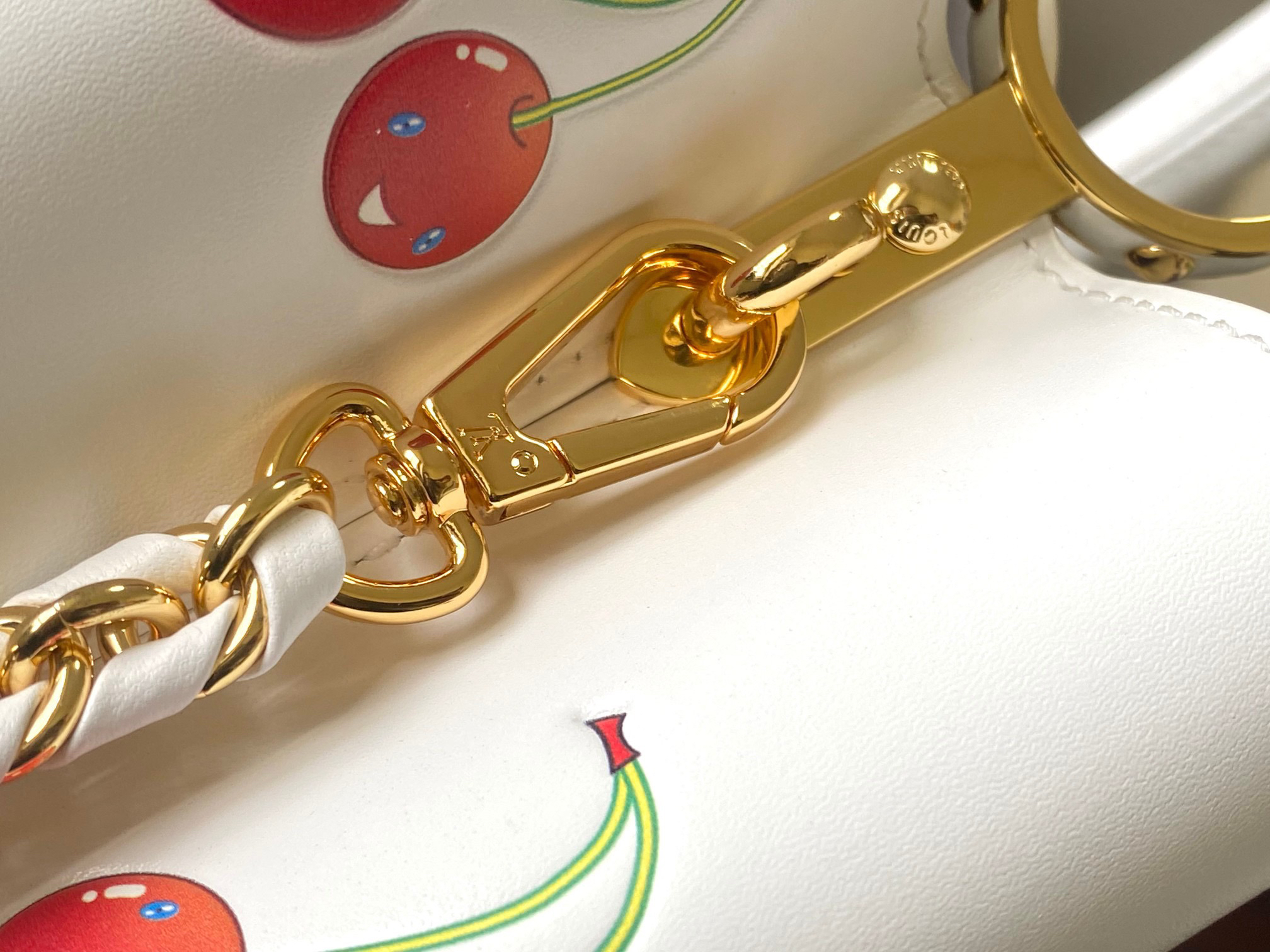 秋冬特惠💰1750 渠道级LV 新品 te级LV 动态芯片 M13251/M48865白拼樱桃链条 本款Capucines手袋以夏日风姿诠释路易威登x村上隆系列的潮流主张 牛皮革融入明丽的樱桃压纹图案 巧妙点明日本艺术家的标志性笔触 金属件和正面LV字母闪烁微妙莹泽 Size : 27 * 18 * 9 CM