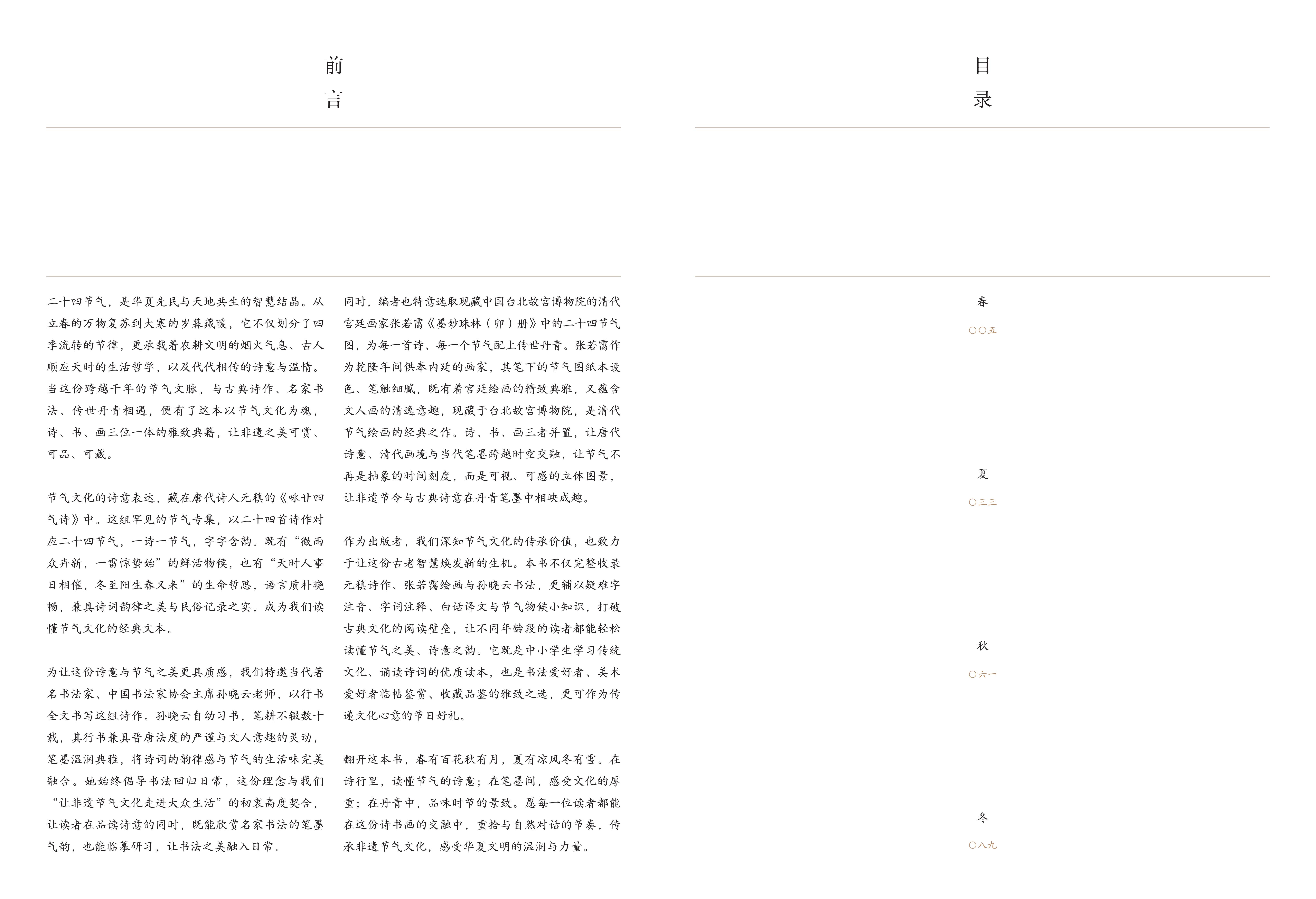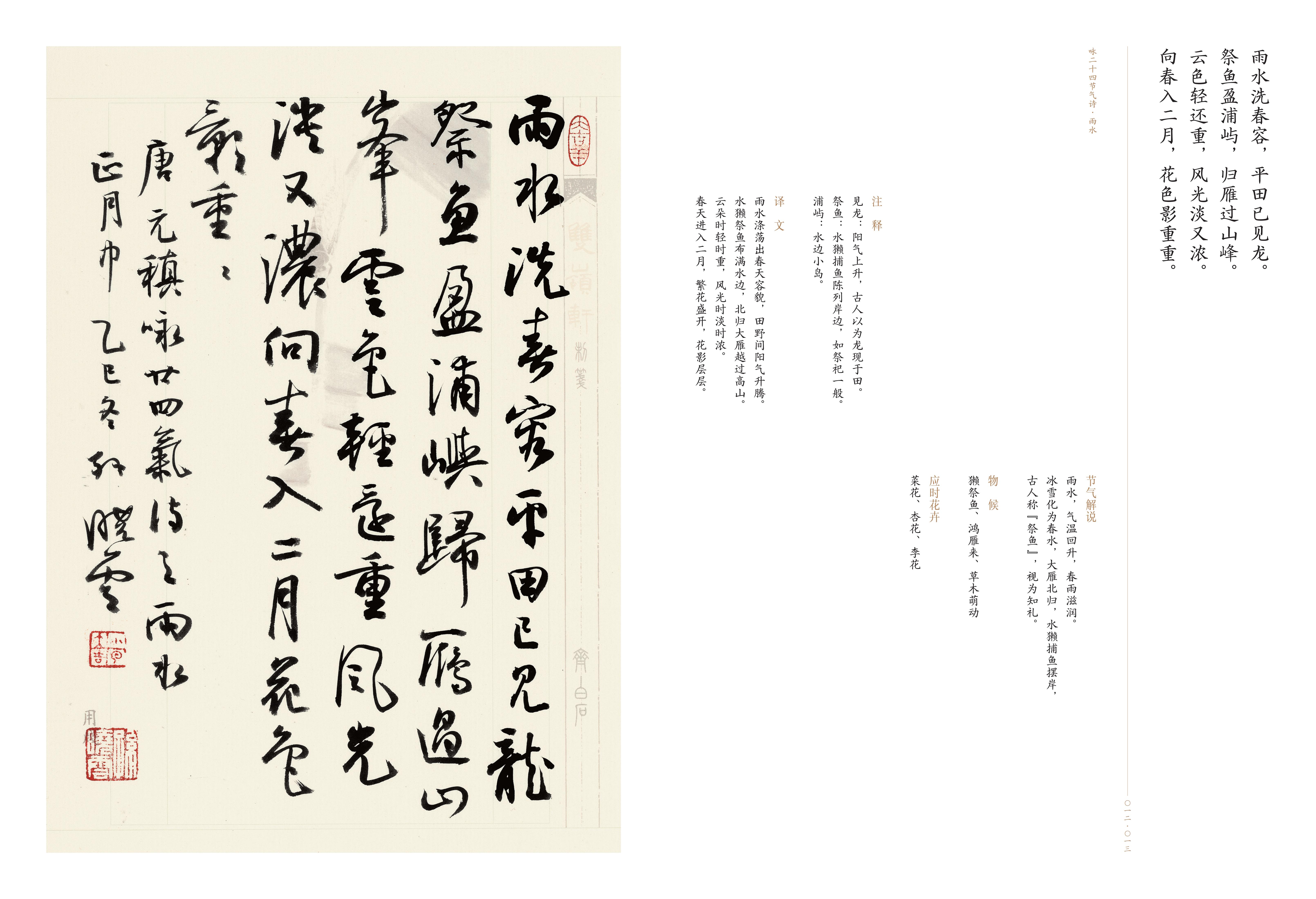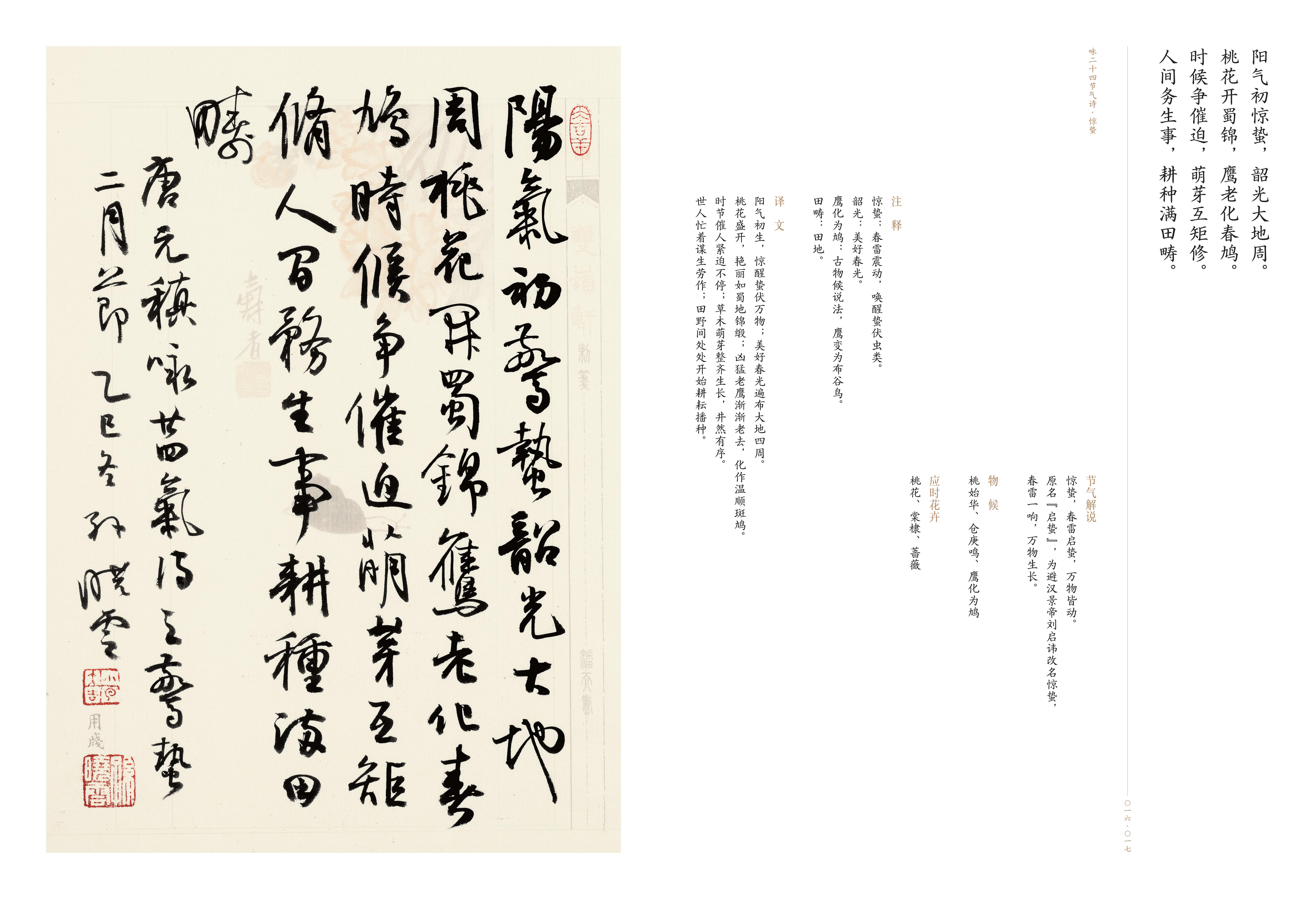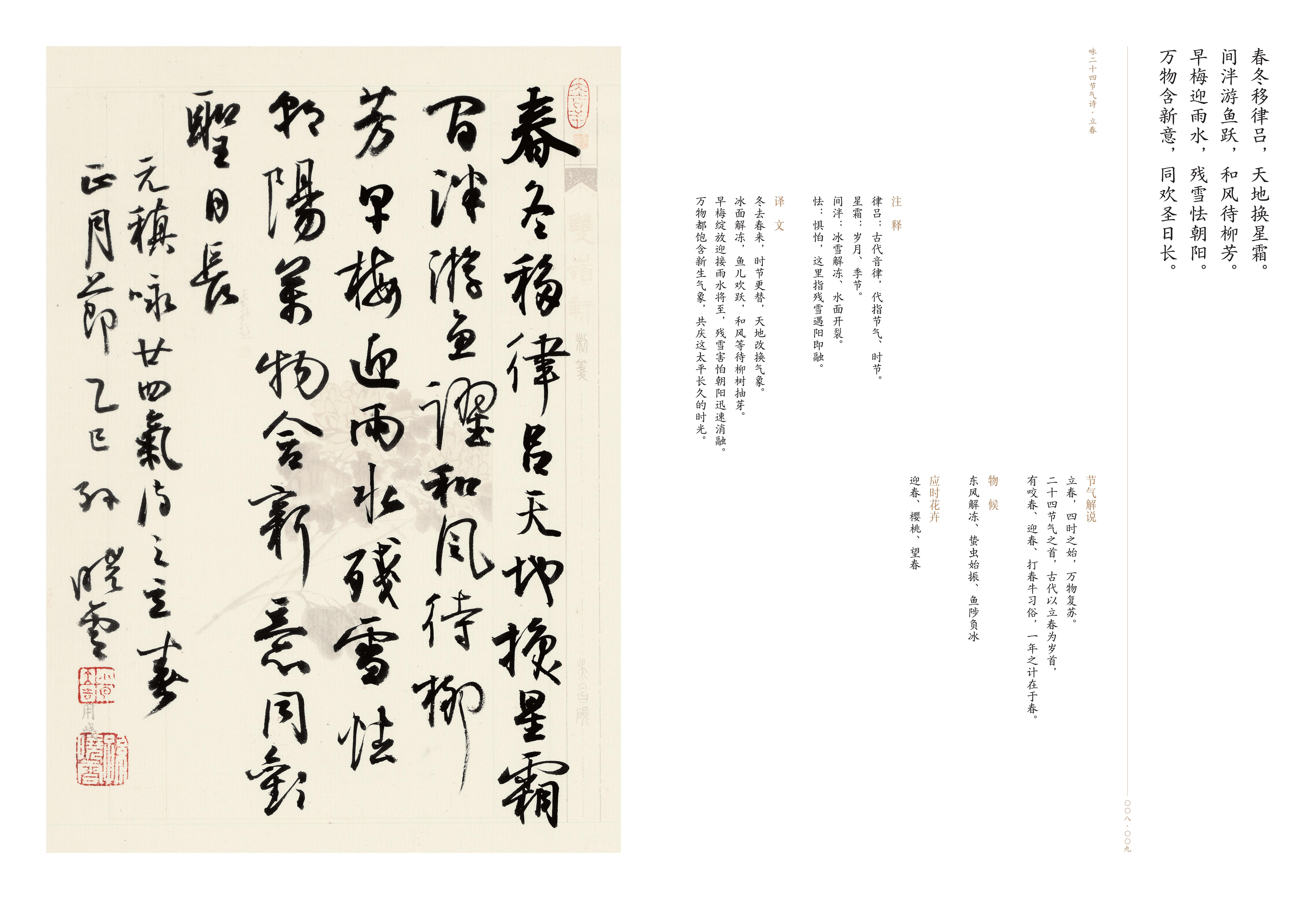 更缀清代张若霭传世节气丹青,笔触细腻如丝、雅致灵动,将每一个节气的风物情态描摹得栩栩如生,与诗之韵、书之美相映成趣,构建立体鲜活的节气艺术图景。辅以细致入微的诗词解读,褪去古典艺术的晦涩外衣,兼顾鉴赏、临摹与收藏价值,既是致敬东方美学的雅致厚礼,亦是让节气艺术之美,温柔浸润日常的诗意陪伴。