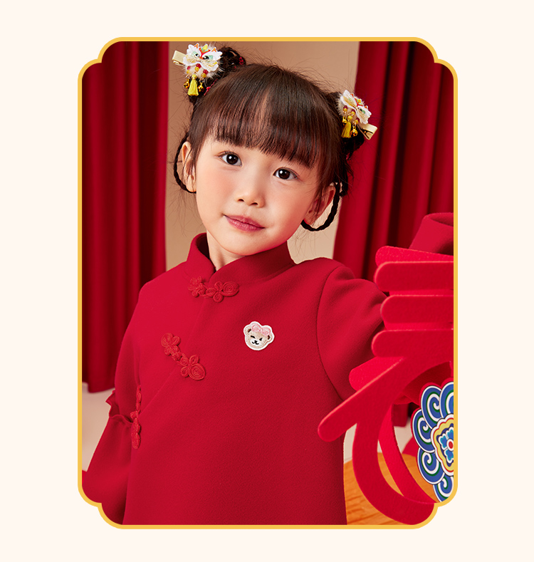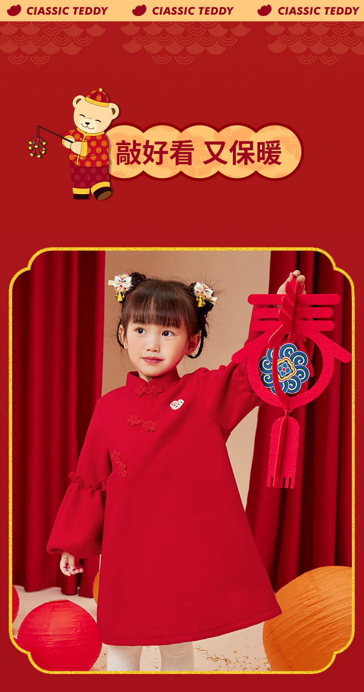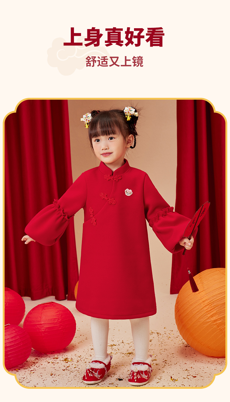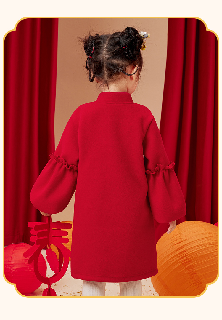 【精典泰迪】【100,130】女童加绒连衣裙儿童大红色拜年服