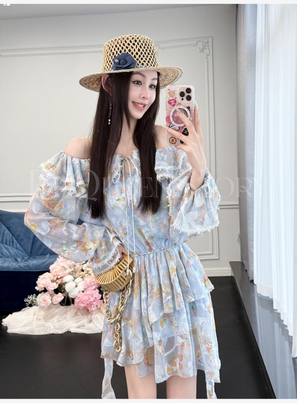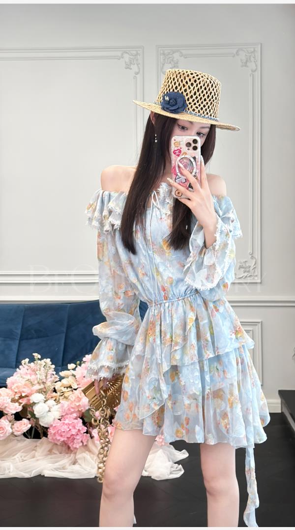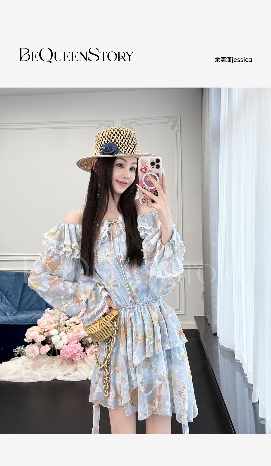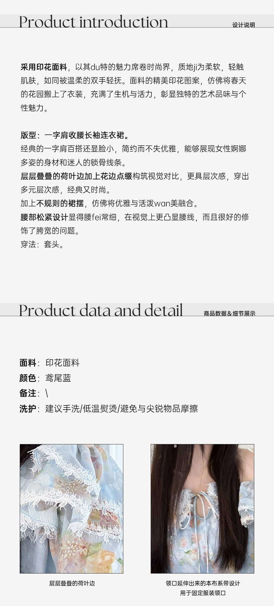 余潇潇【鸢尾奇境】经典百搭荷叶边一字肩收腰连衣裙2025春季新款