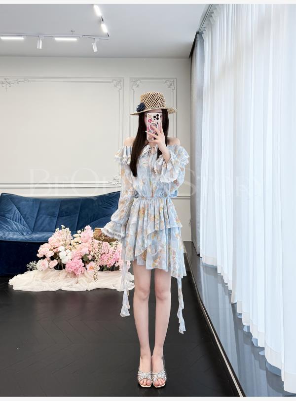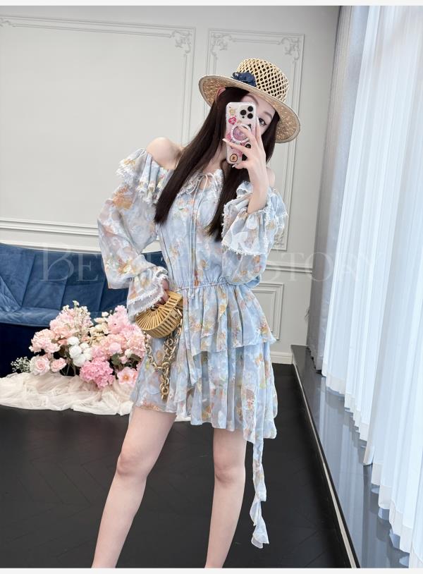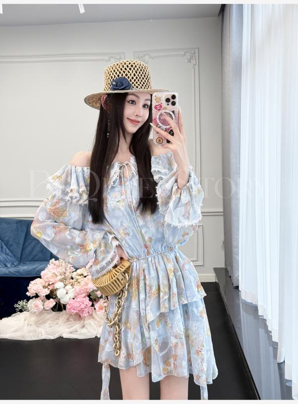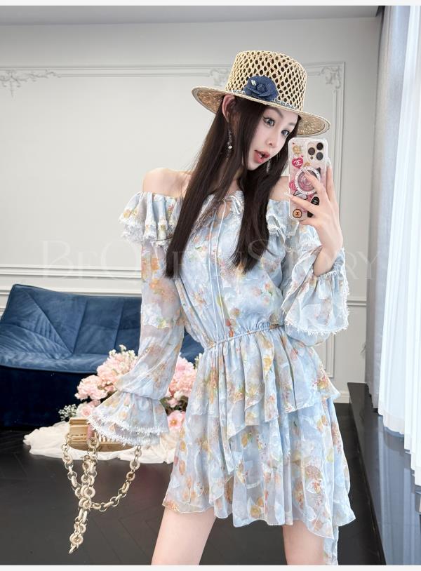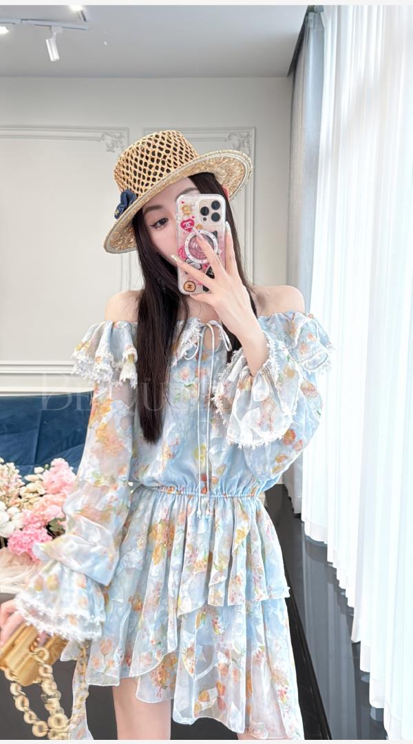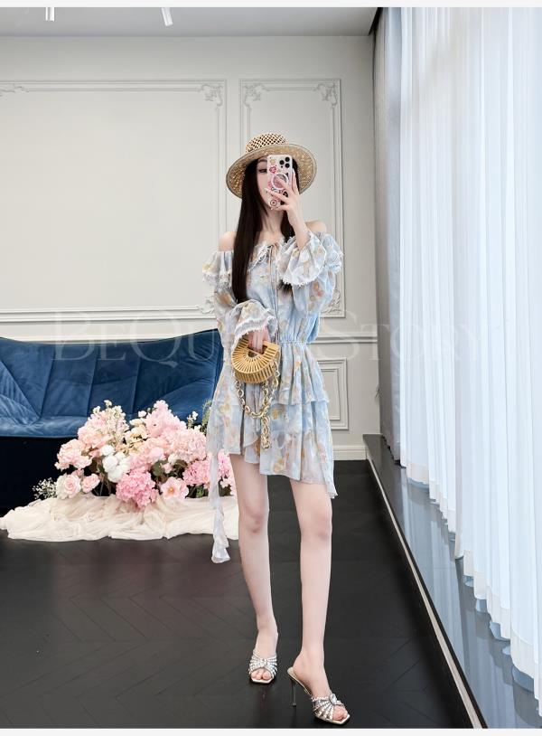 余潇潇【鸢尾奇境】经典百搭荷叶边一字肩收腰连衣裙2025春季新款
