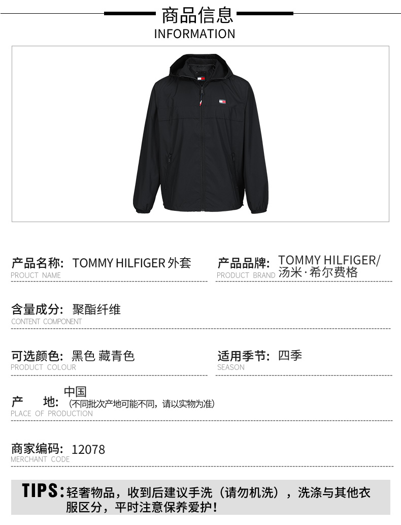 【超惠秒】TOMMY 男士轻薄款连帽夹克外套 12078