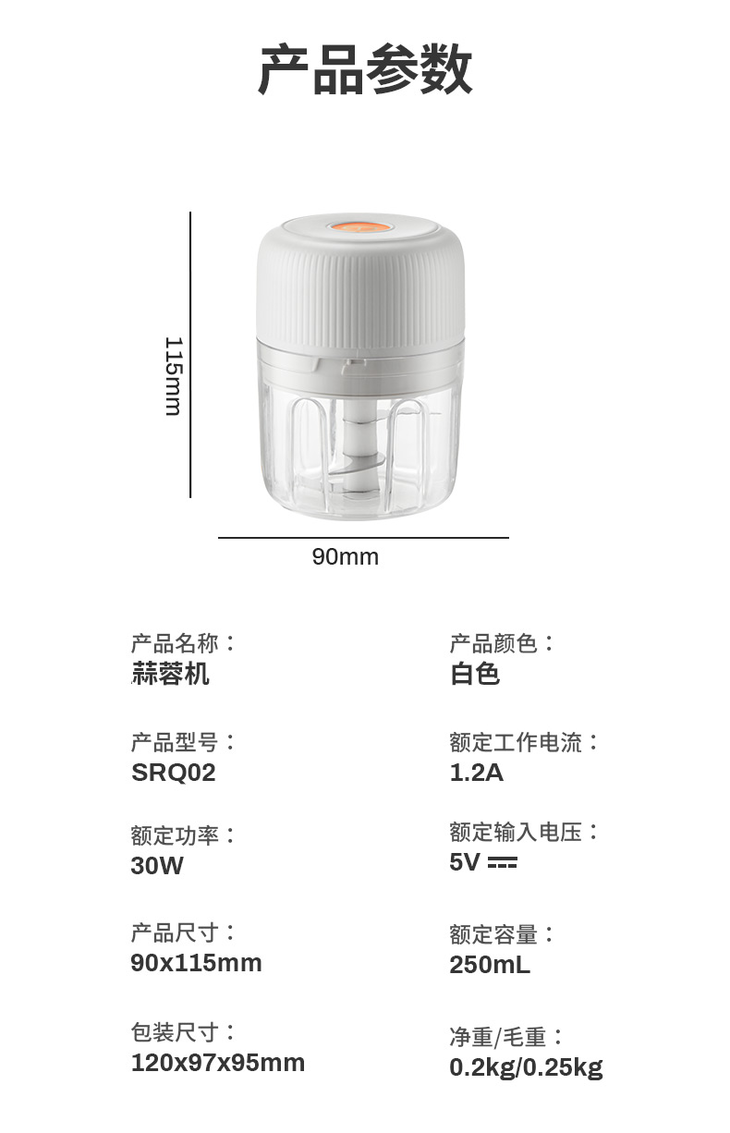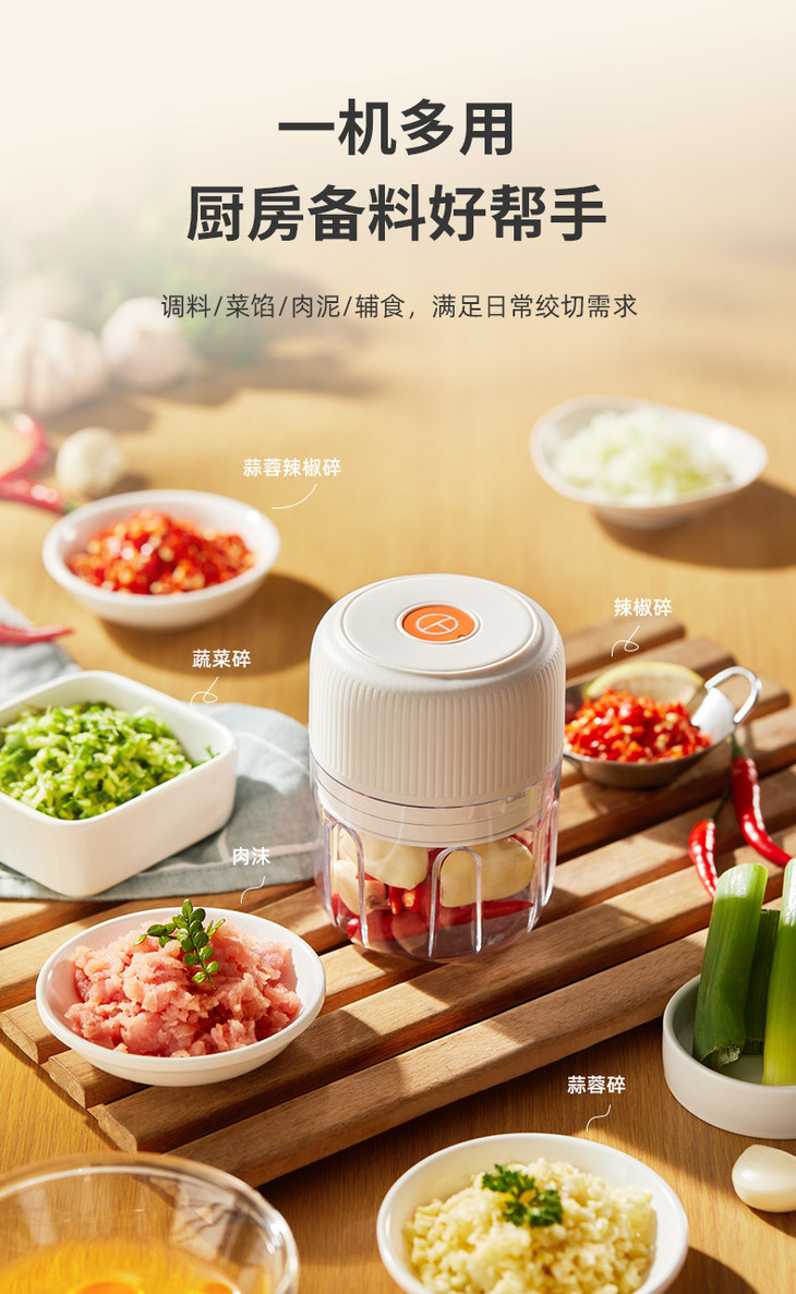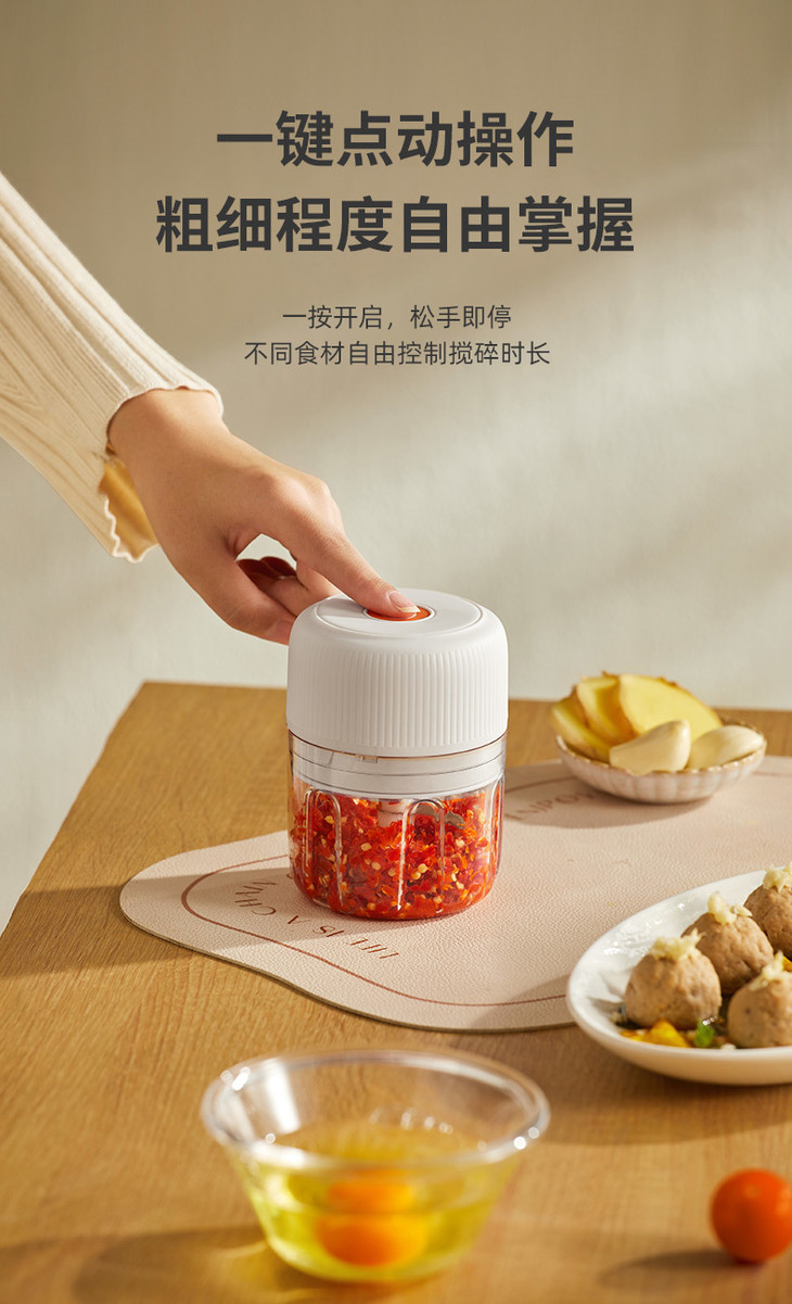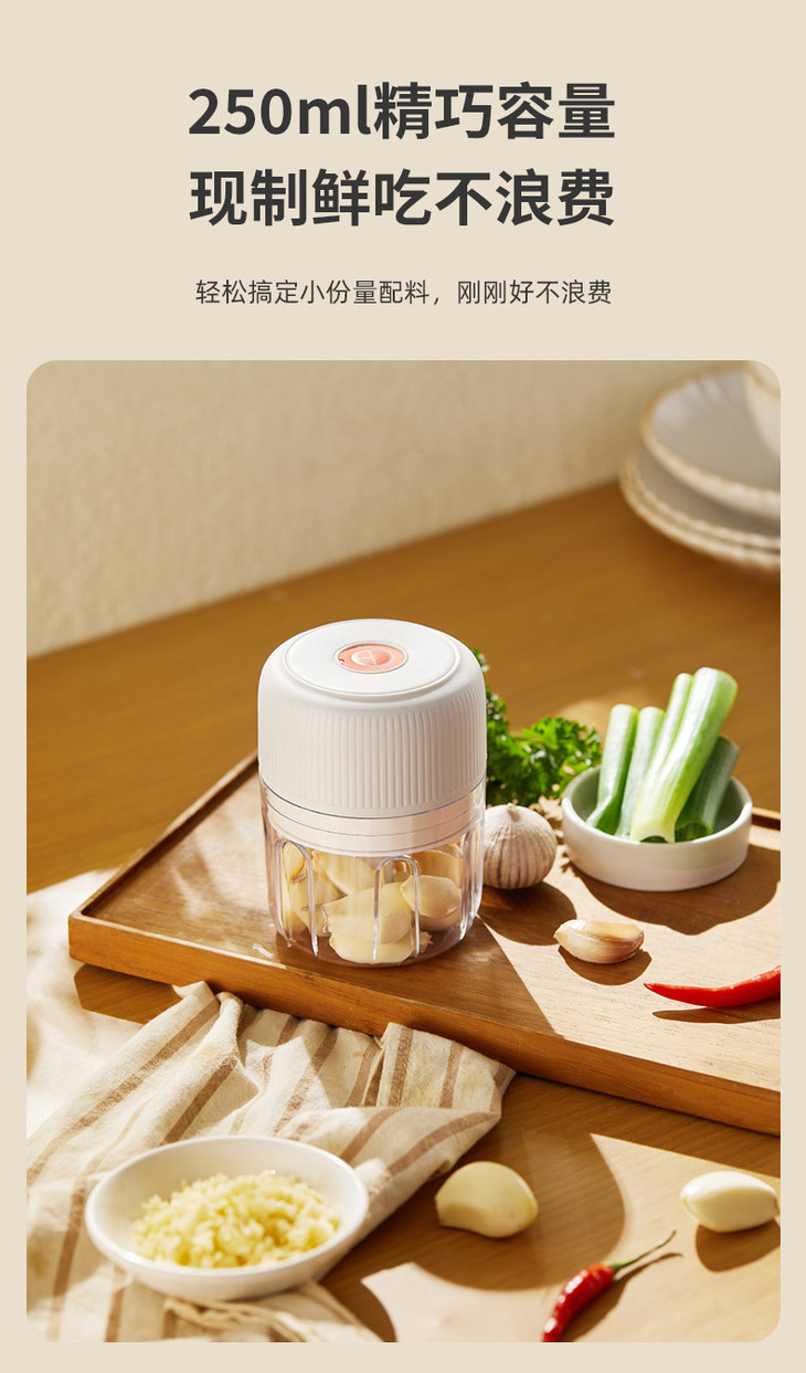 一键点动操作,一按开启, 松手即停,粗细程度自由掌握 250ml容量,轻松搞定小份量配料,新鲜不浪费