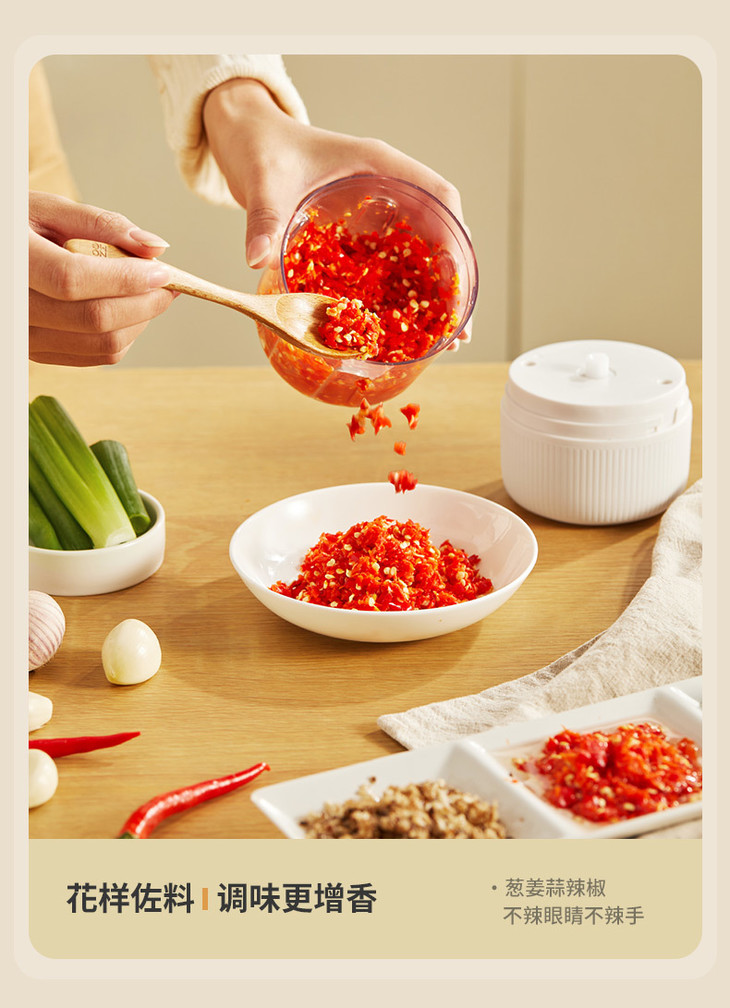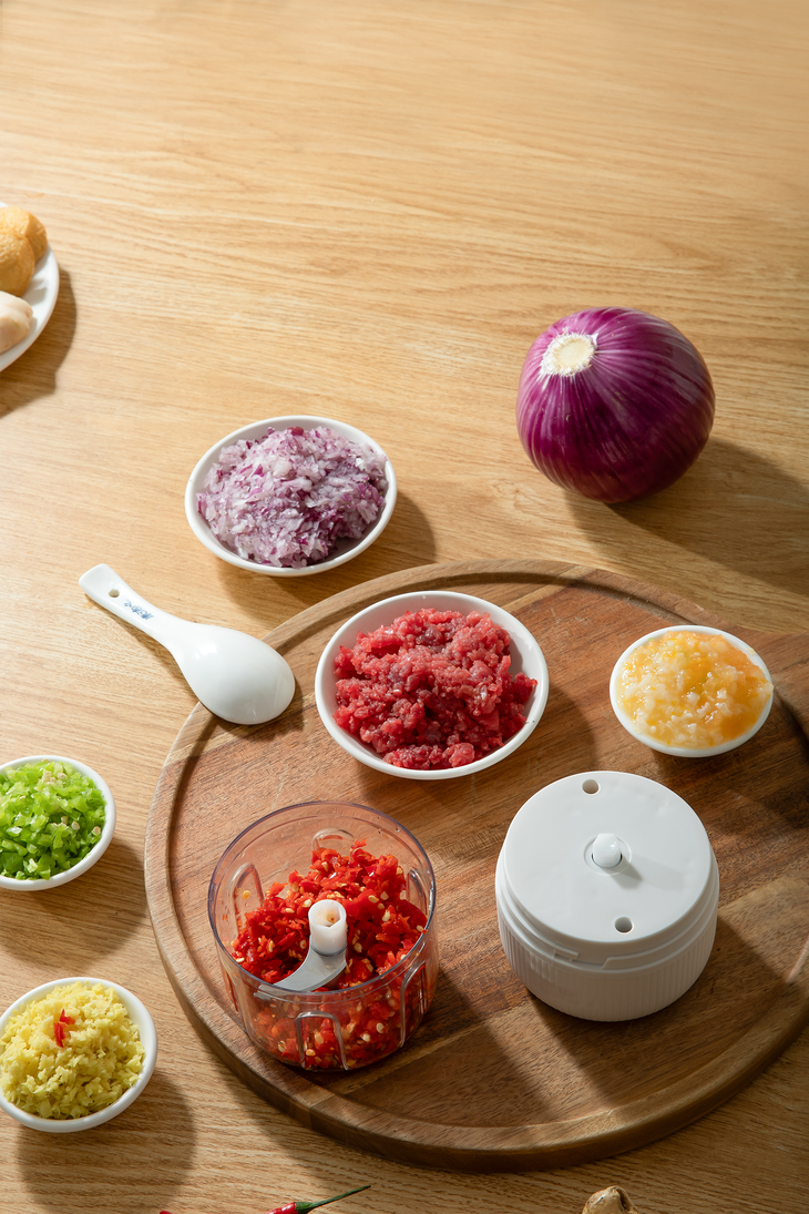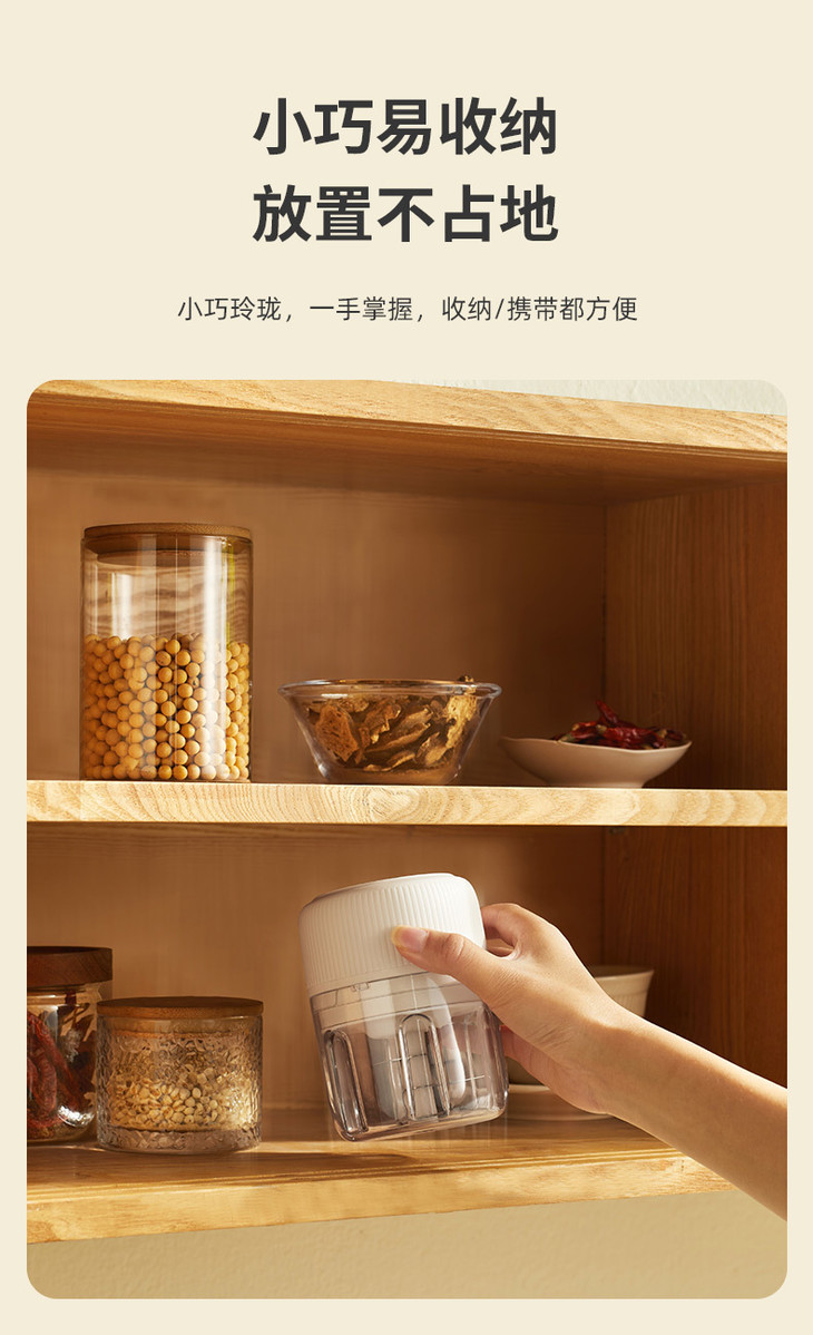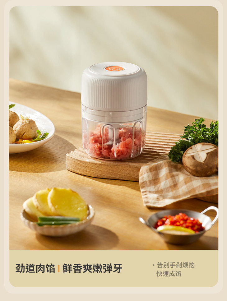 一键点动操作,一按开启, 松手即停,粗细程度自由掌握 250ml容量,轻松搞定小份量配料,新鲜不浪费