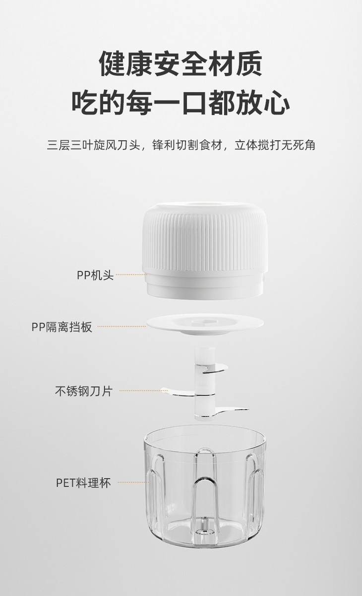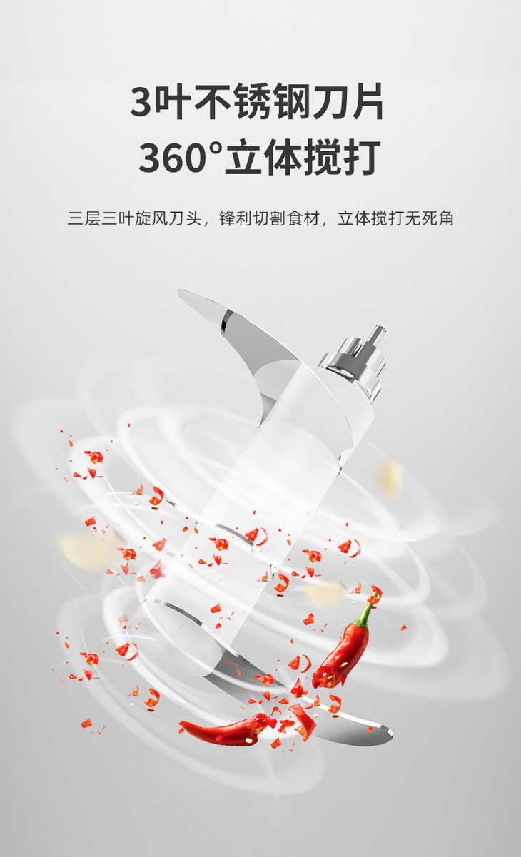 3层3叶立体刀头,不锈钢材质,锋利切割食材 30W强劲动力,1100r/min快速搅打,出料均匀细腻