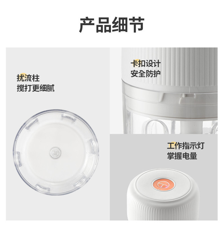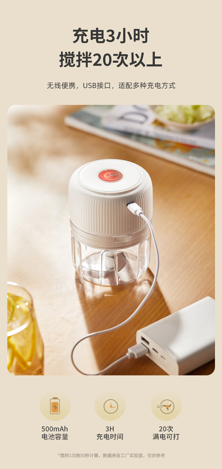 500mAh电池容量, 充电3小时、搅拌20次以上,长效续航 无线便携,usb充电线,适配多种充电方式
