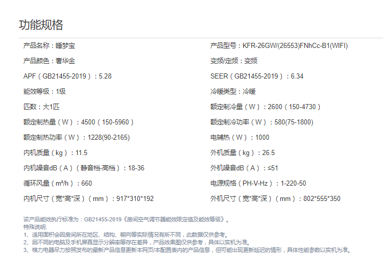 格力/睡梦宝变频冷暖大1匹1级能效挂机空调 KFR-26GW/(26553)FNhCe-B1(WIFI)(含管)