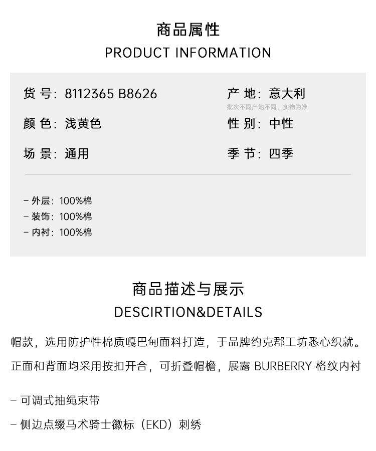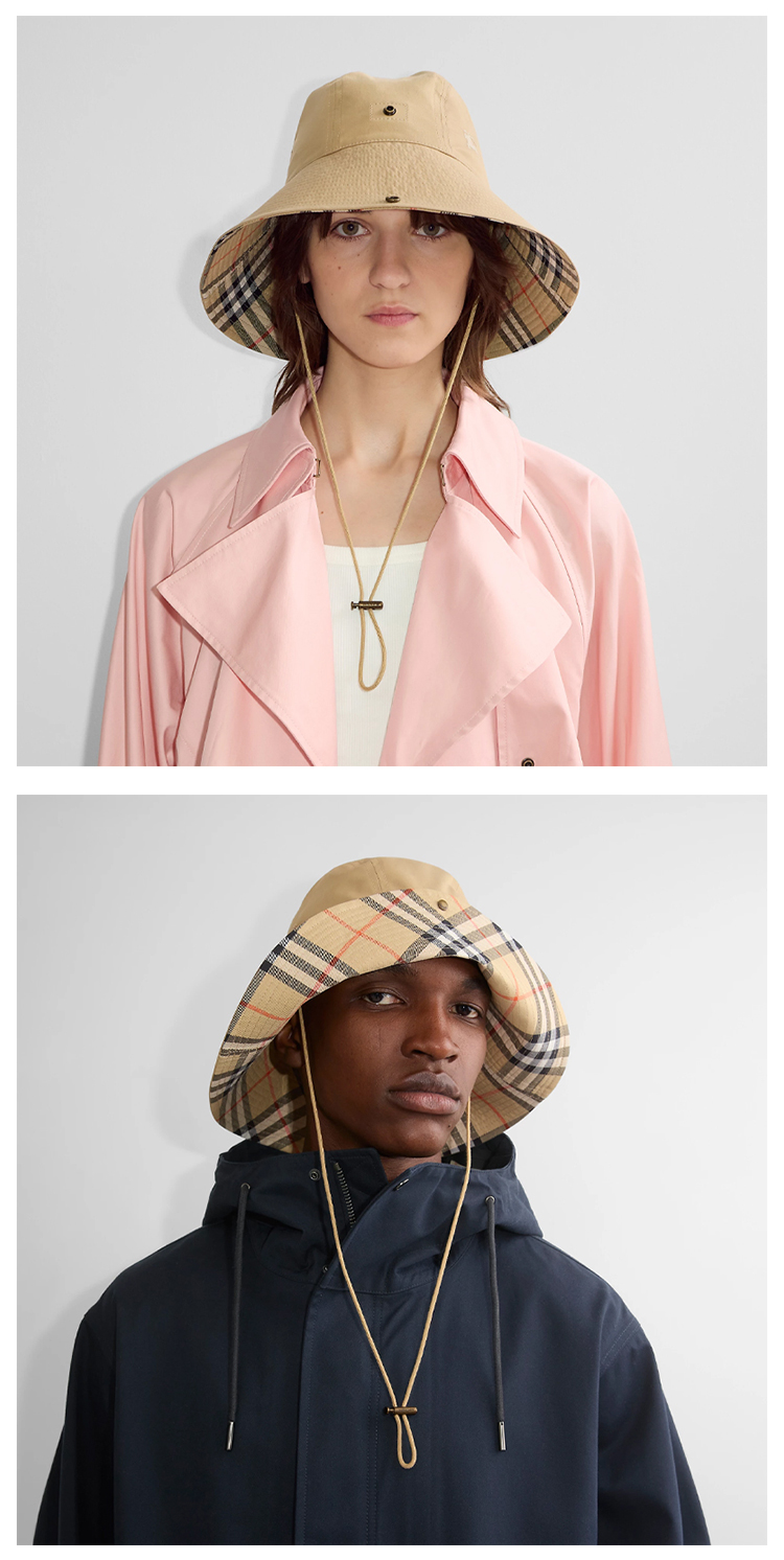 BURBERRY 巴宝莉 男女同款马术骑士徽标格纹帽檐嘎巴甸渔夫帽 浅黄色 8112365 B8626