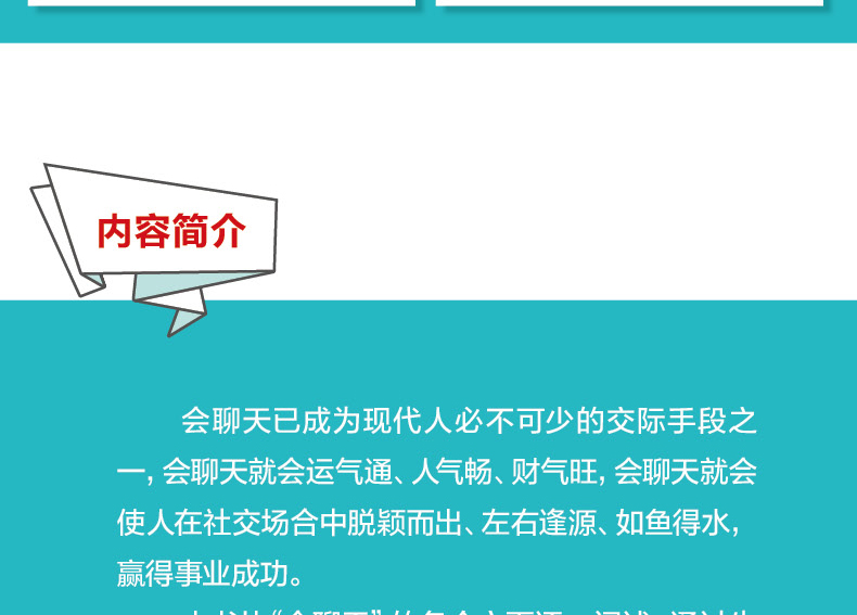 会聊天已成为现代人必不可少的交际手段之一,会聊天就会运气通、人气畅、财气旺,会聊天就会使人在场合中脱颖而出、左右逢源、如鱼得水,赢得事业成功。