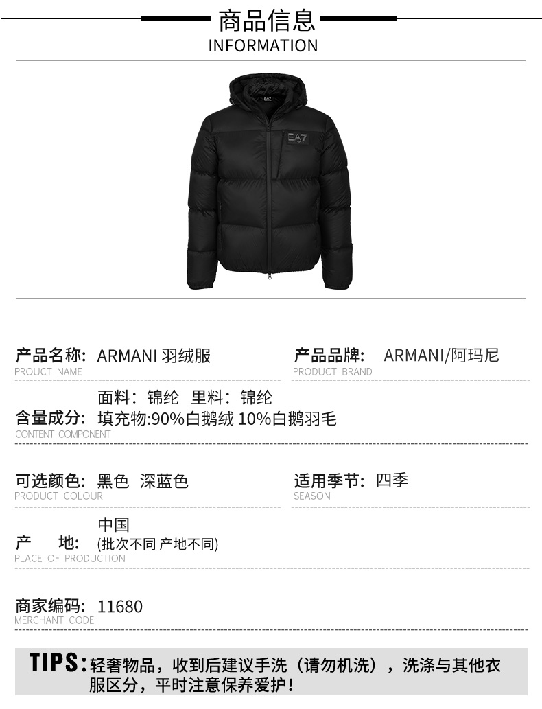 【超惠秒】Armani EA7 阿玛尼 男士 90白鹅绒 运动连帽羽绒服外套 11680