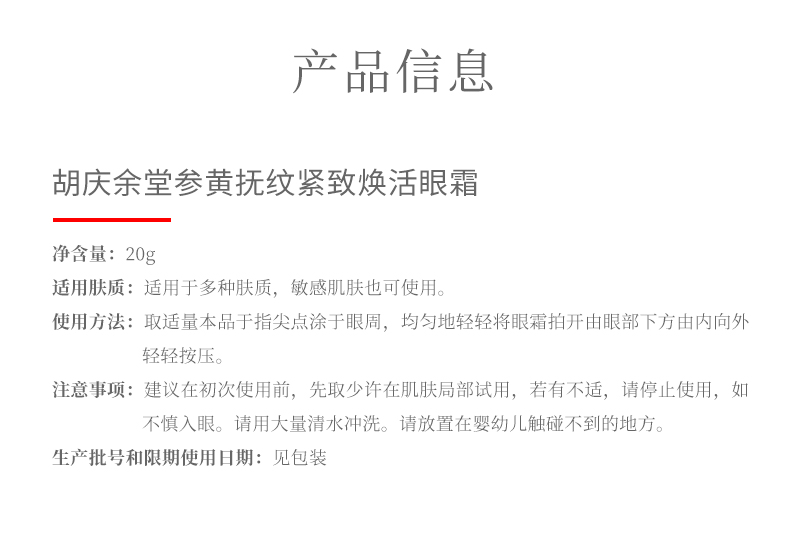 胡庆余堂参黄抚纹紧致焕活眼霜眼周补水保湿眼眸眼霜 A-3172