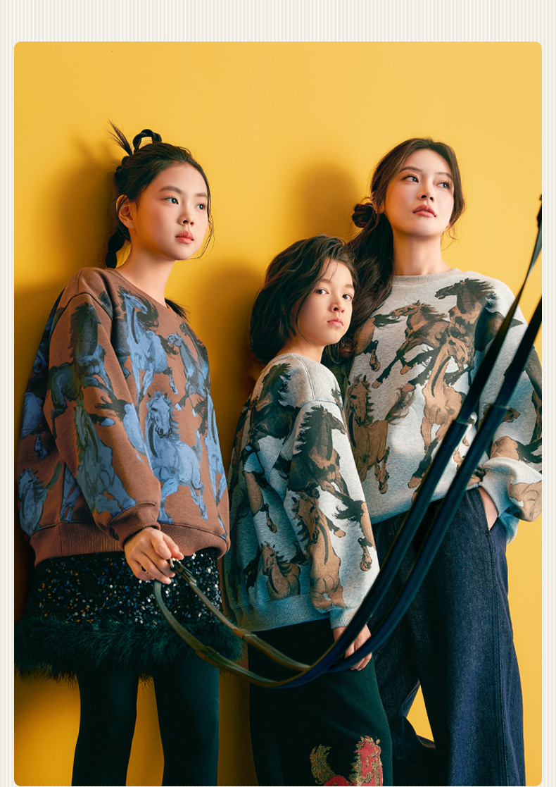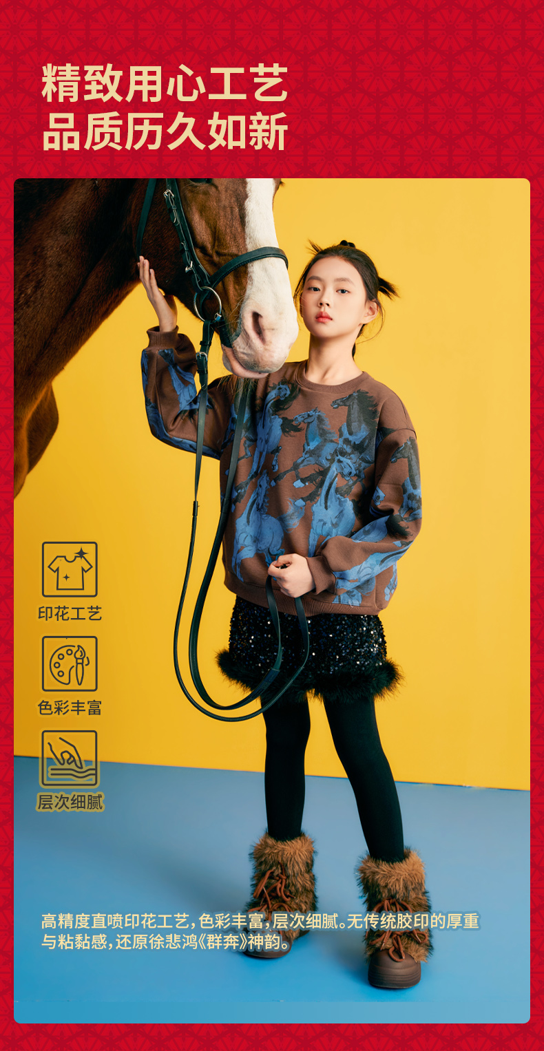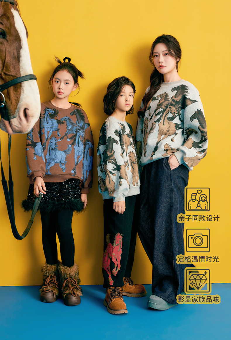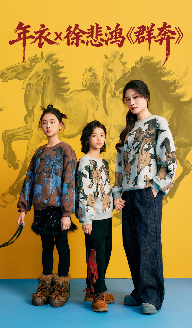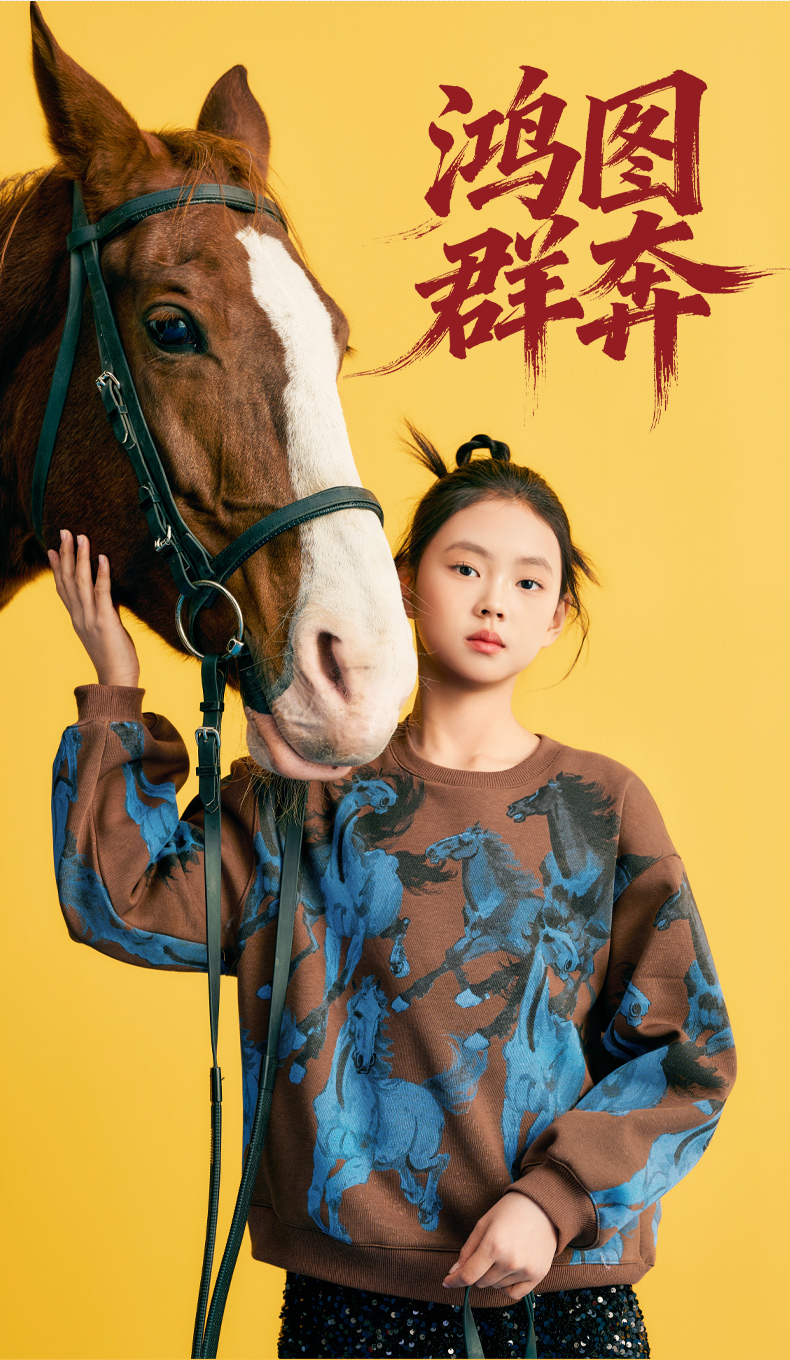 徐悲鸿联名年衣童装儿童加绒卫衣冬款男女童亲子装鸿图群奔加绒卫衣
