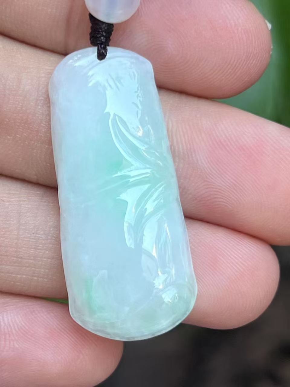 这一手是白底青的料子,也是我们几千件翡翠中唯一的欧白底青。白底青是一种以白色为底色,带有绿色的翡翠。千金难买一抹绿,白底青要的就是这一抹绿,非常吸睛~