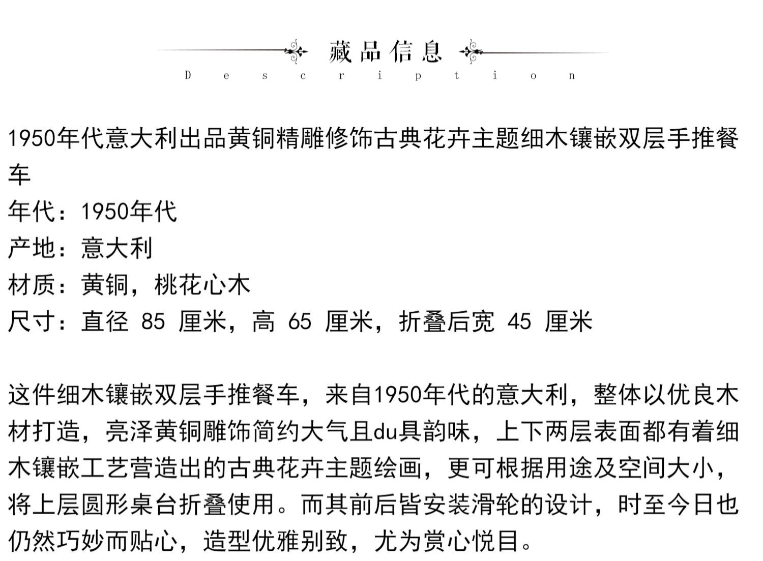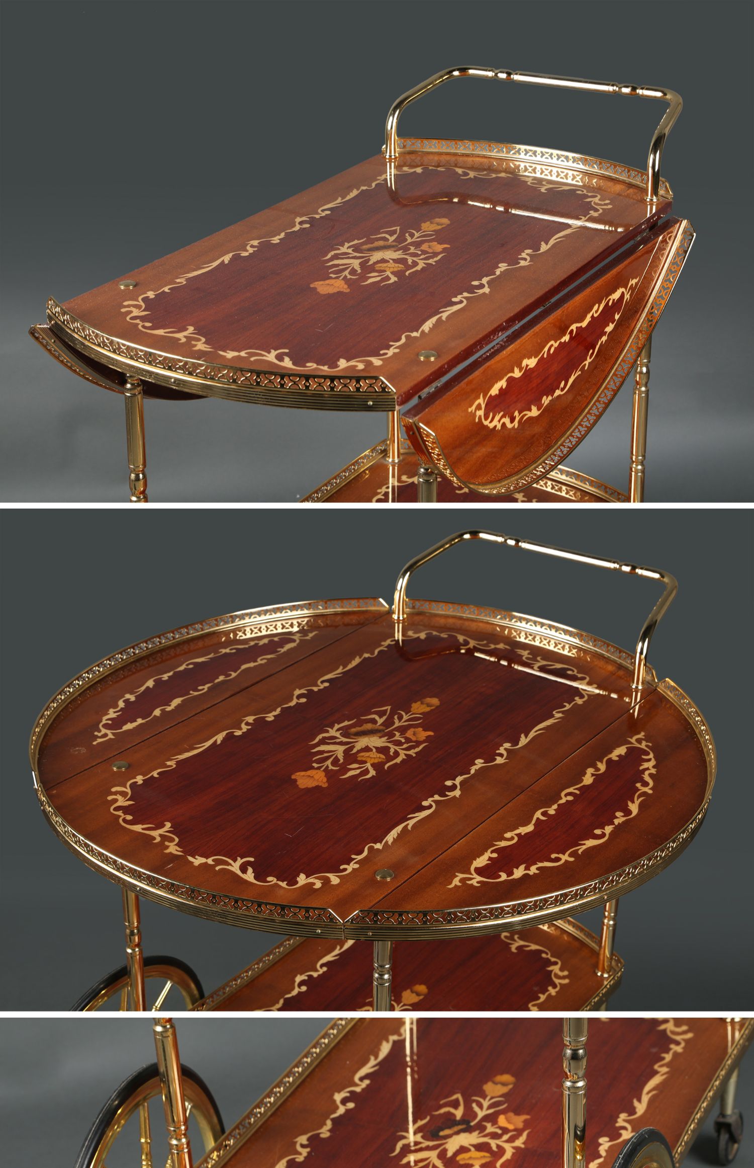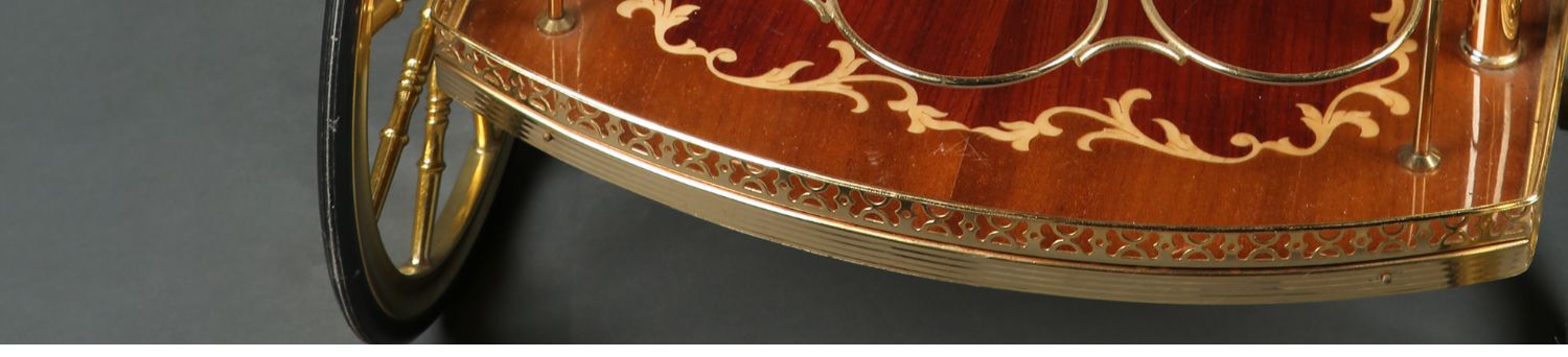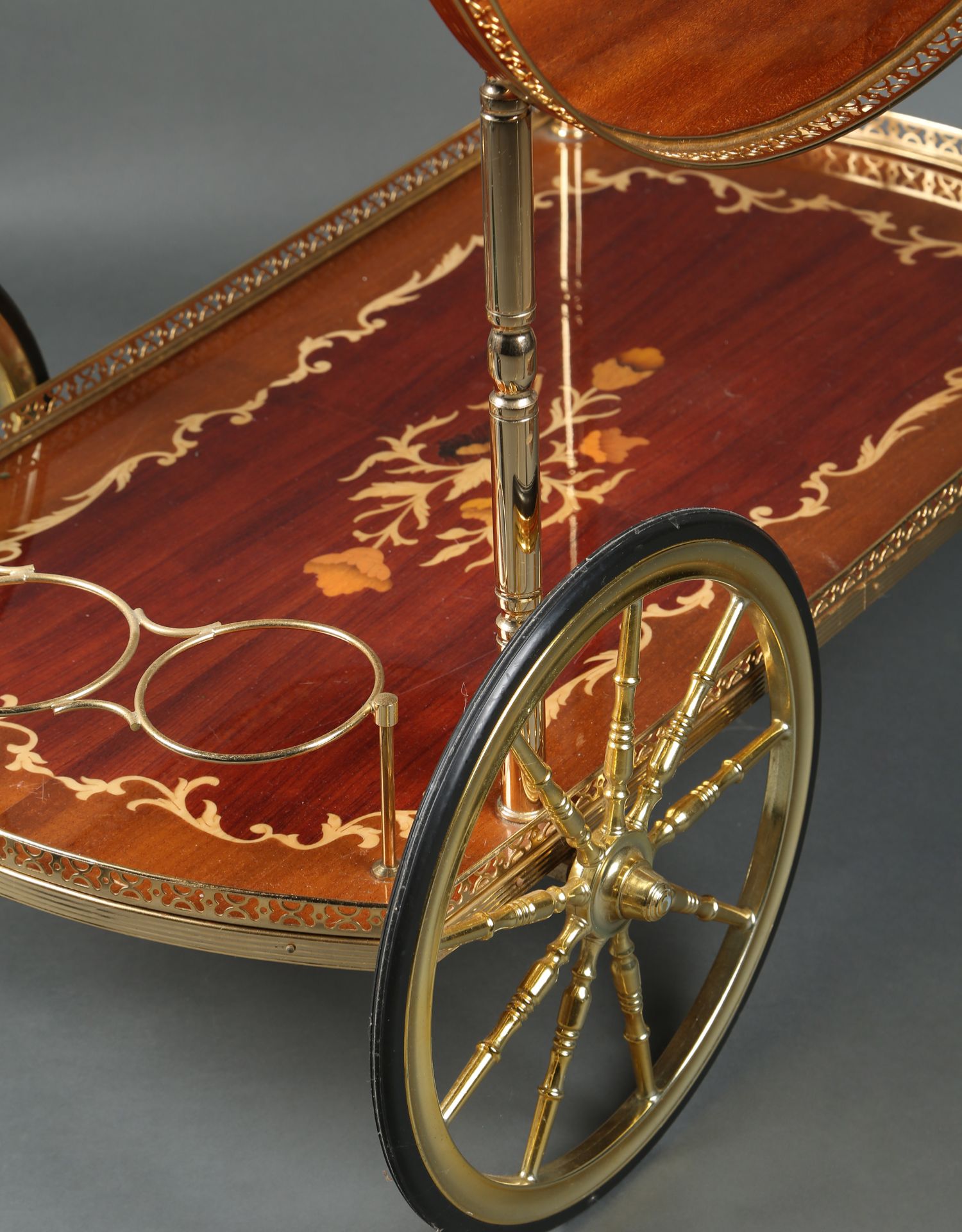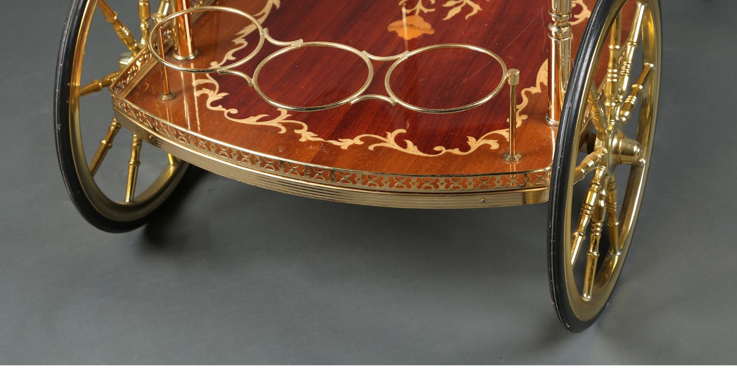 独角鹿西洋古董意大利黄铜精雕古典花卉细木镶嵌双层手推餐车