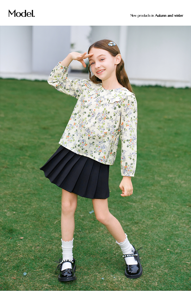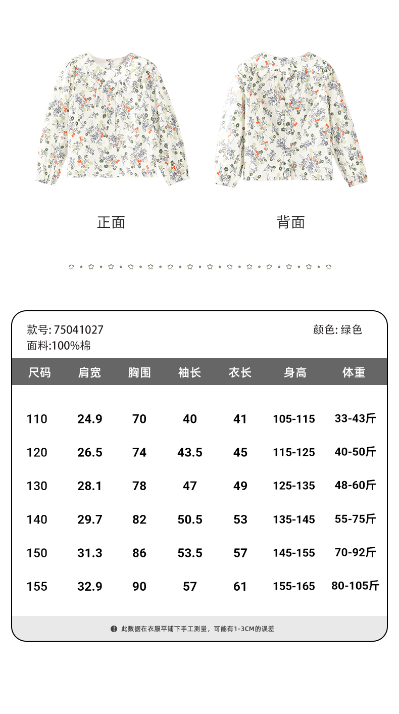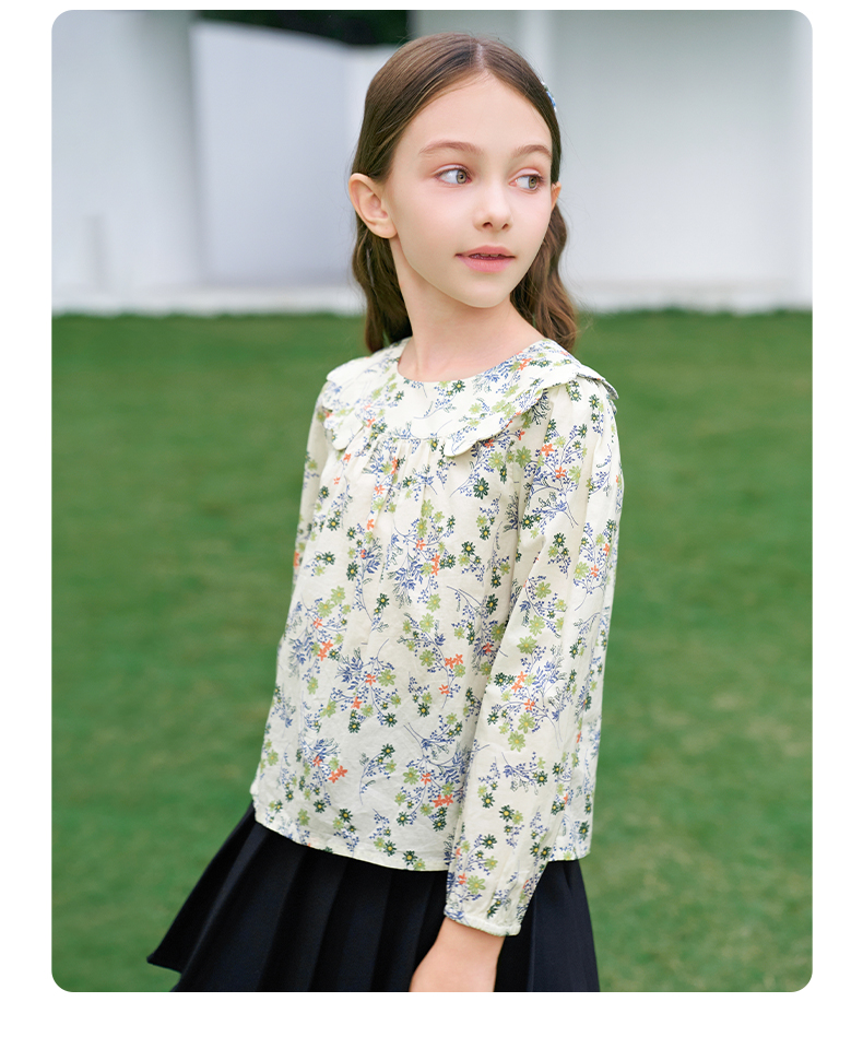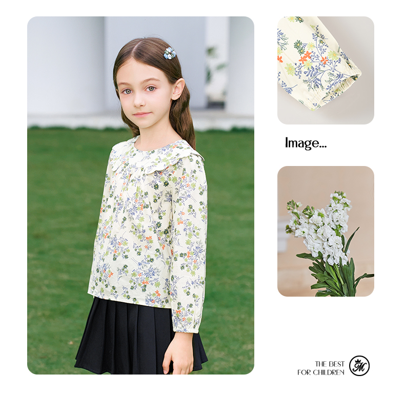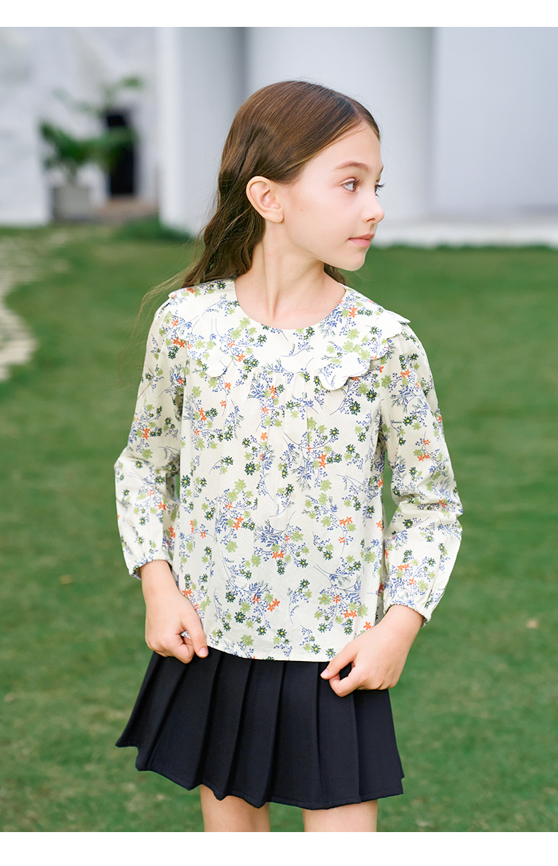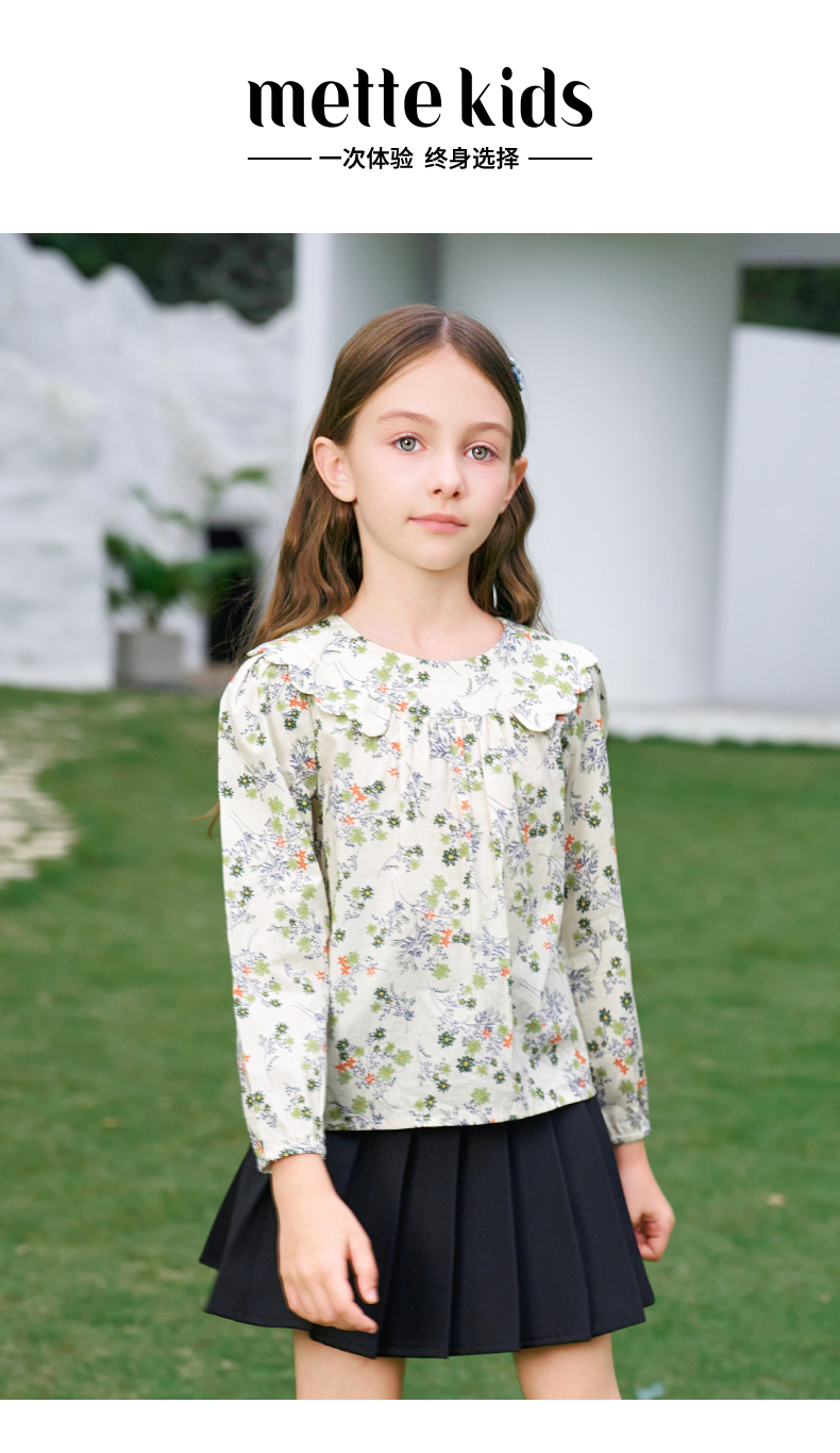 mettekids女童衬衫2024春夏清新绿色碎花上衣童装儿童纯棉衬衣
