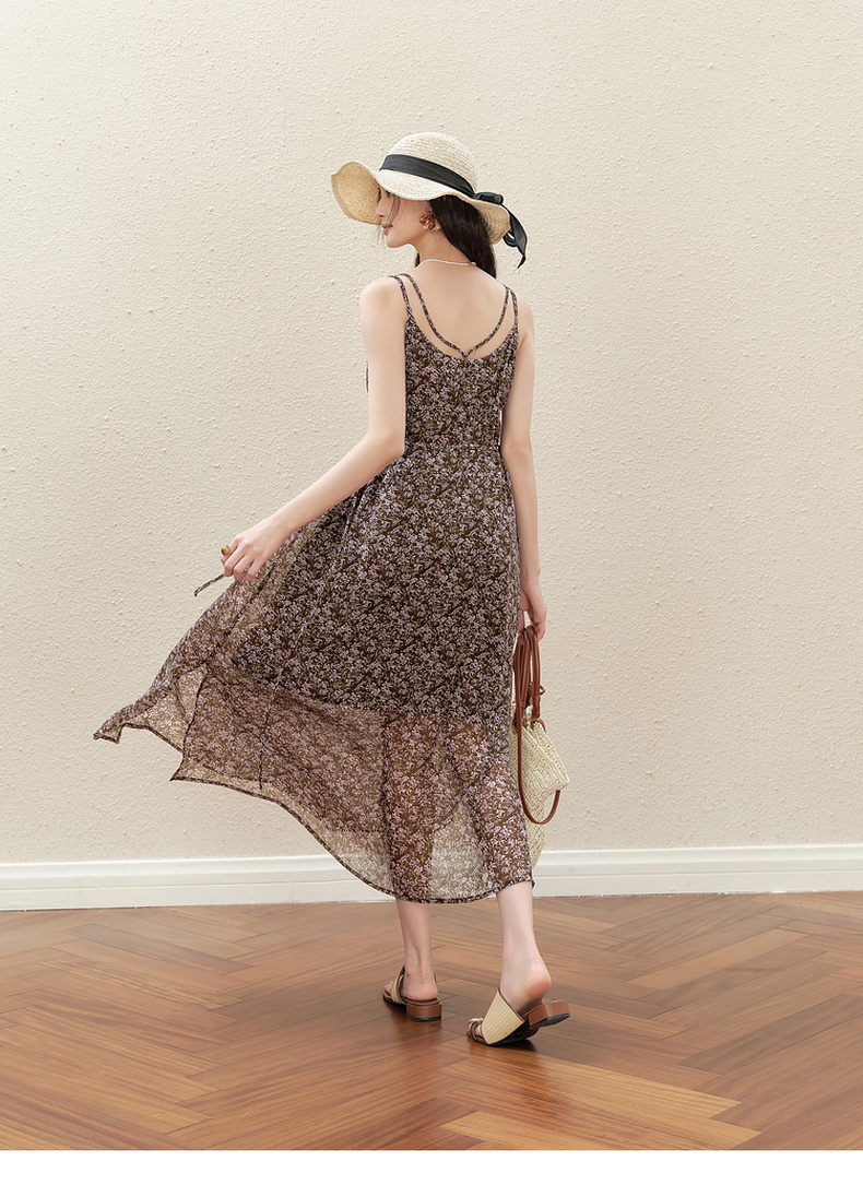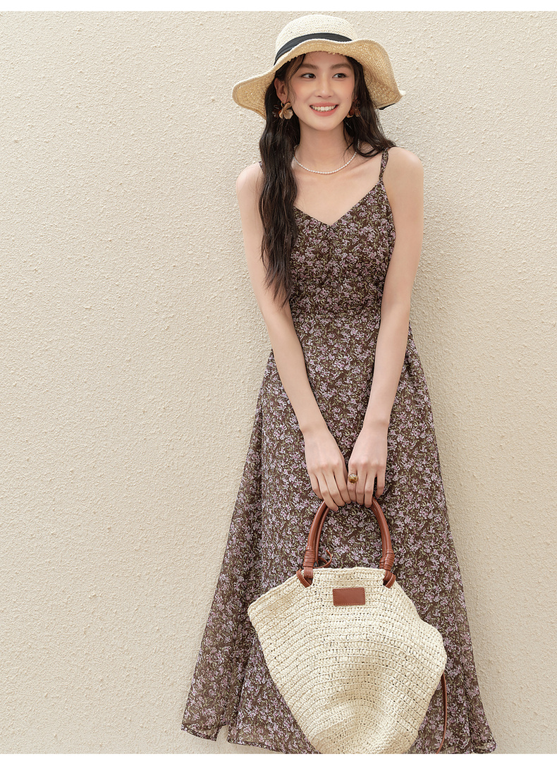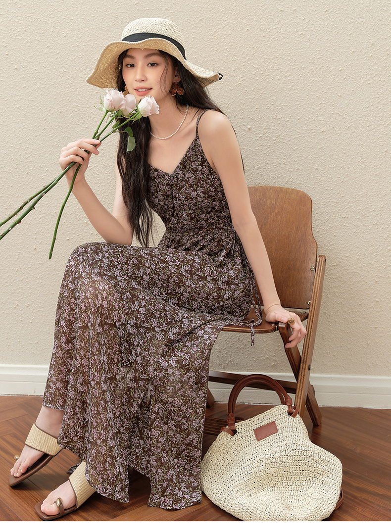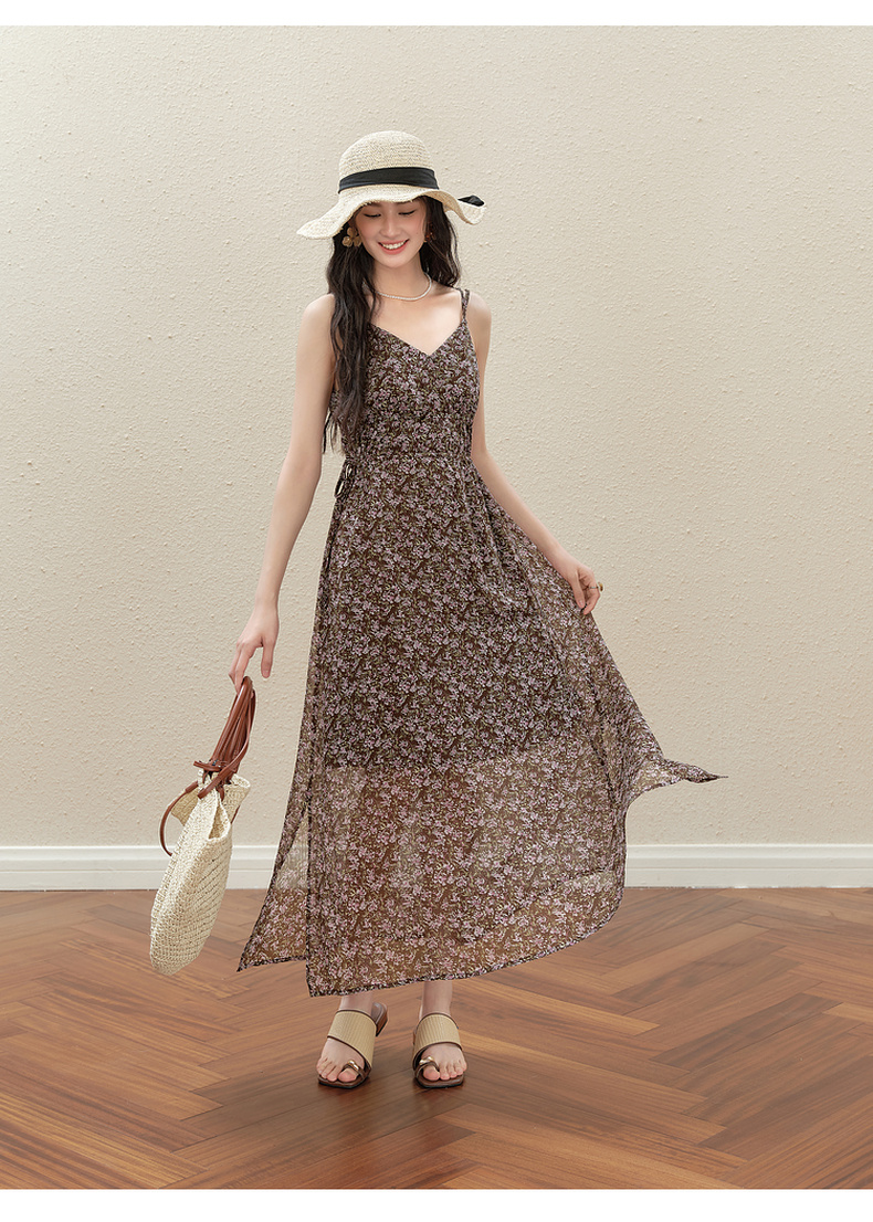 【严选】诗凡黎气质碎花吊带连衣裙2025秋新款高腰显瘦修身优雅V领薄长裙7G7390751
