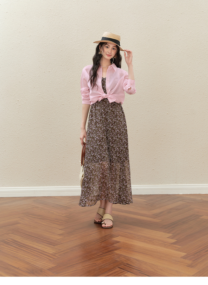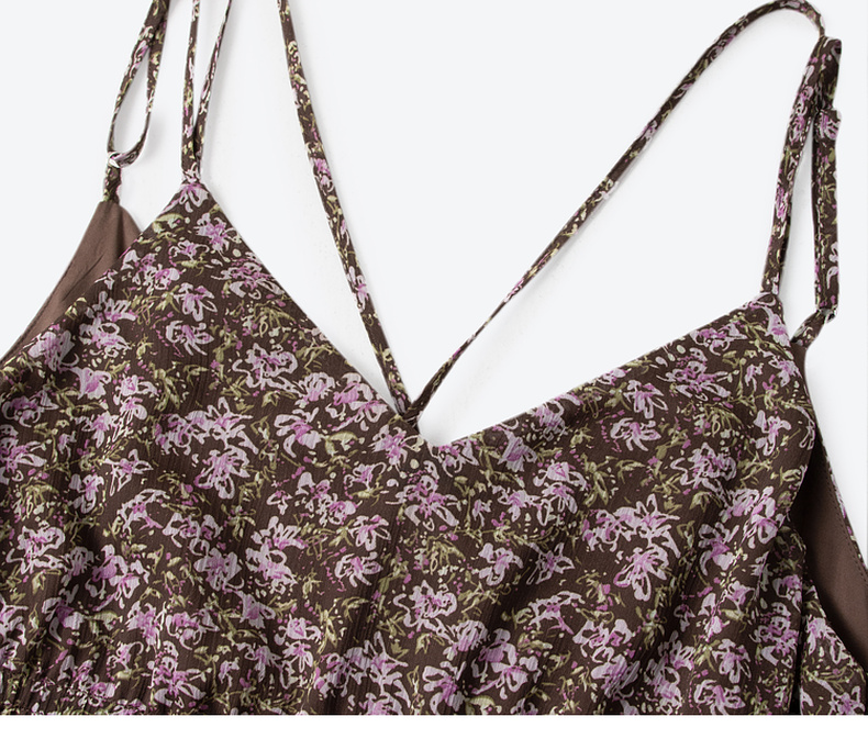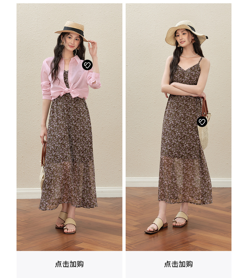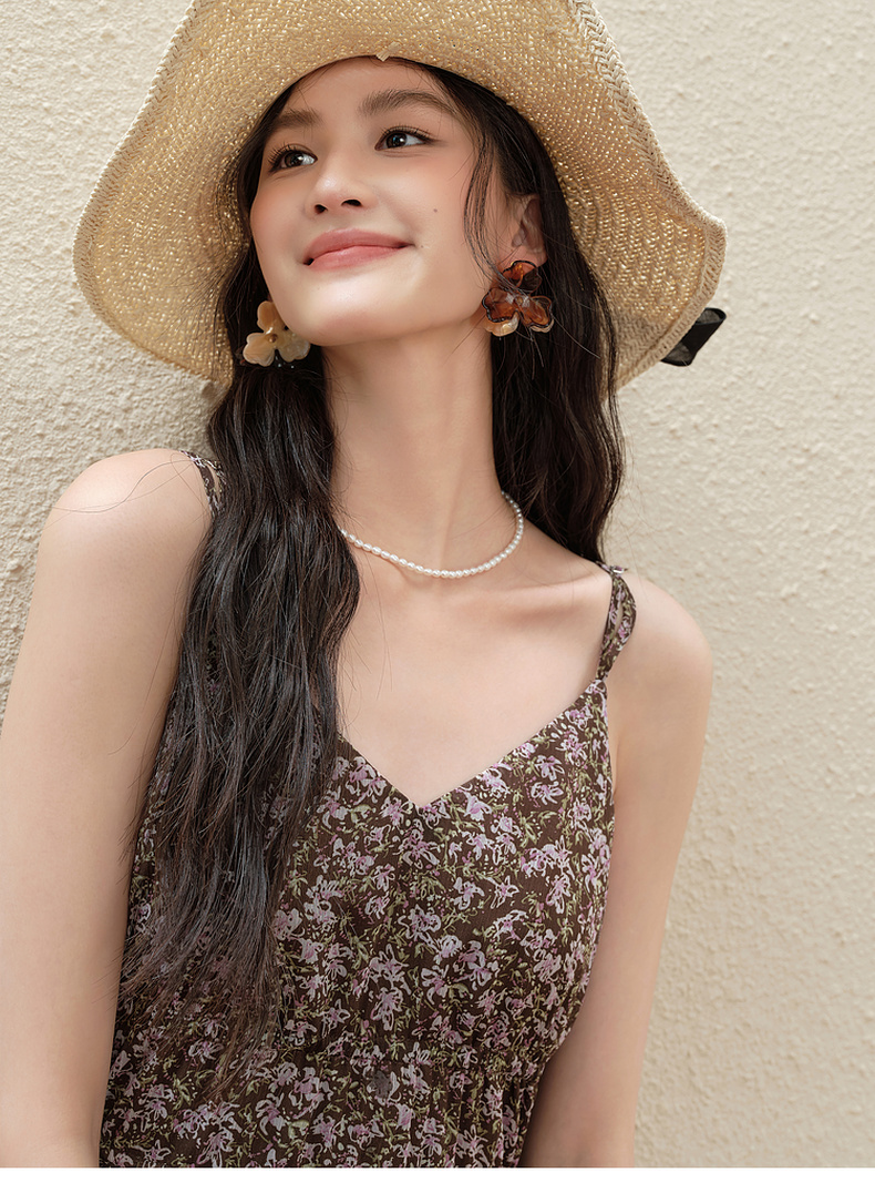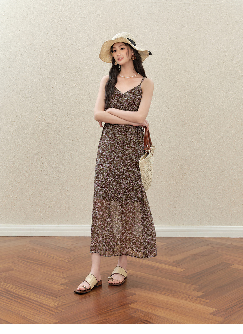 【严选】诗凡黎气质碎花吊带连衣裙2025秋新款高腰显瘦修身优雅V领薄长裙7G7390751