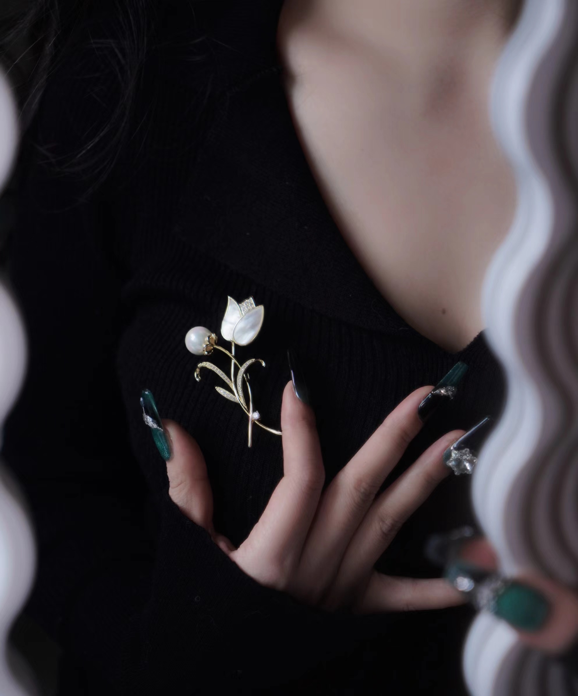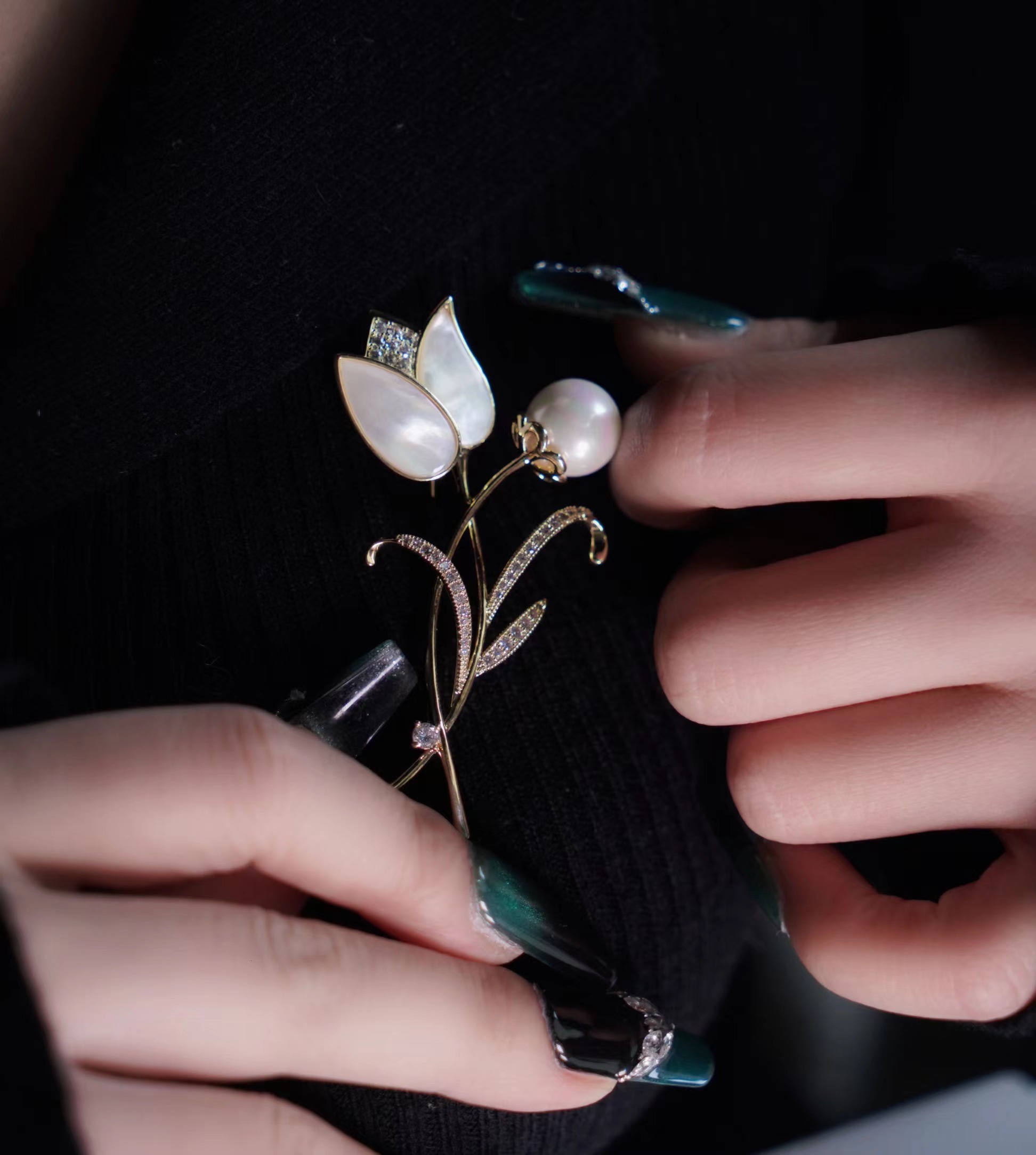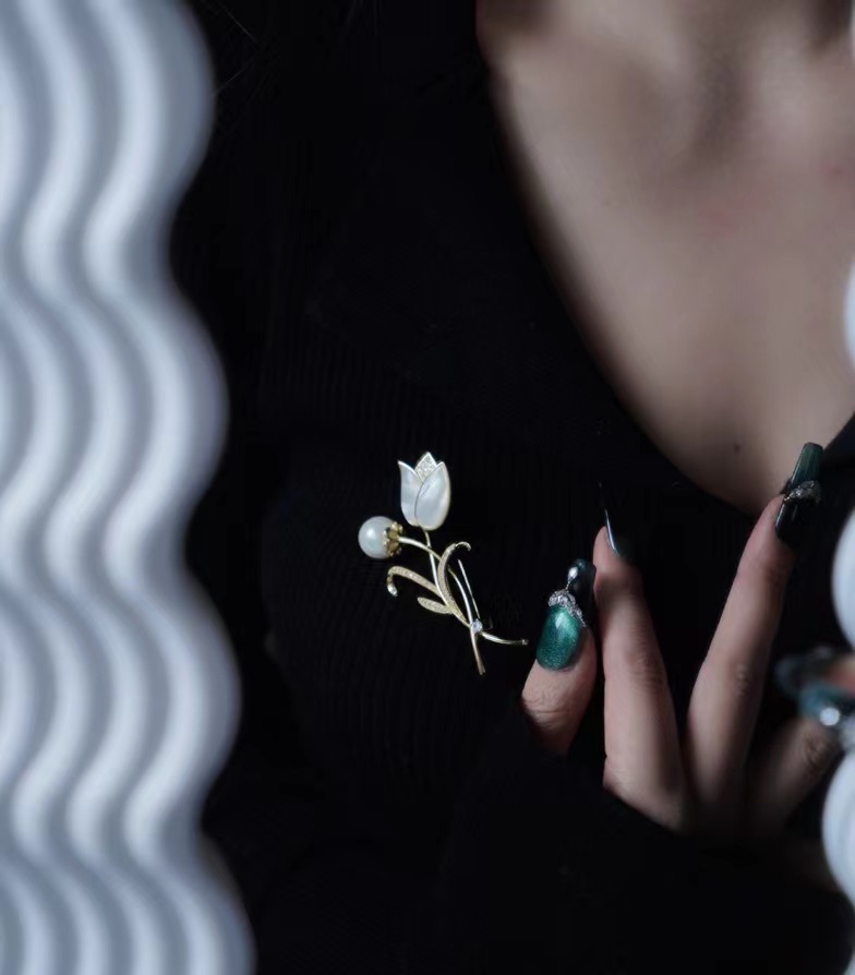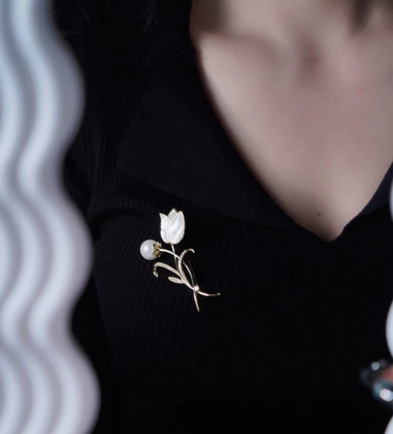 L925银仿珍珠胸针 郁金香轻奢高档时尚精致优雅气质独特