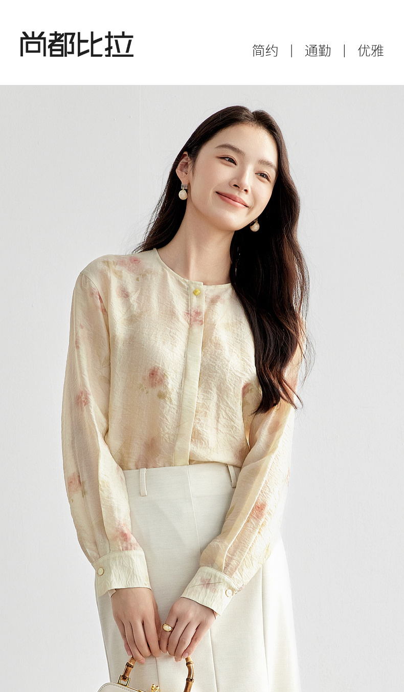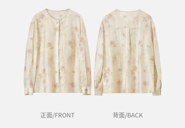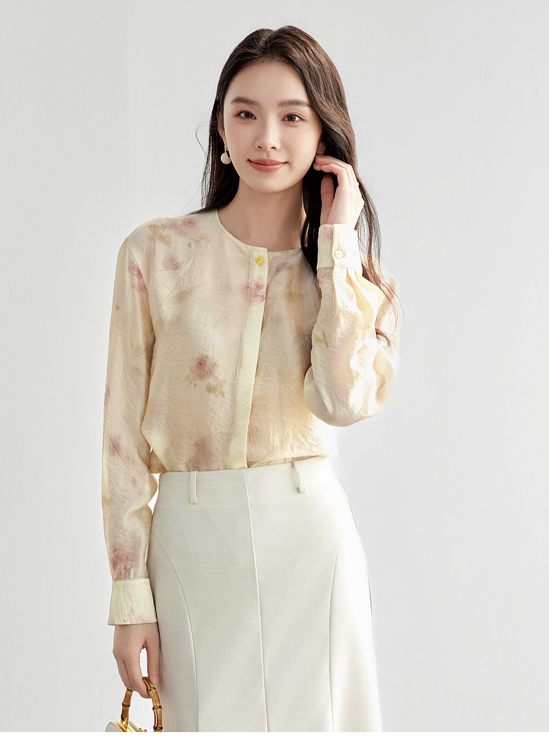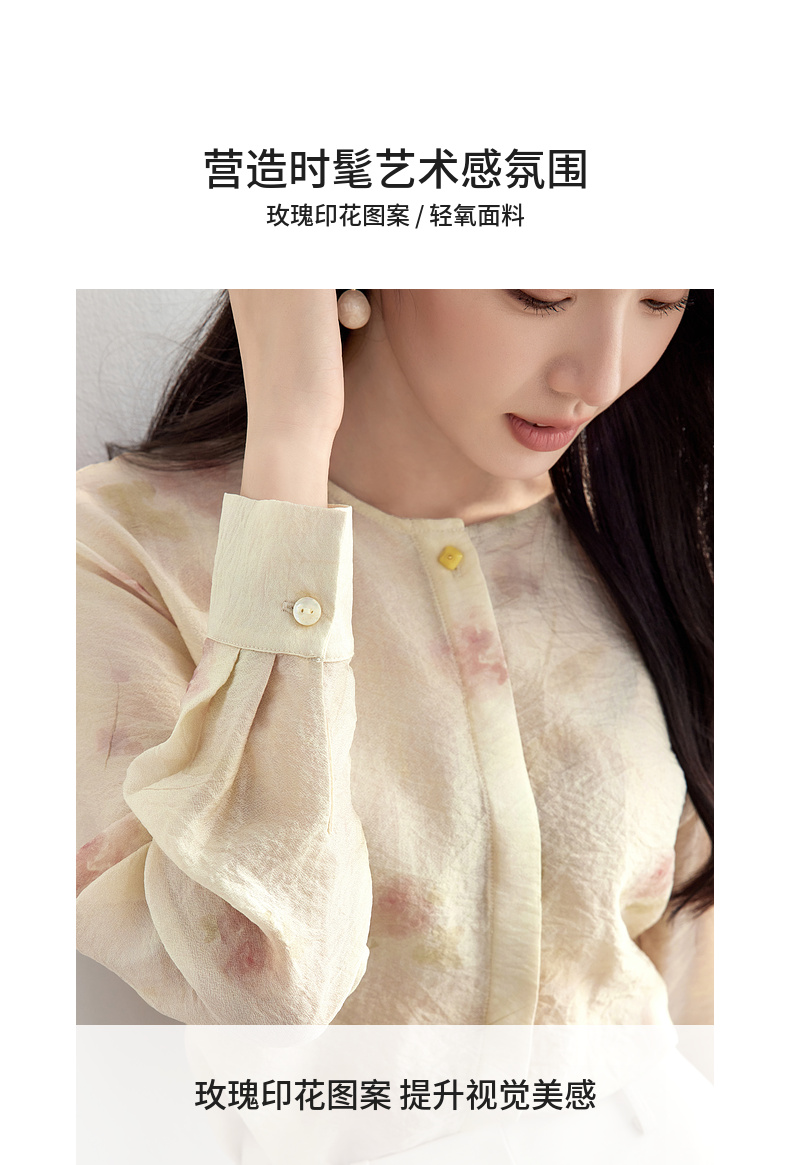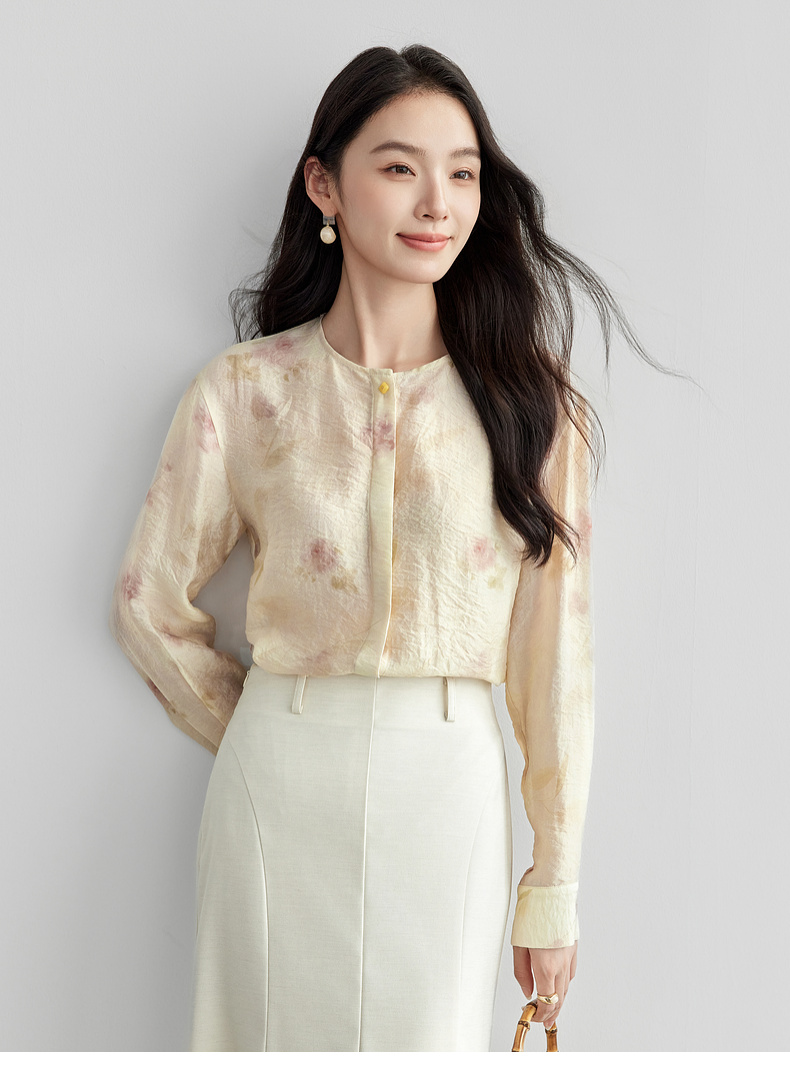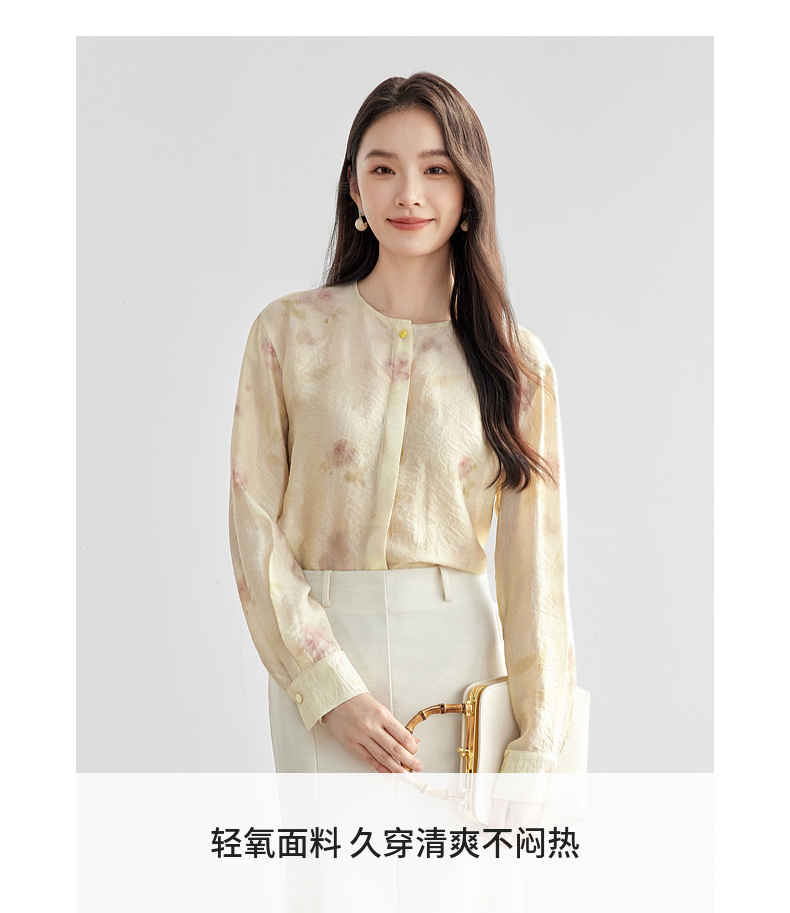 【内购】【轻盈清爽】通勤优雅氛围感圆领暗门襟设计宽松垂感轻氧印花衬衫-151C58032