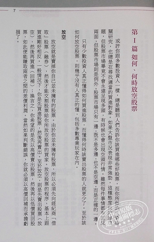 事情都有正反兩面,但股票市場卻是例外。股票市場只有一邊,既不是多邊,也不是空邊,而是正確的一邊。在某些市場狀況下,放空可讓你站到正確的那一邊,但你必須具備知識與技巧,還需要有勇氣建立空頭部位。