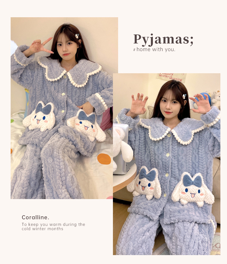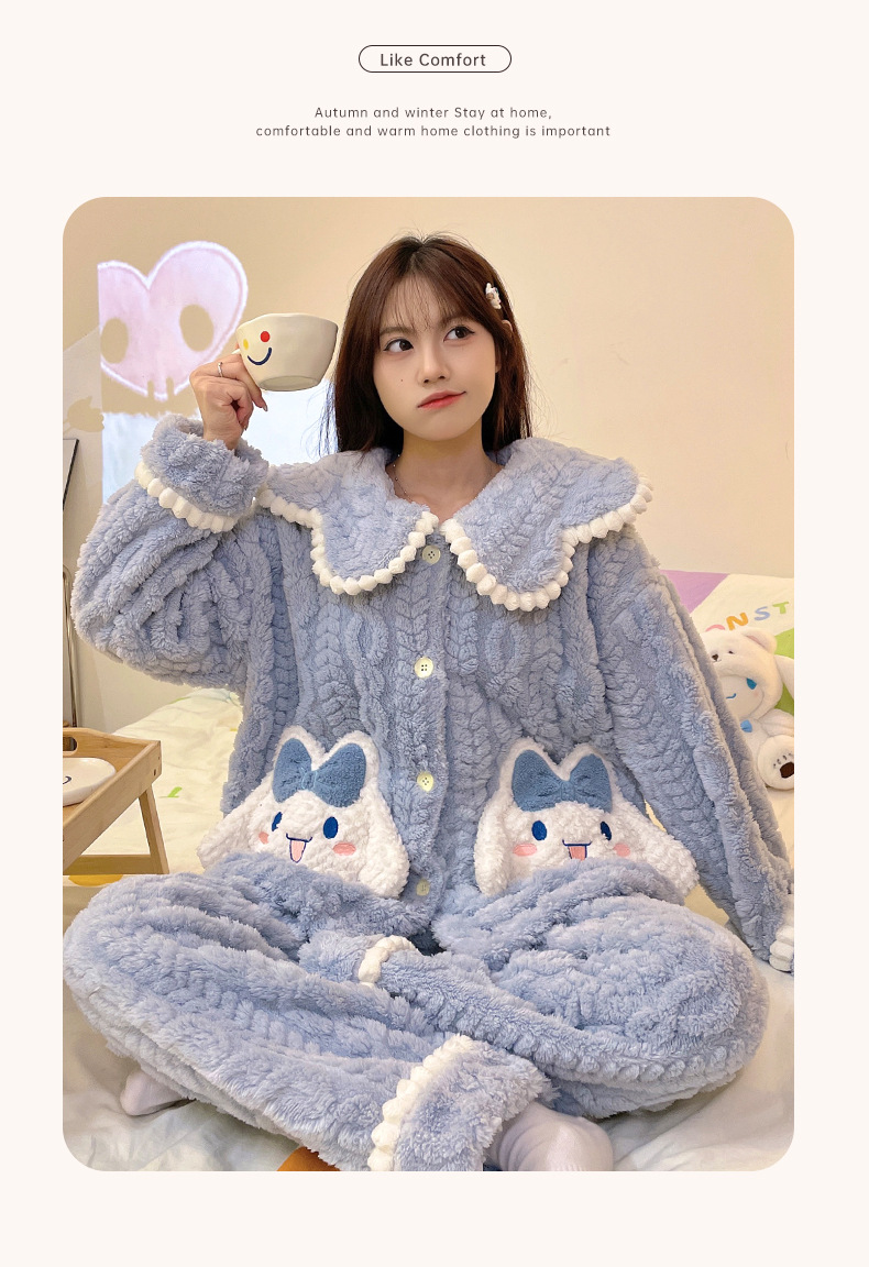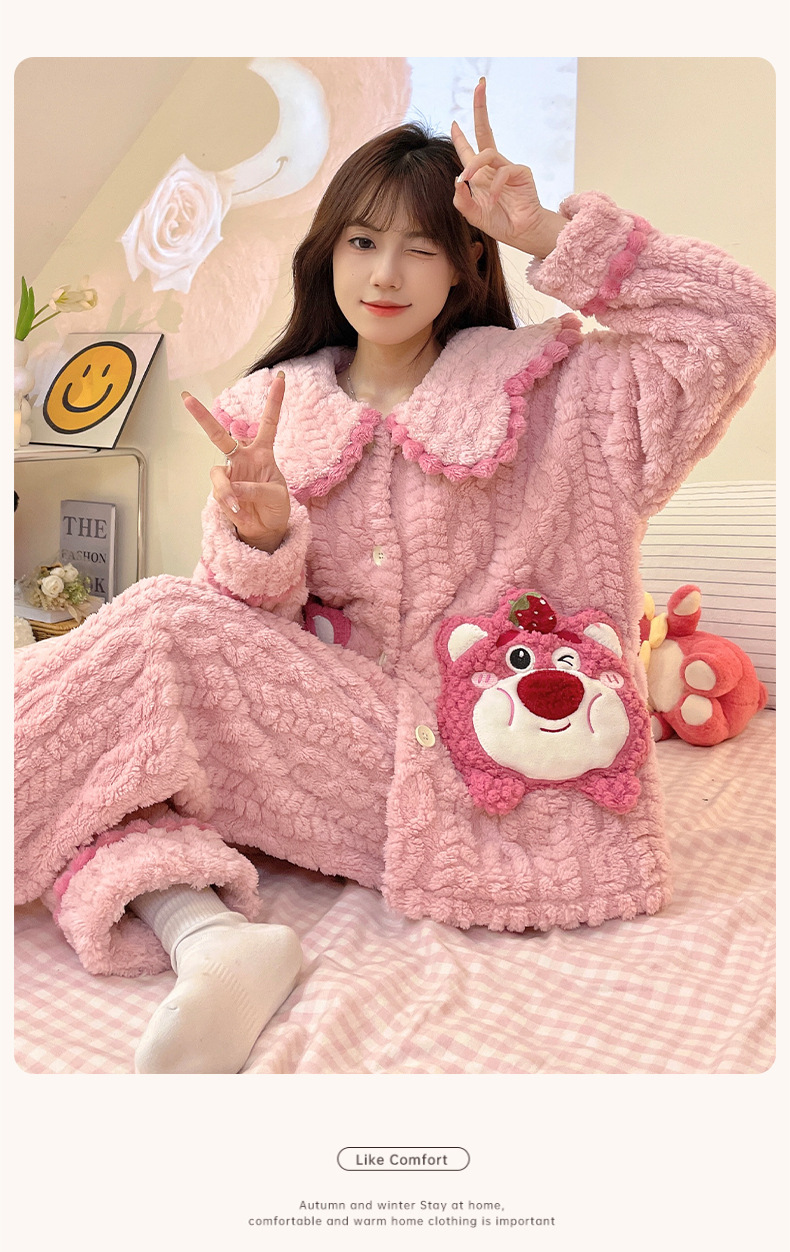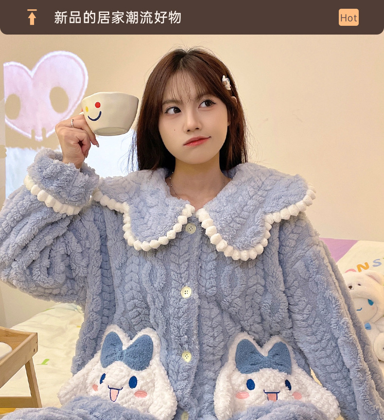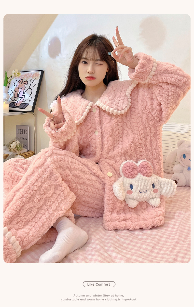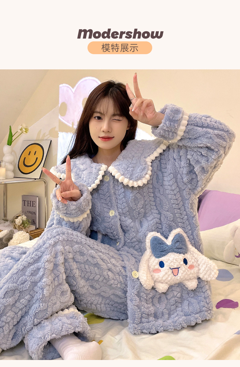 冬季新款【睡衣女珊瑚绒】卡通可爱娃娃领 秋冬天加厚加绒保暖法兰绒家居服套装