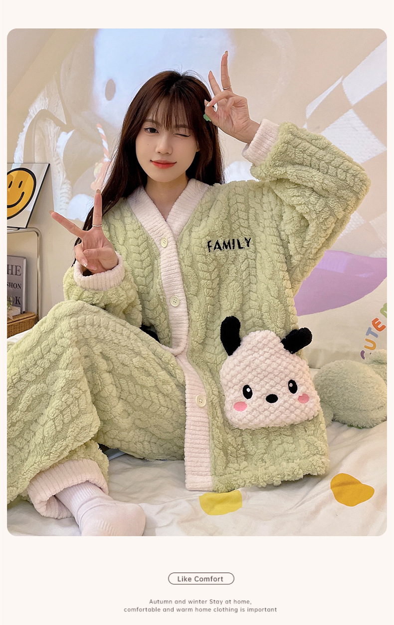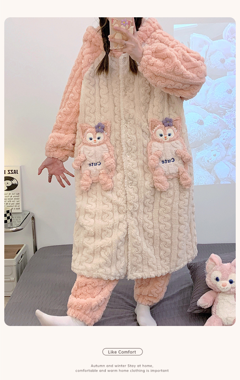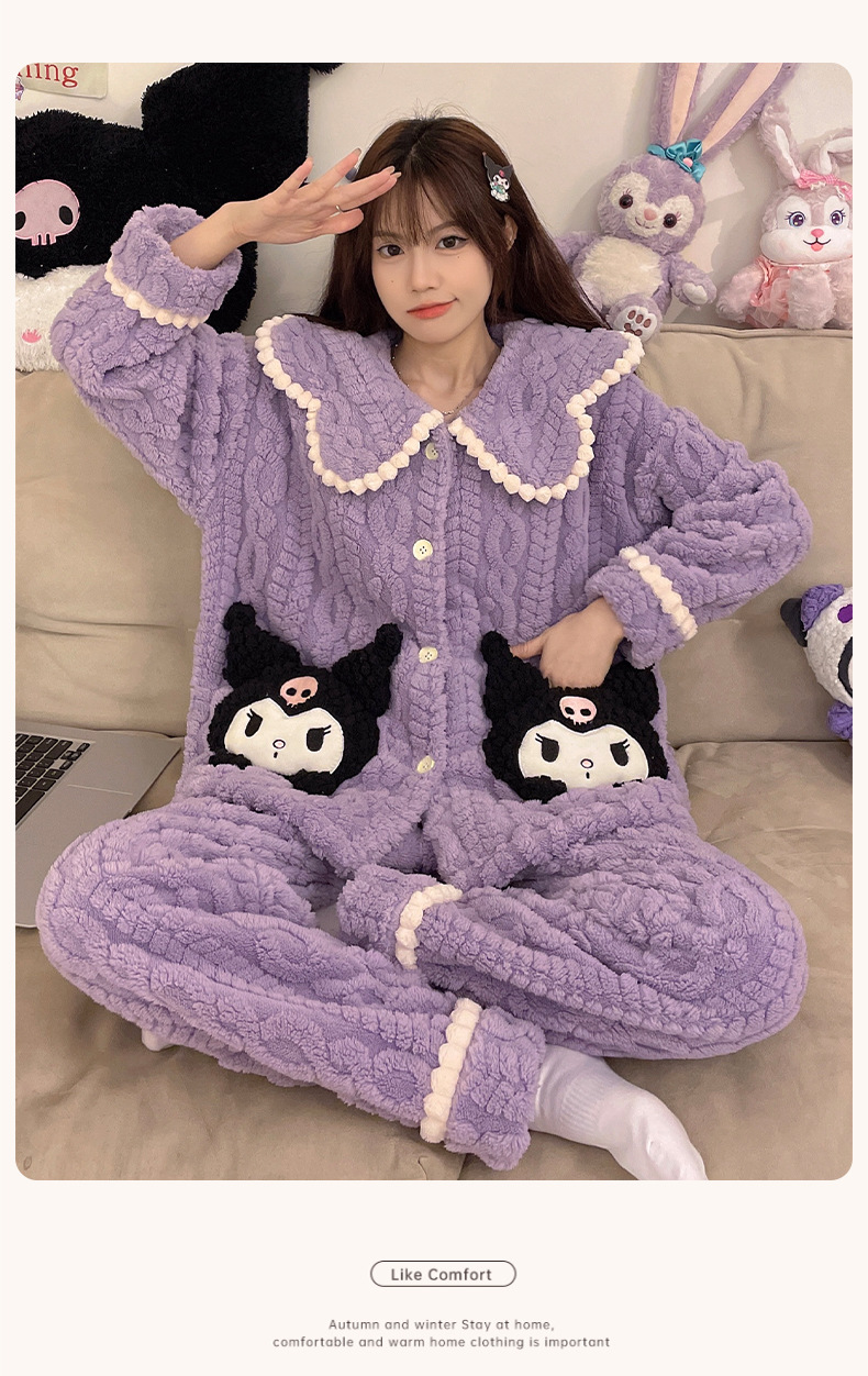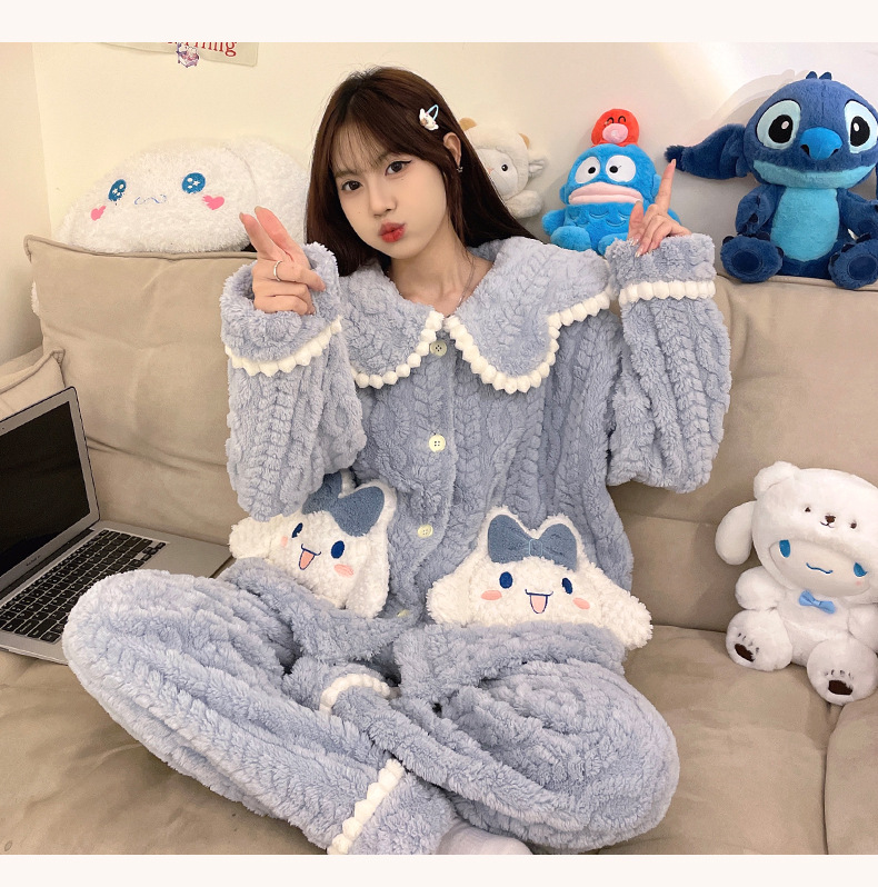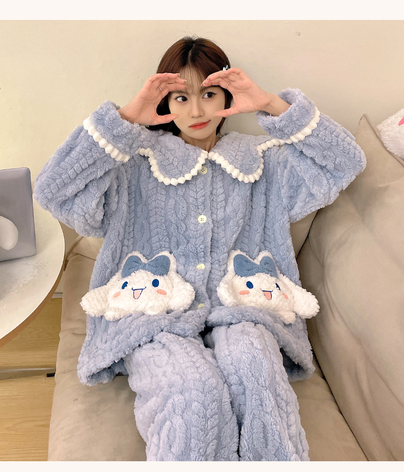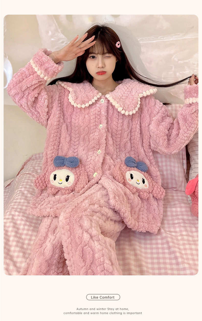 冬季新款【睡衣女珊瑚绒】卡通可爱娃娃领 秋冬天加厚加绒保暖法兰绒家居服套装