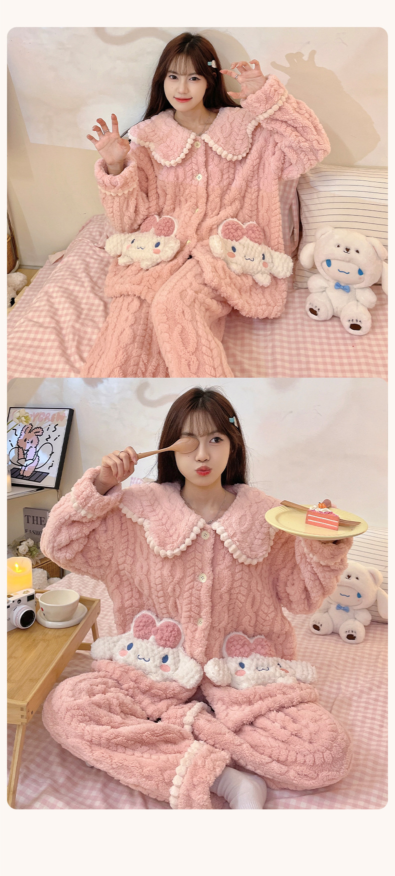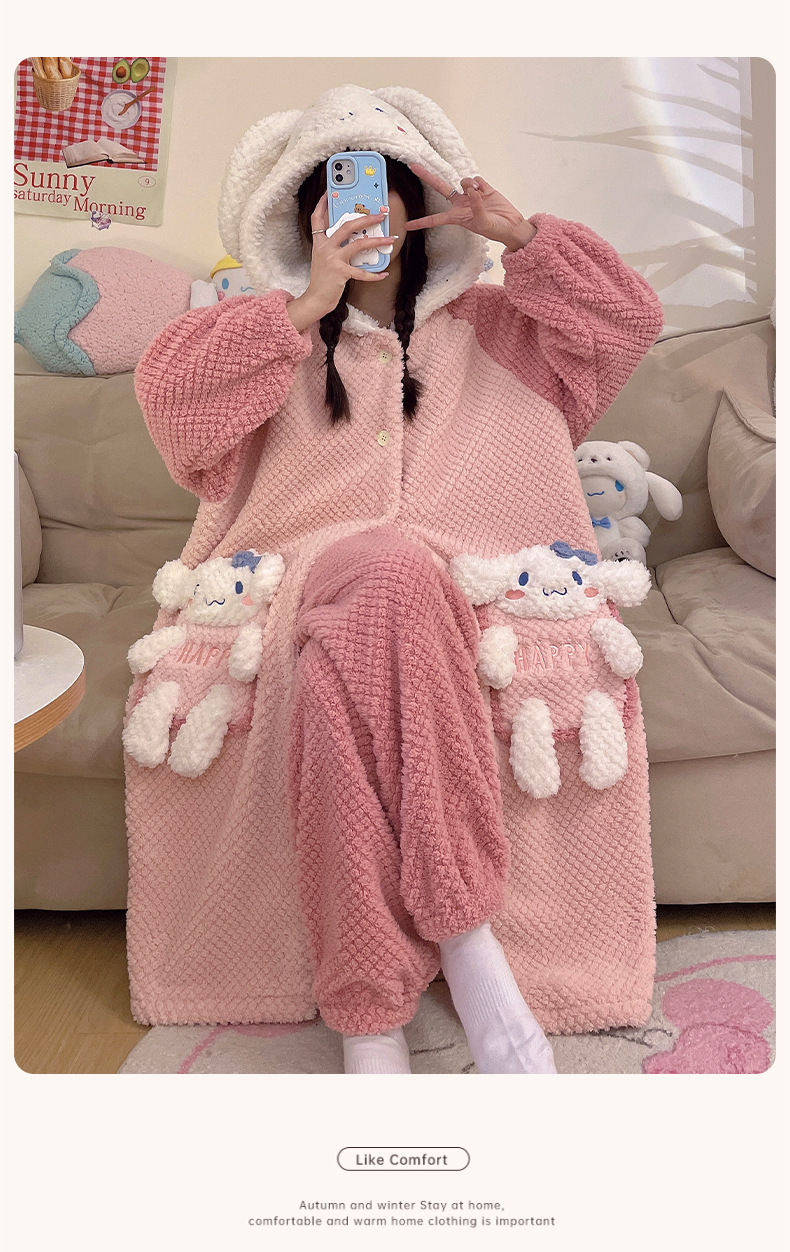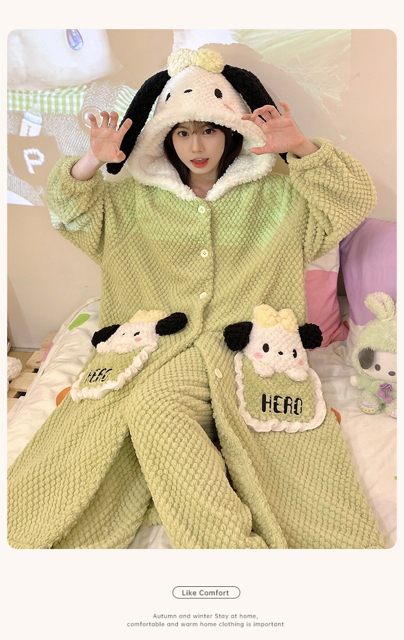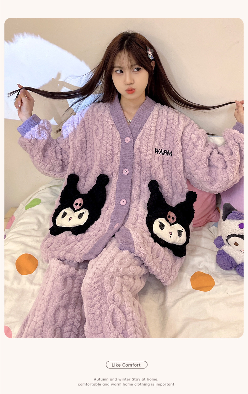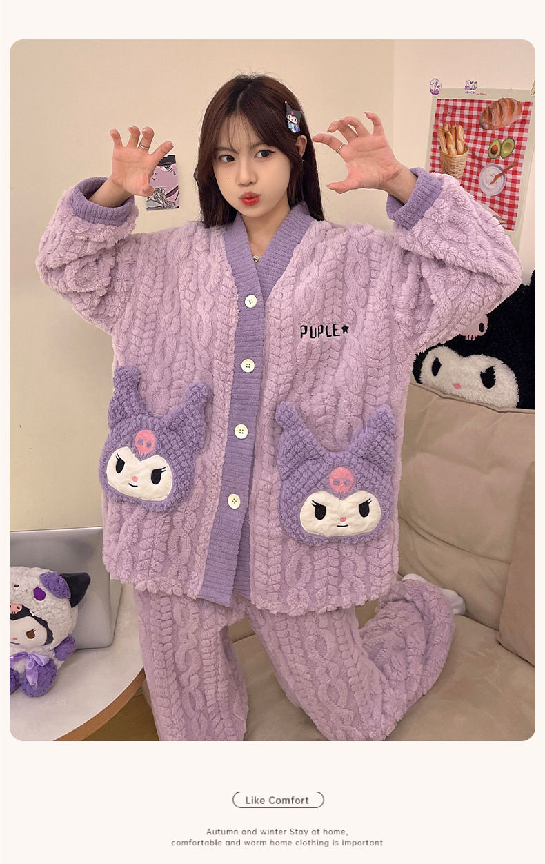 冬季新款【睡衣女珊瑚绒】卡通可爱娃娃领 秋冬天加厚加绒保暖法兰绒家居服套装