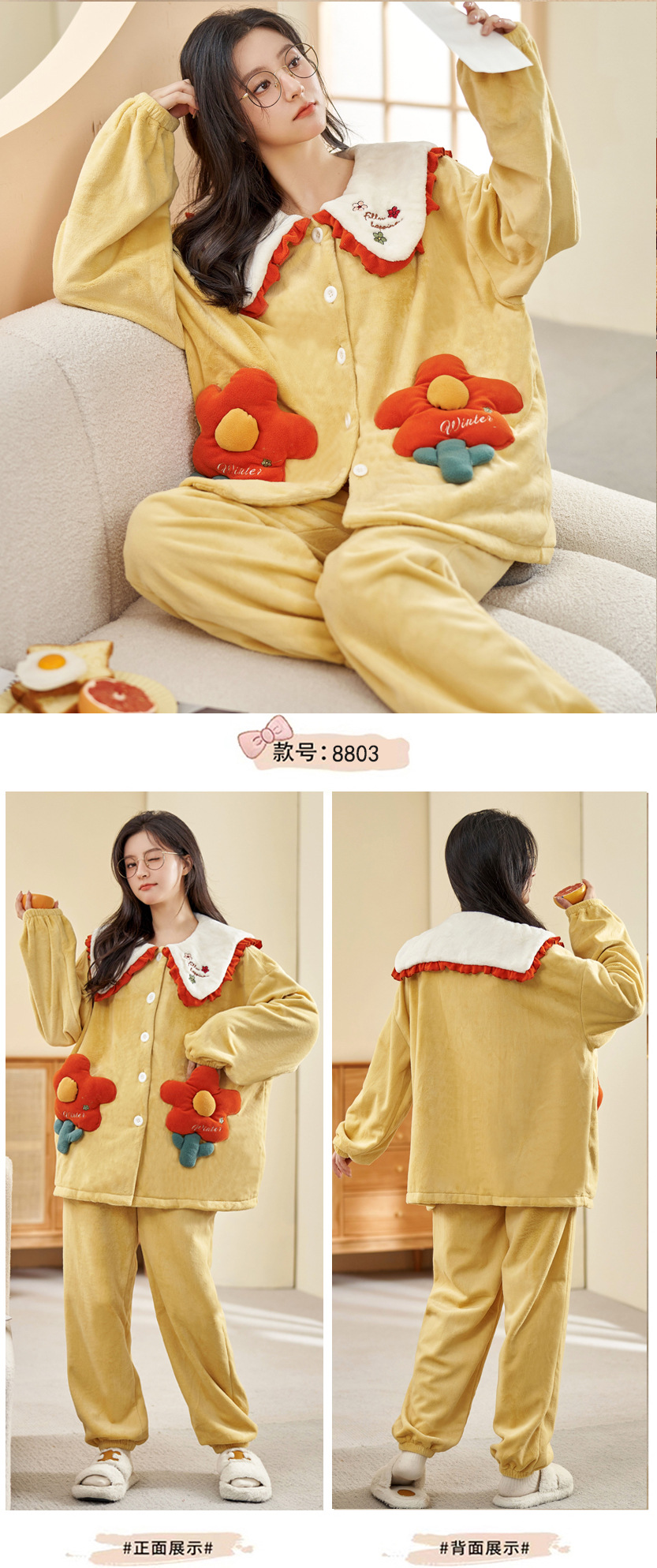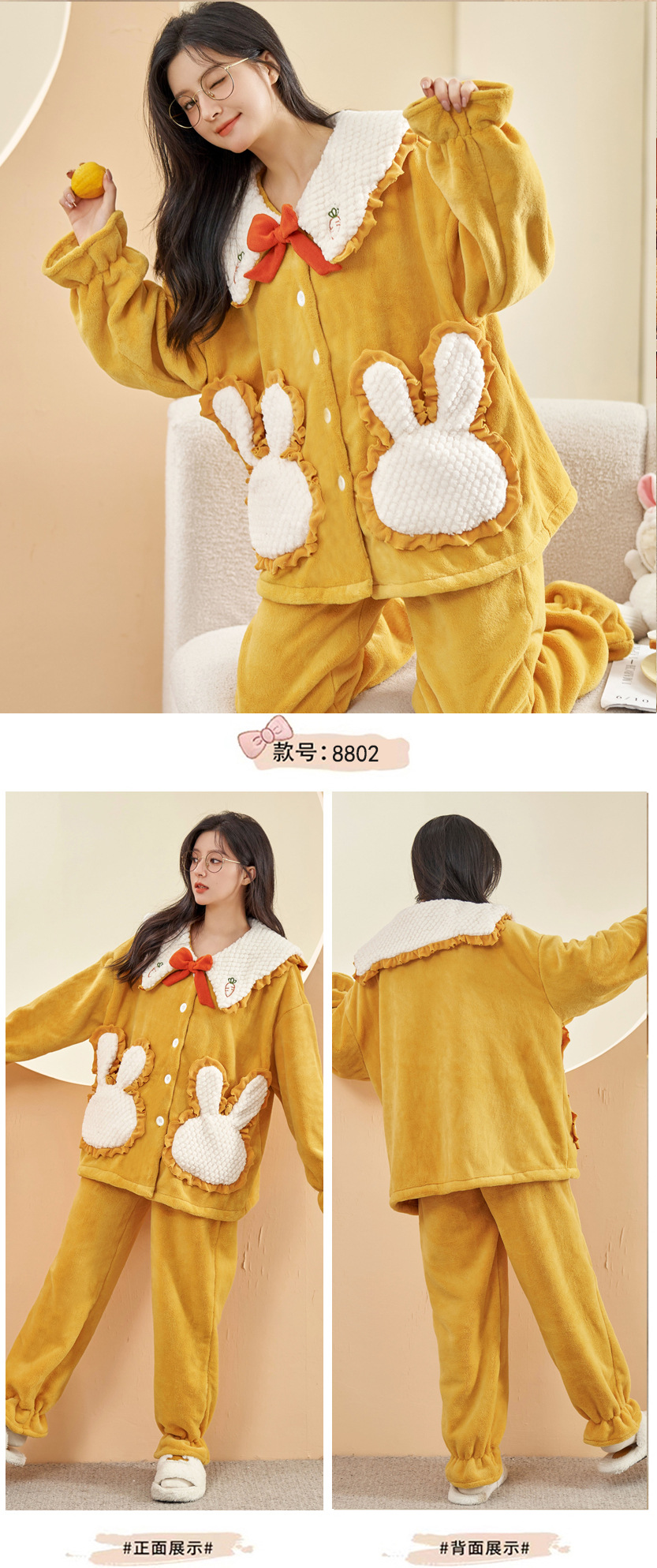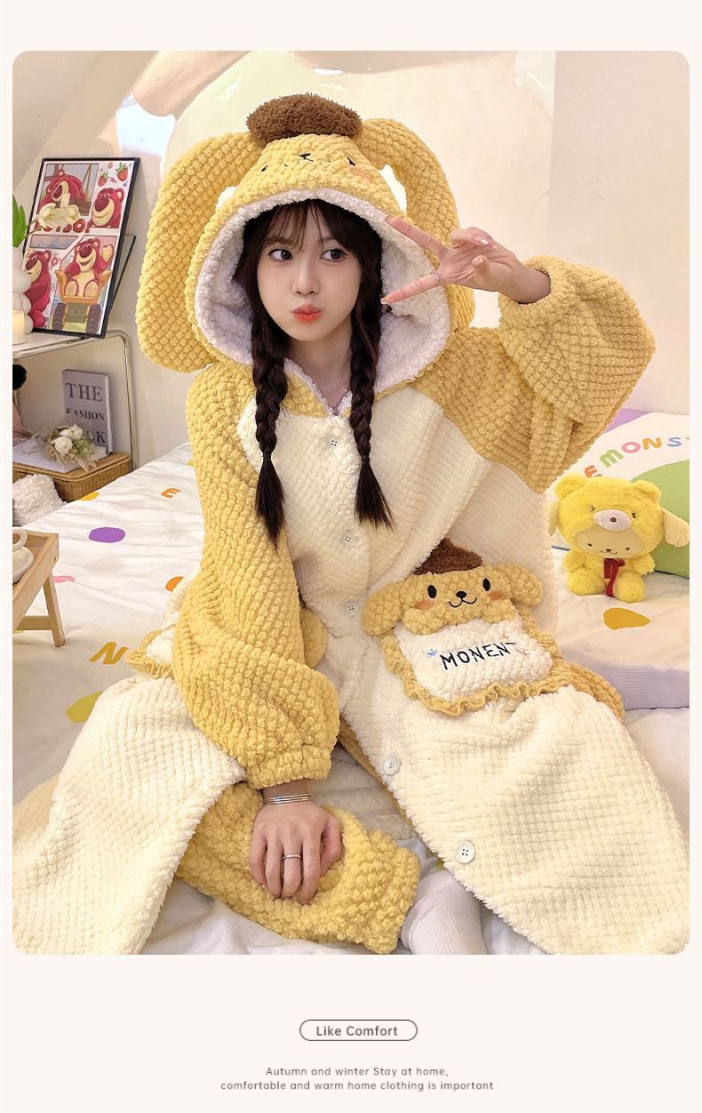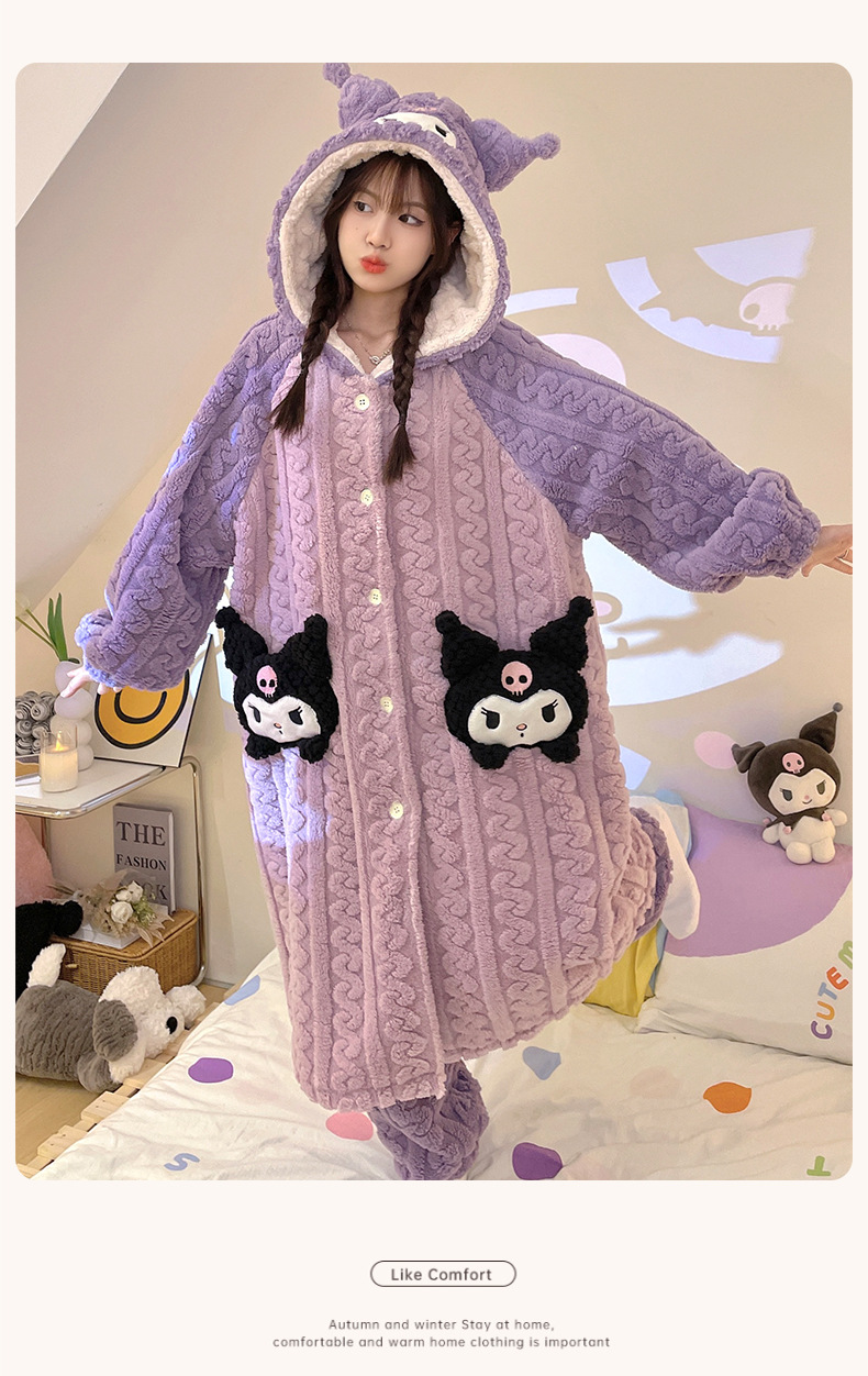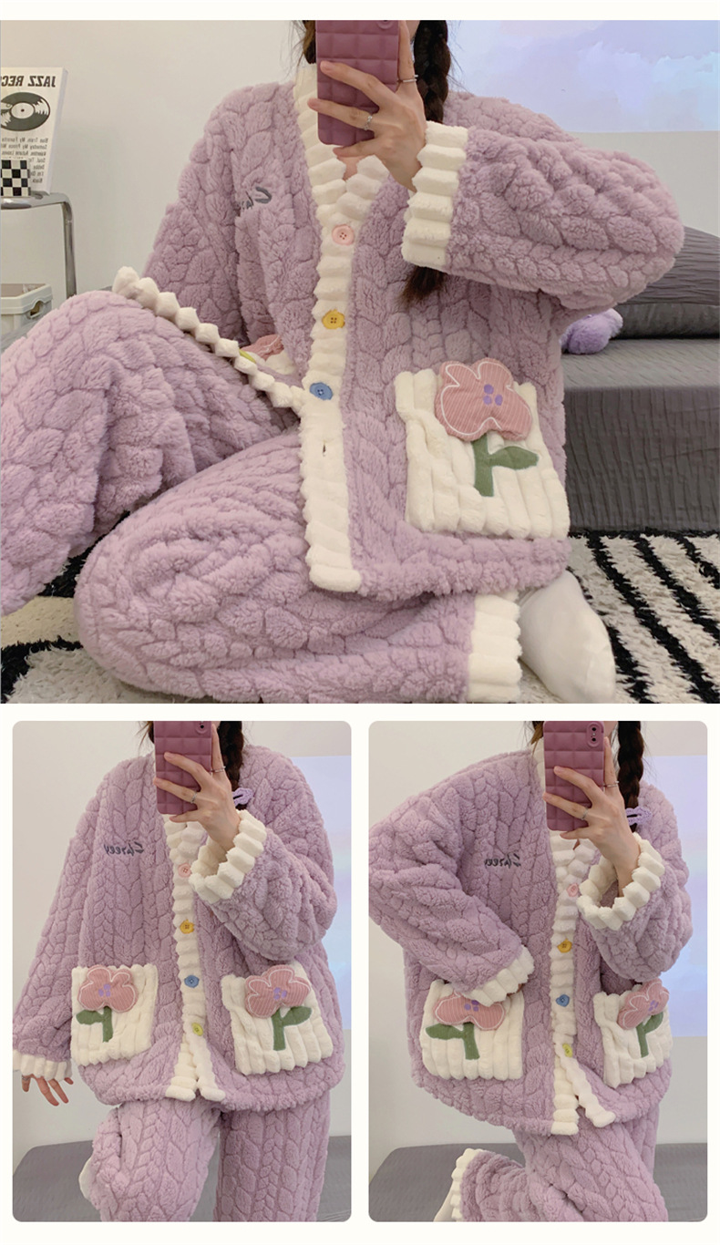 冬季新款【睡衣女珊瑚绒】卡通可爱娃娃领 秋冬天加厚加绒保暖法兰绒家居服套装