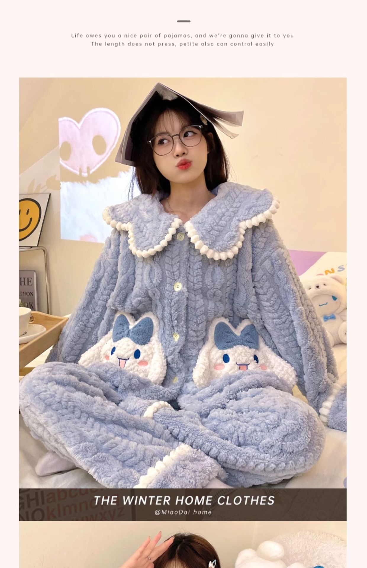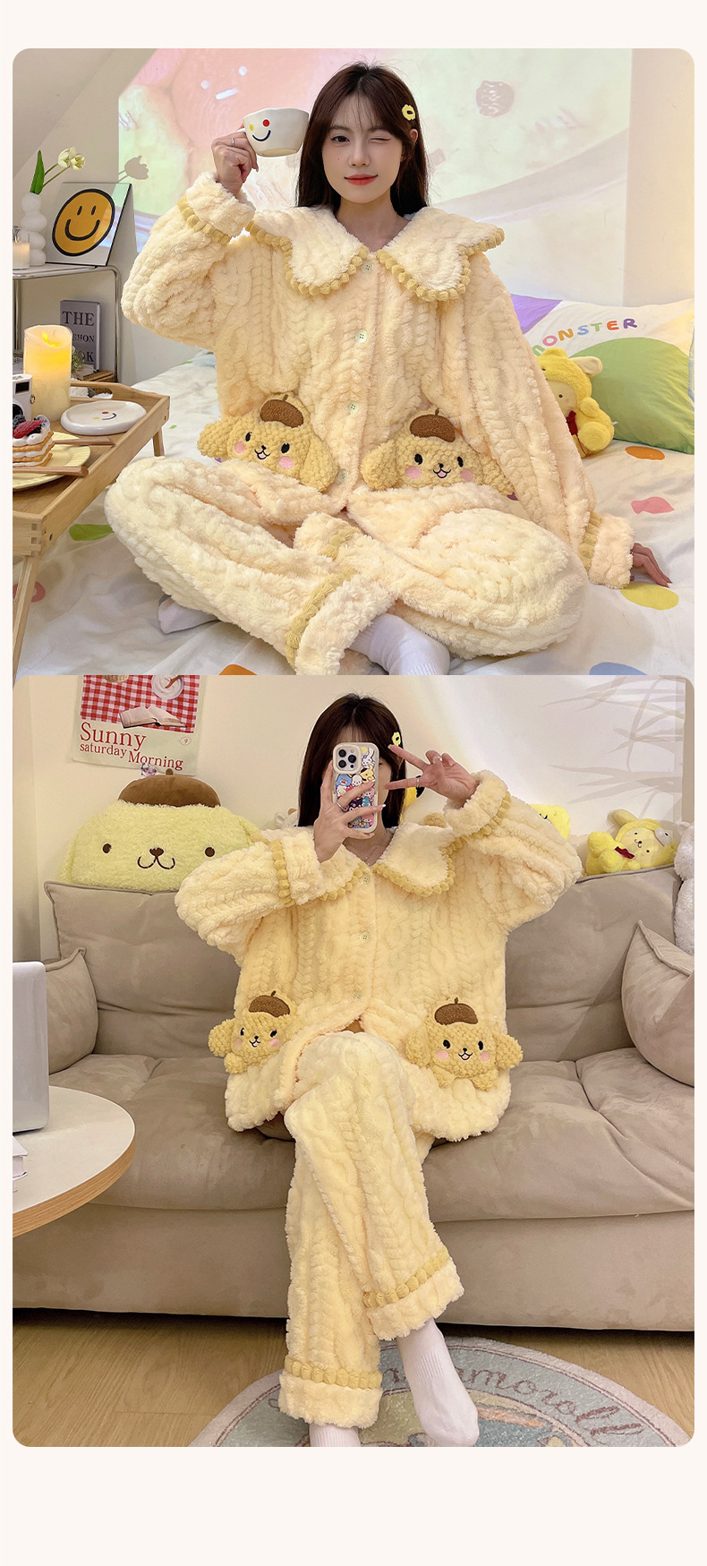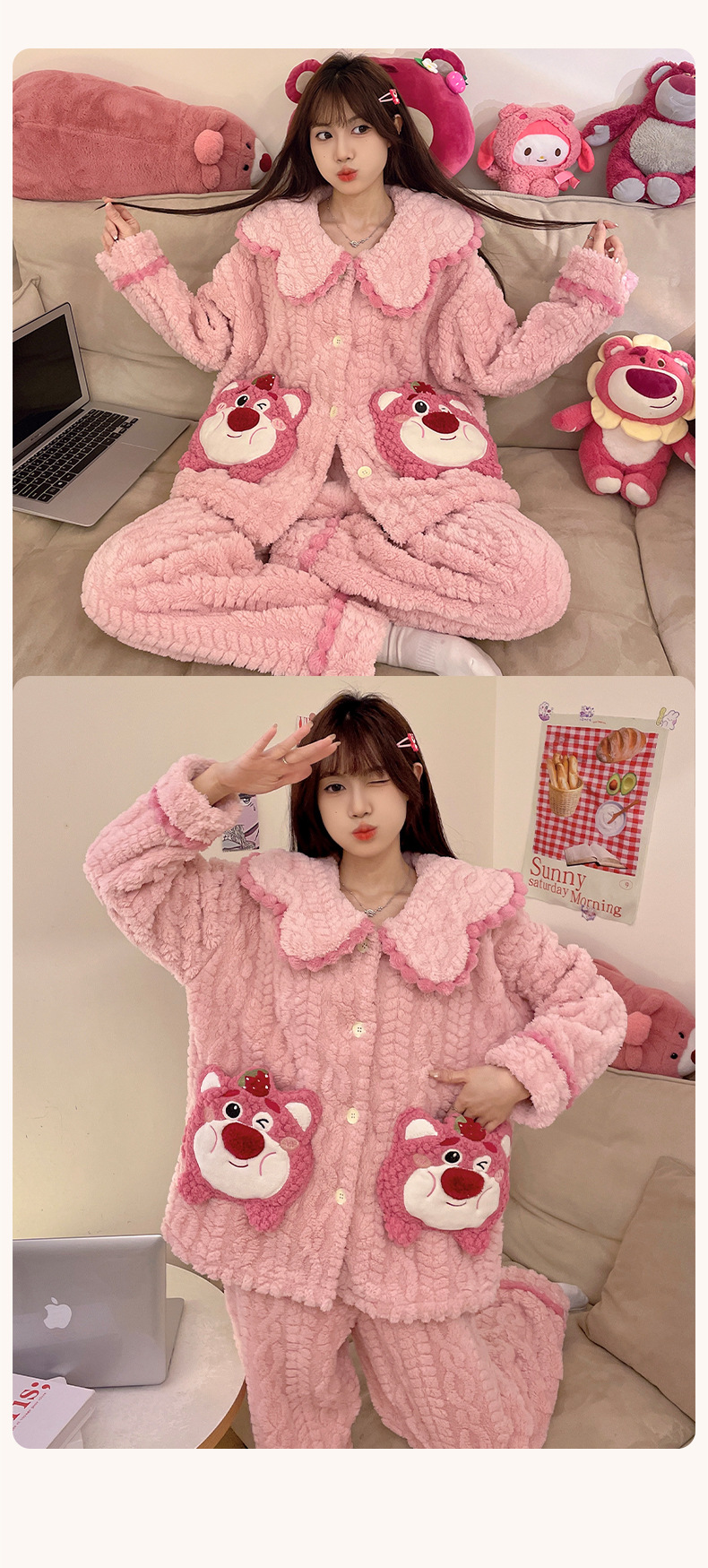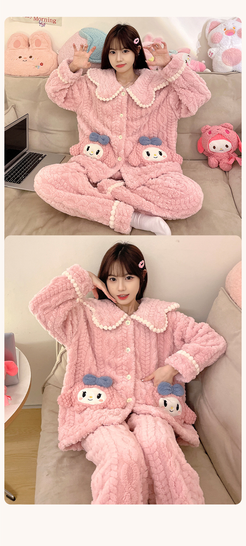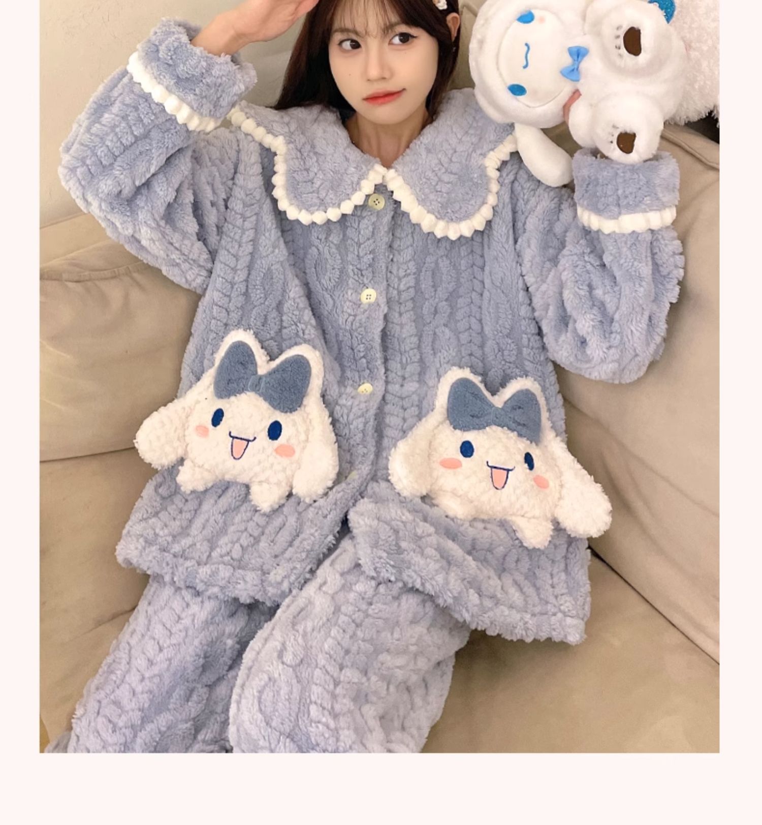 冬季新款【睡衣女珊瑚绒】卡通可爱娃娃领 秋冬天加厚加绒保暖法兰绒家居服套装