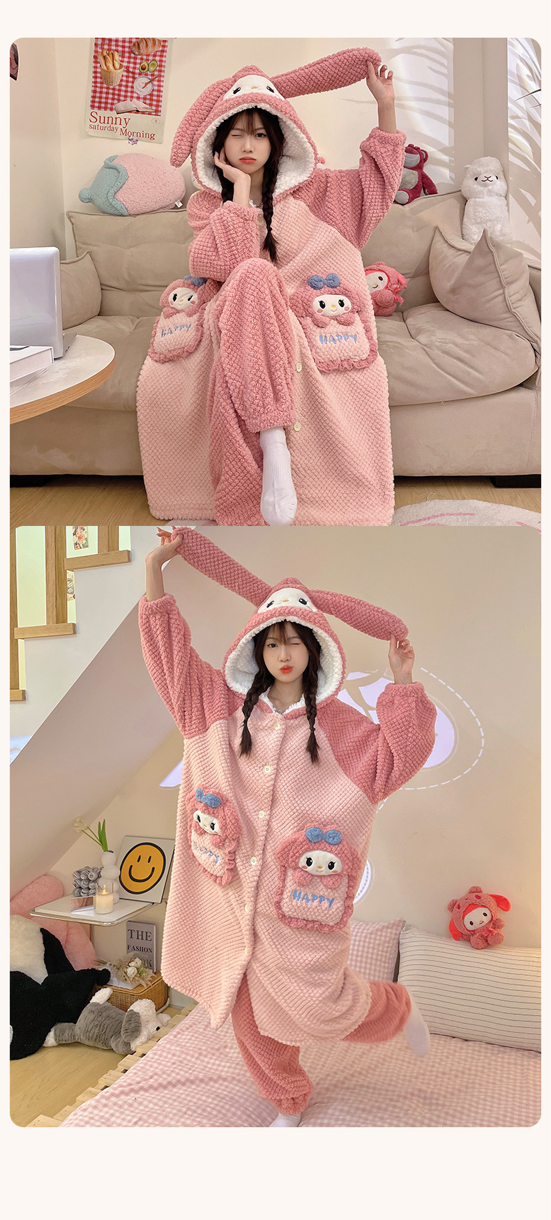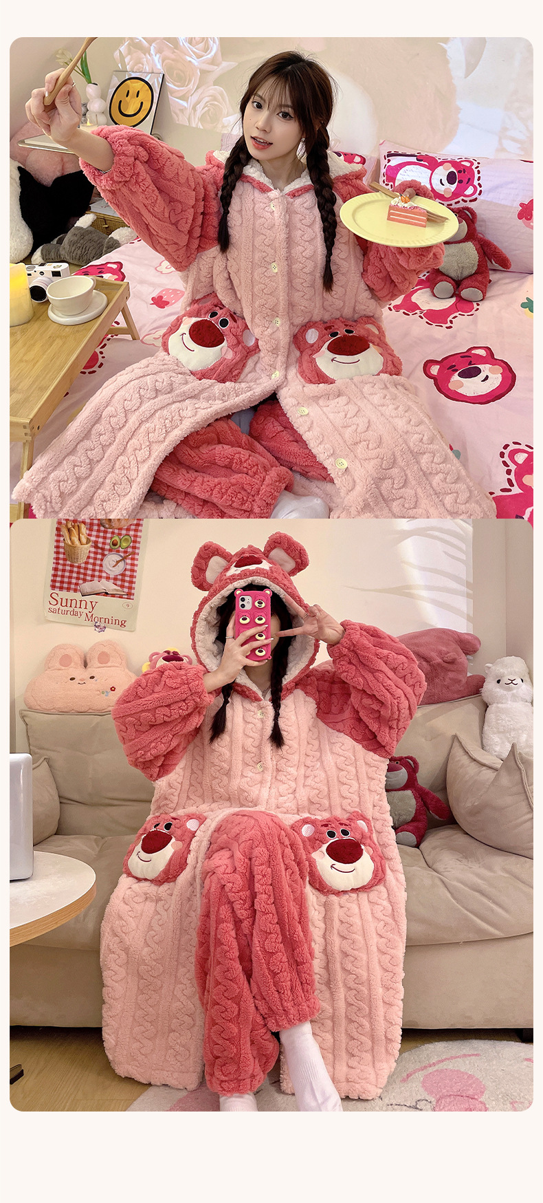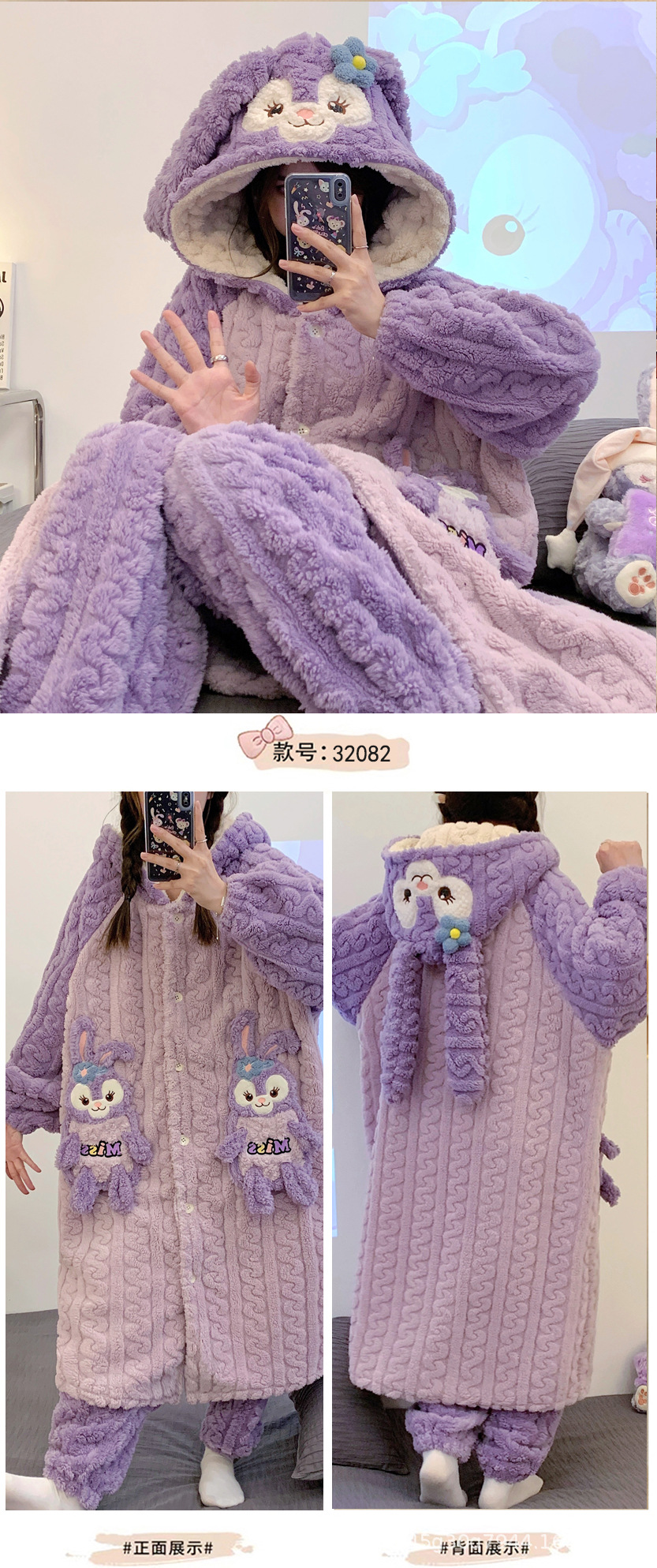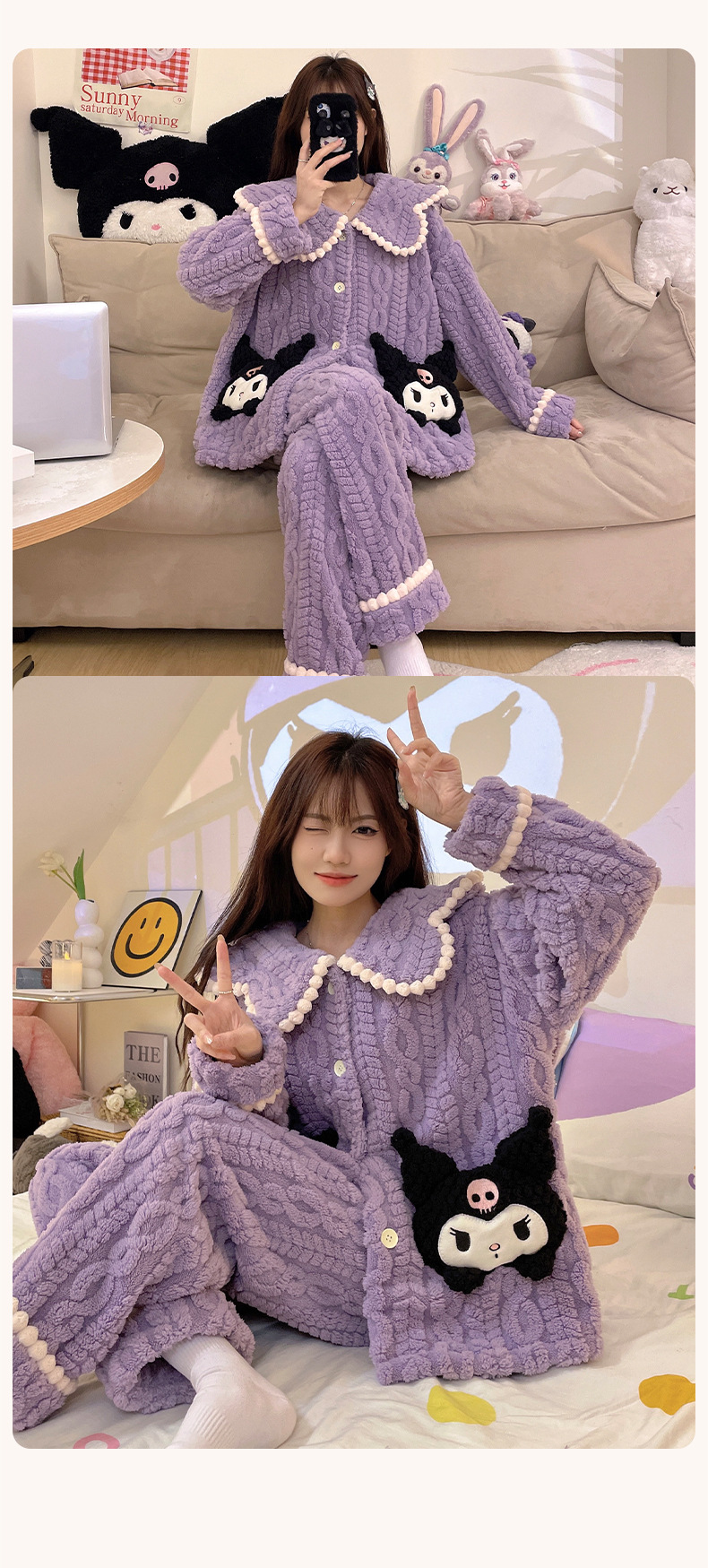 冬季新款【睡衣女珊瑚绒】卡通可爱娃娃领 秋冬天加厚加绒保暖法兰绒家居服套装