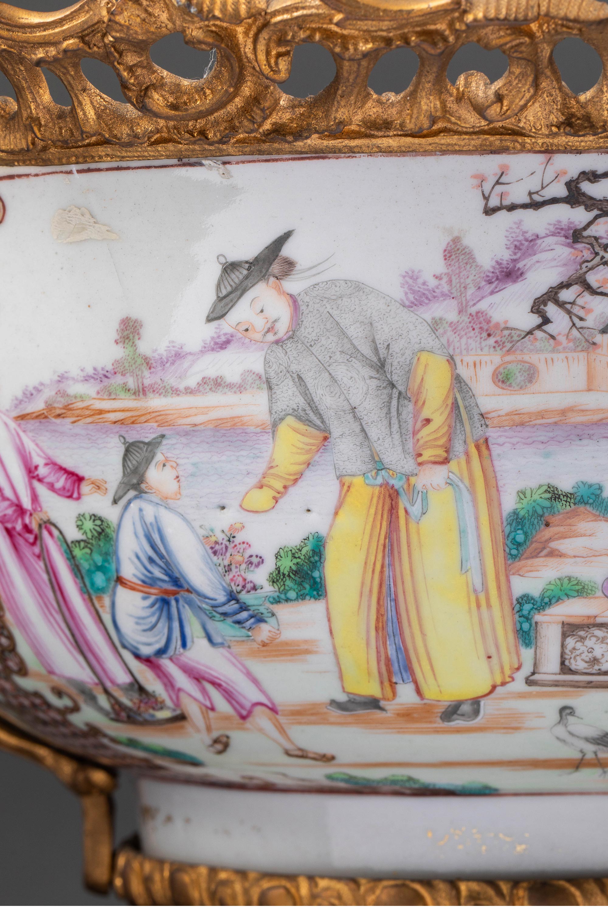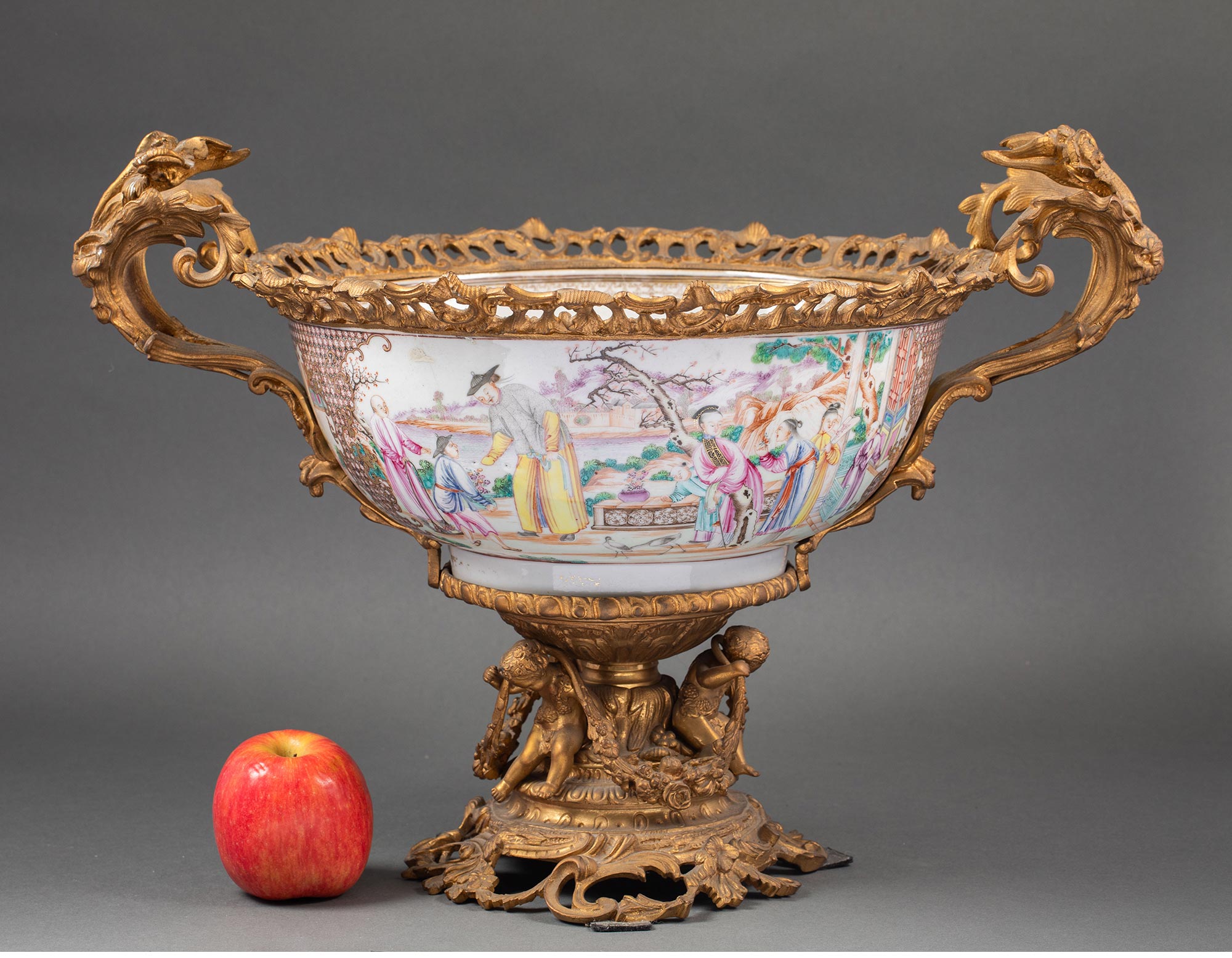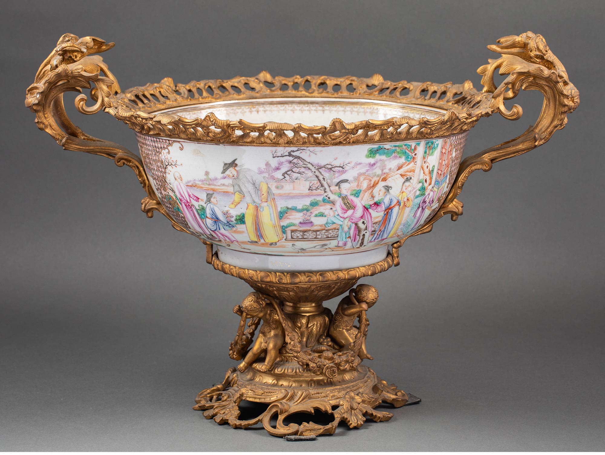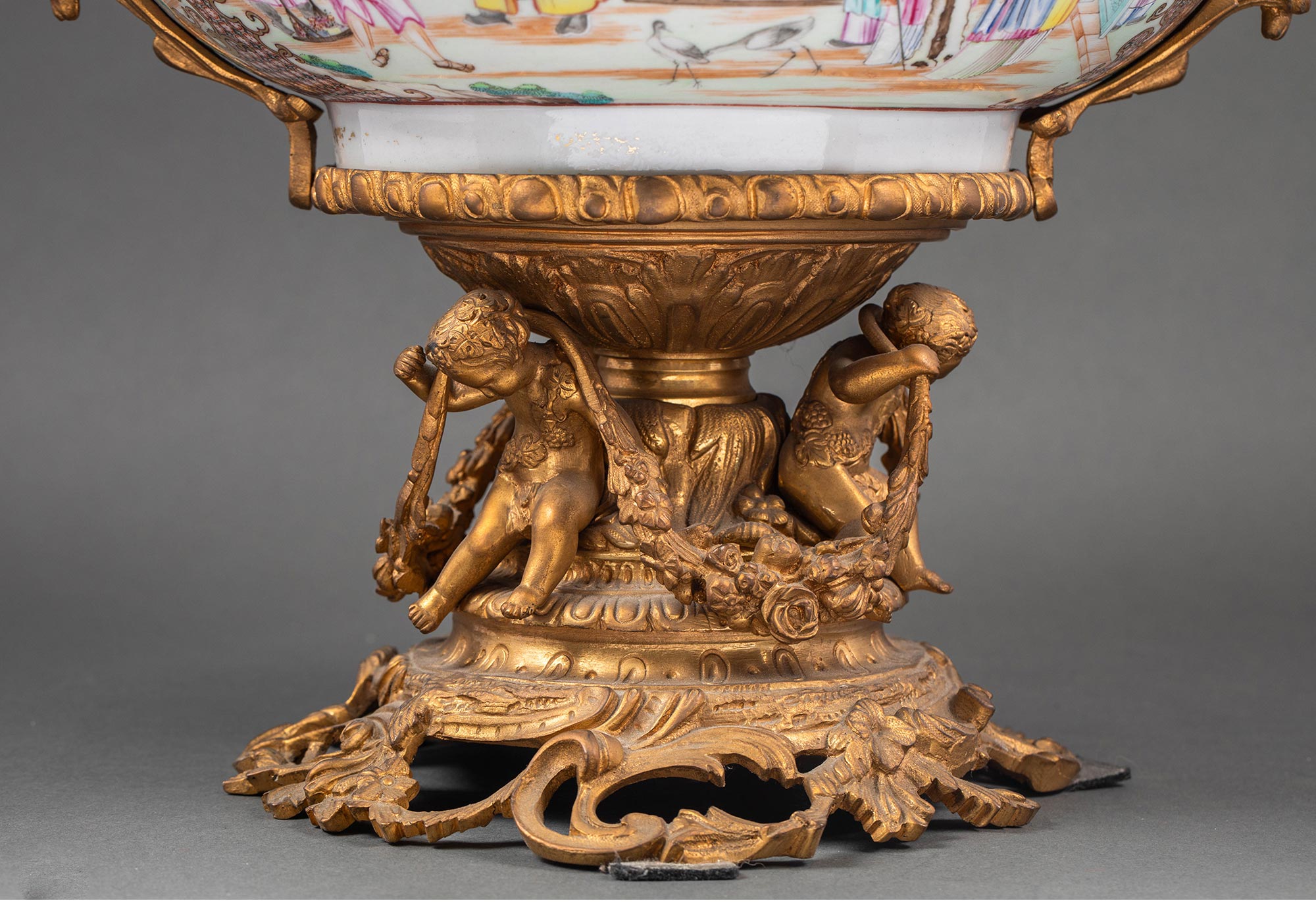 19世纪法国出品天使藤蔓主题铜鎏金精雕双耳及底座嵌传统园邸人物主题中国广彩瓷潘趣酒碗