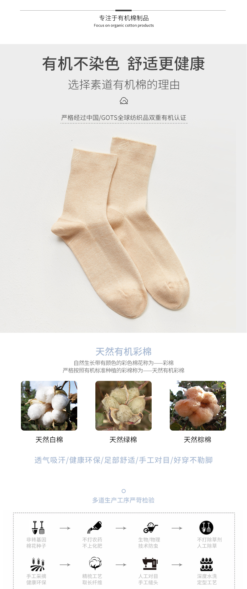 素道有机彩棉无感袜 99%棉 成人中筒 男女同款 舒适亲肤棉袜 袜子