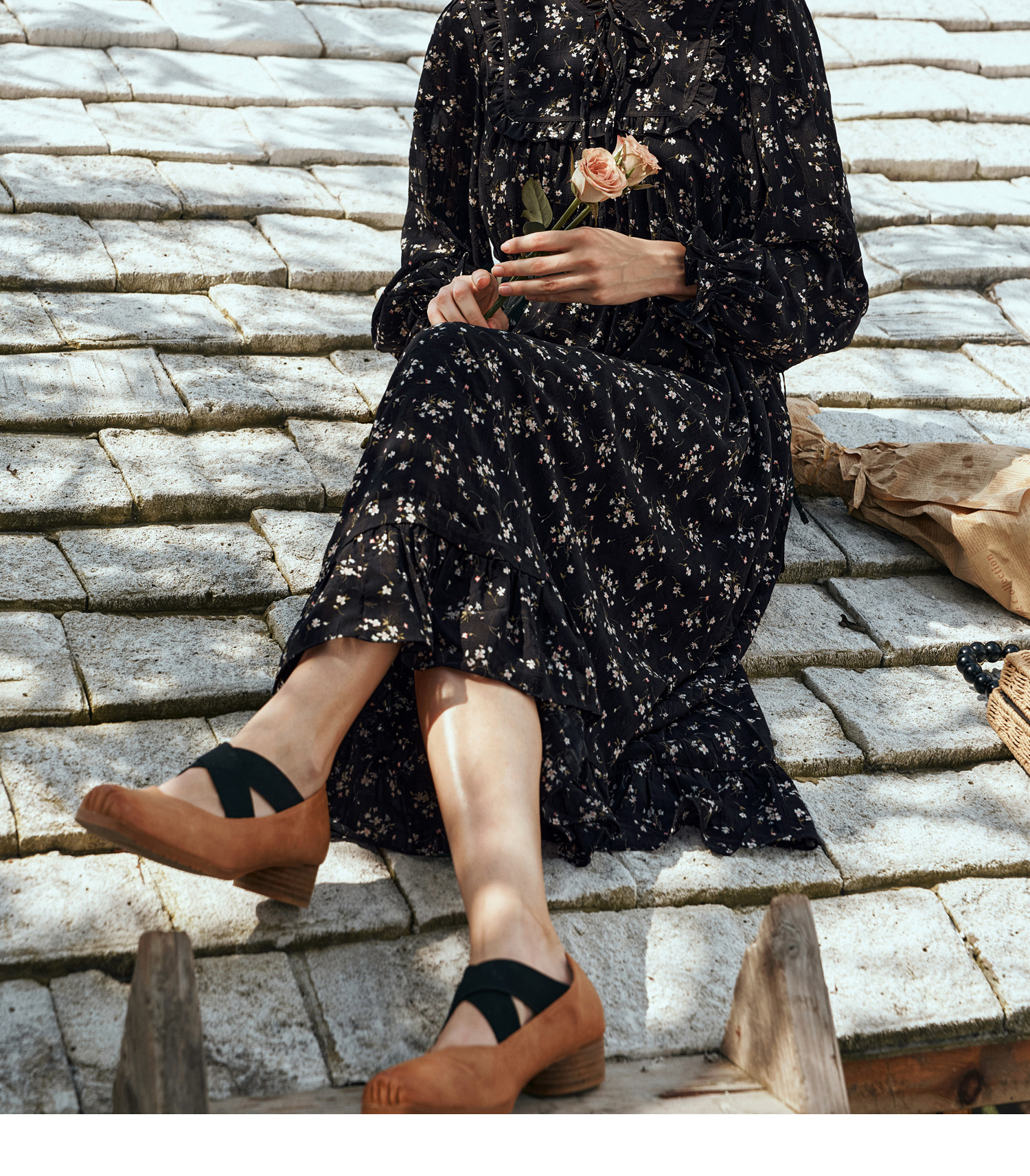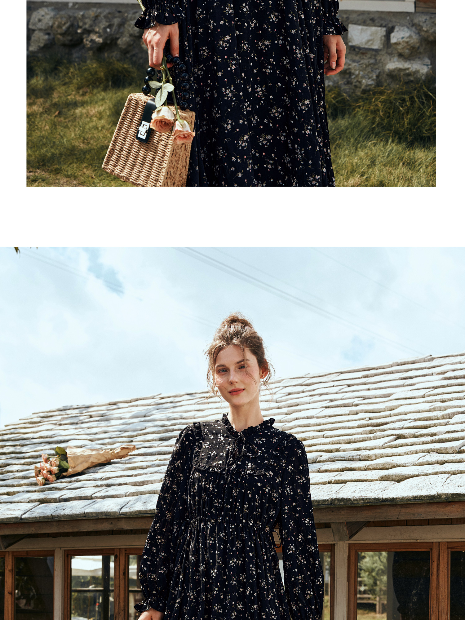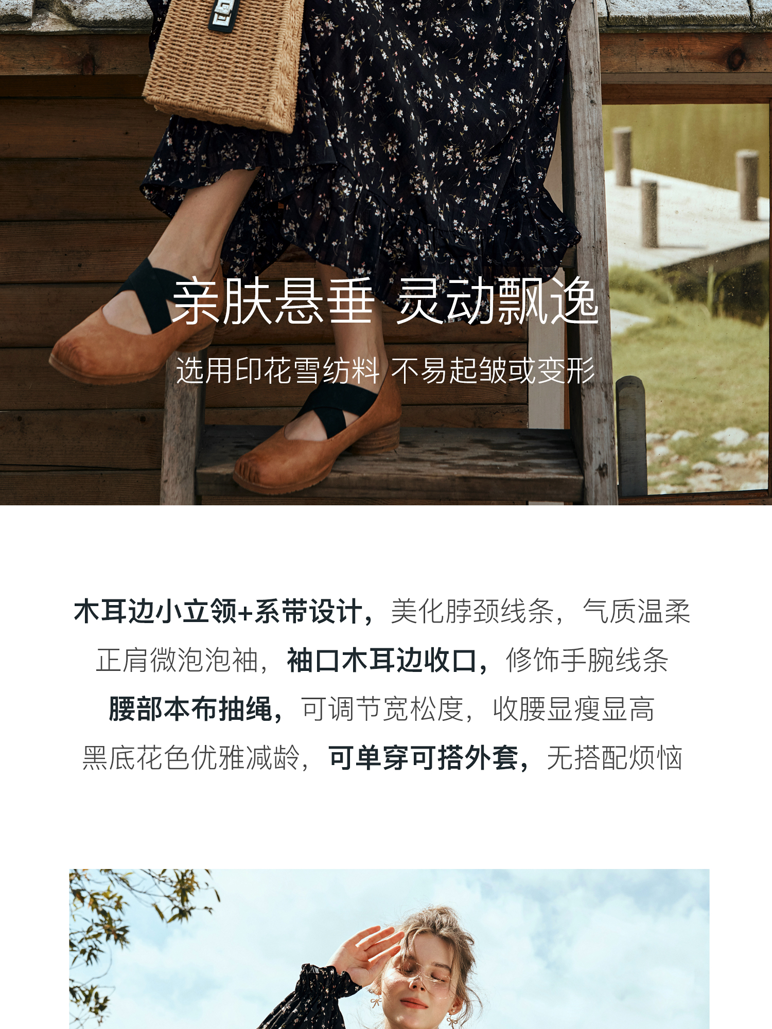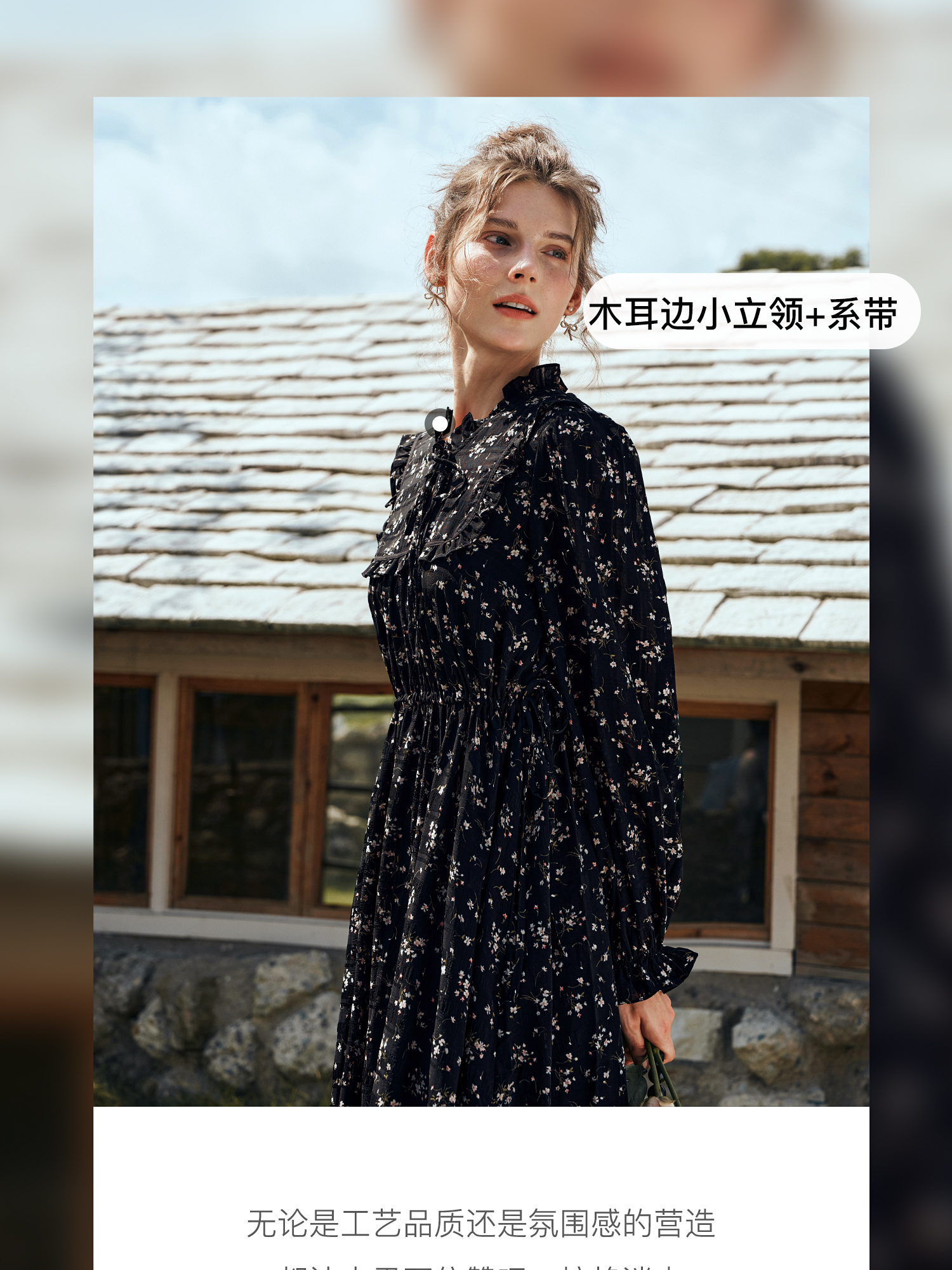 OLrain欧芮儿法式黑色连衣裙女秋季2024年新款立领木耳边收腰长裙