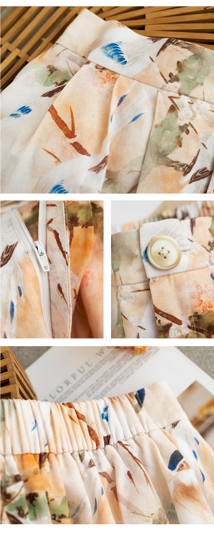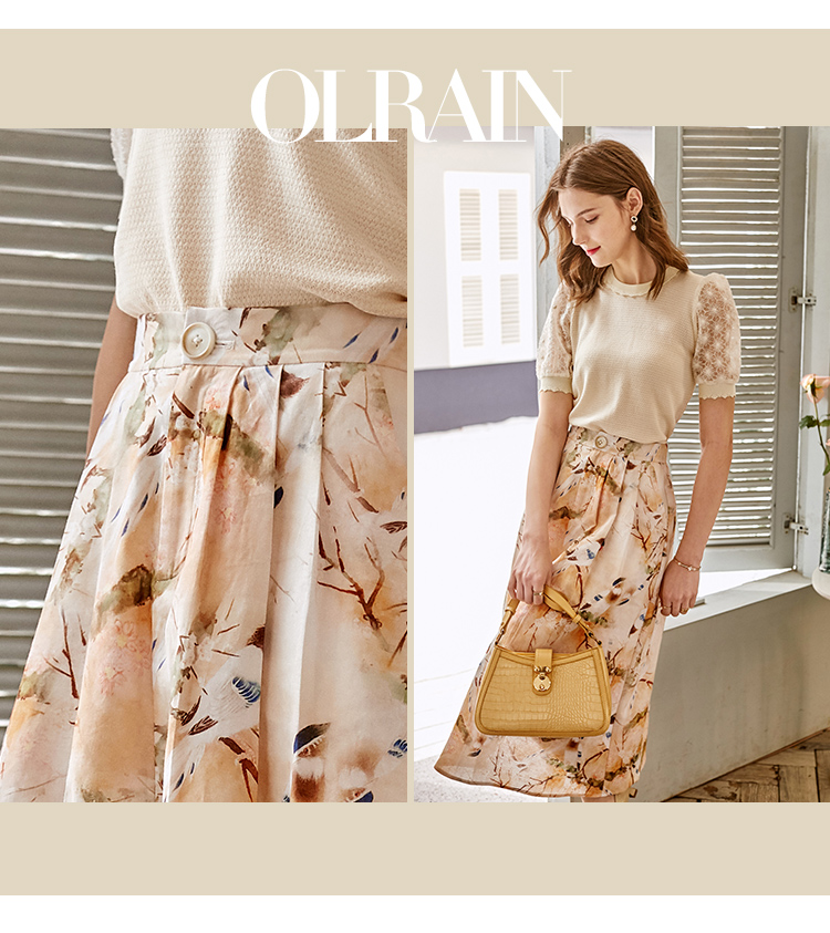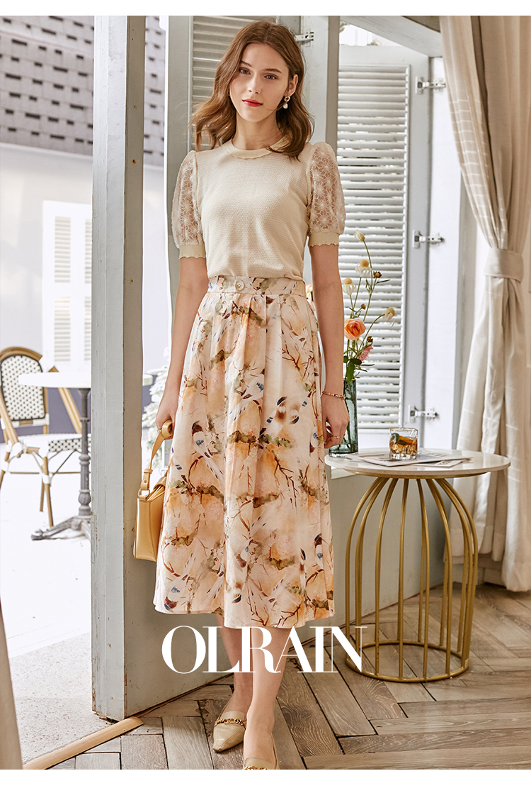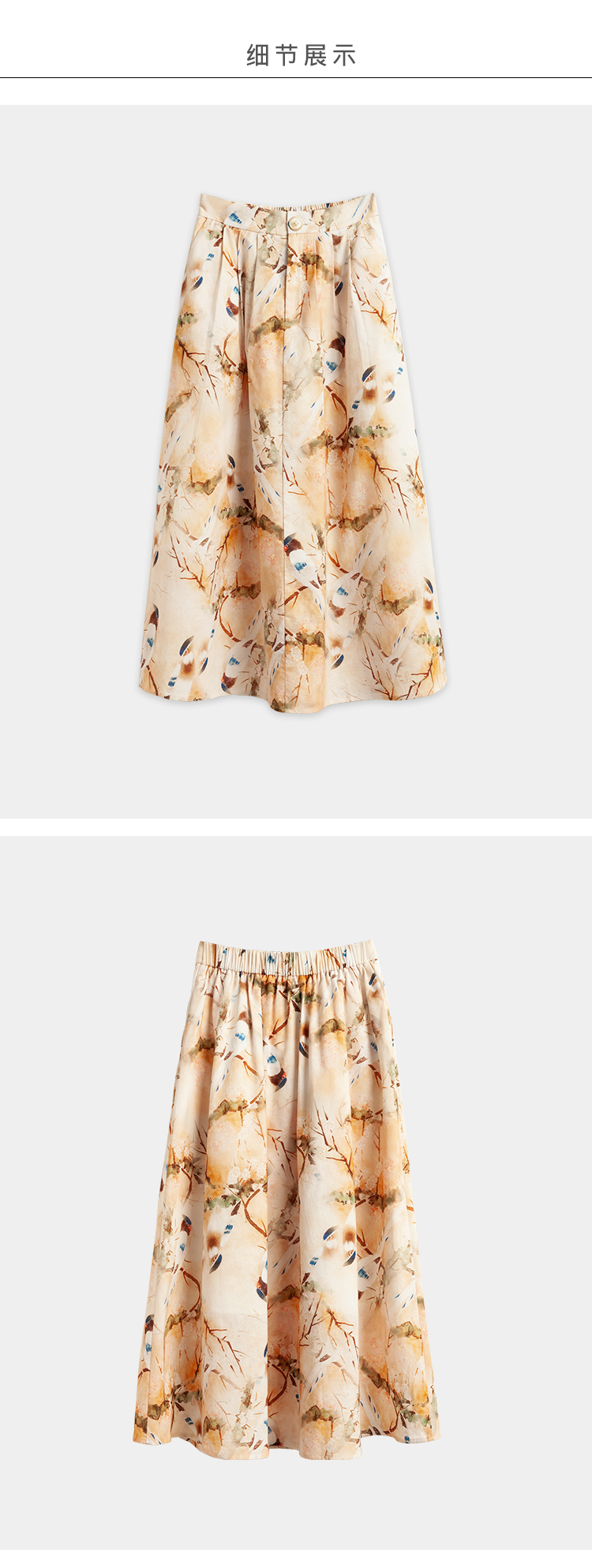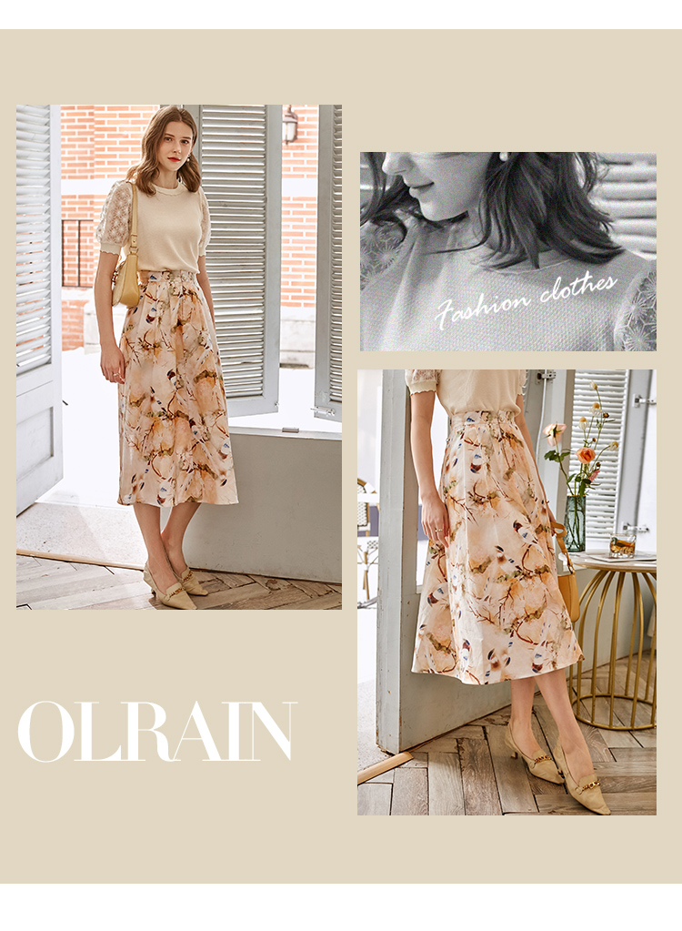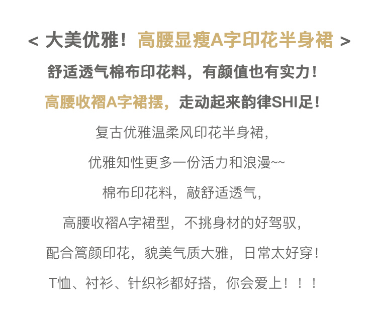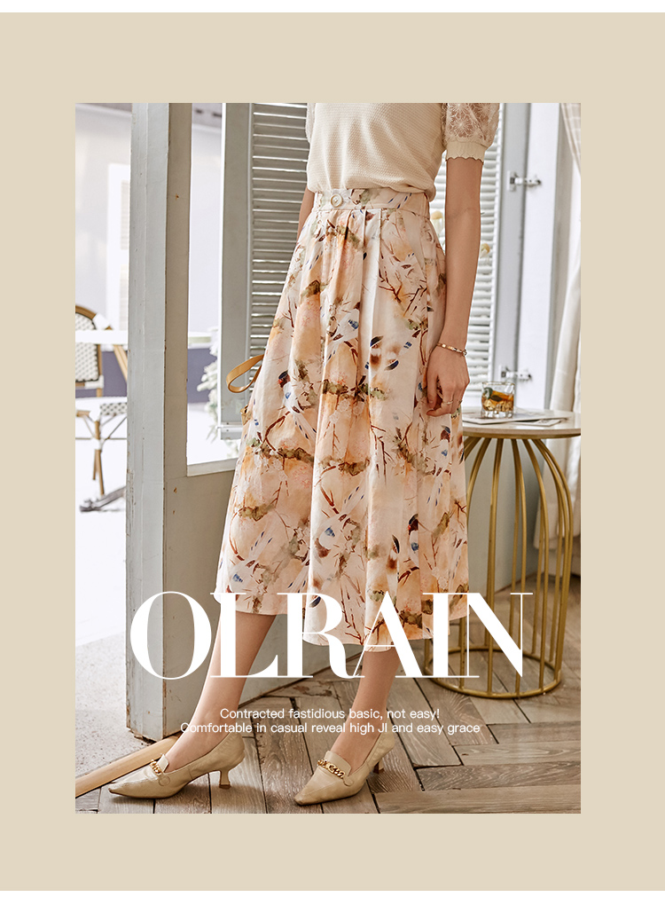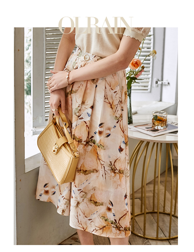 欧芮儿印花半身裙女2021春夏高腰显瘦时尚气质复古优雅收褶A字裙