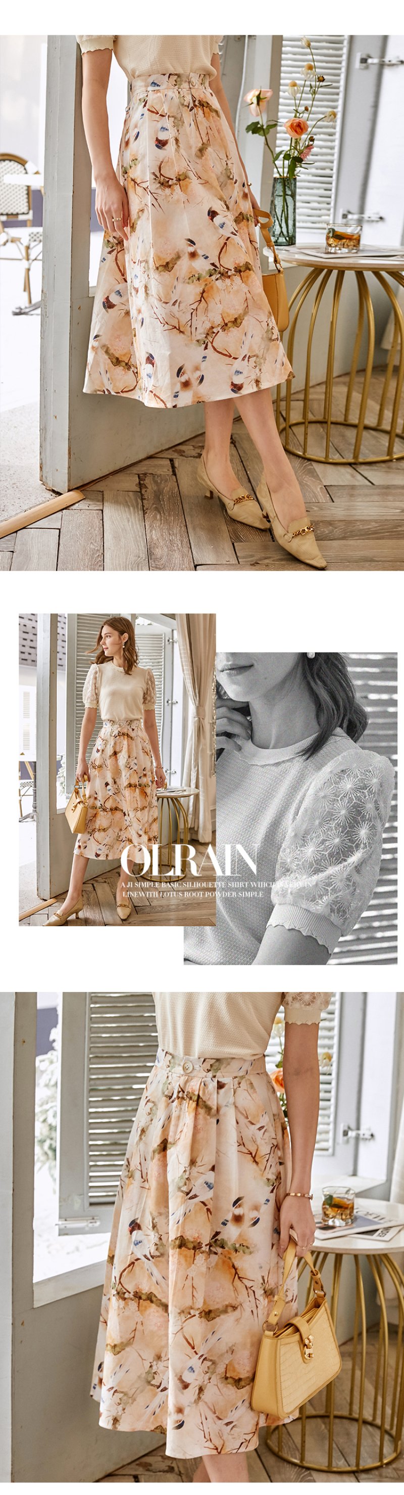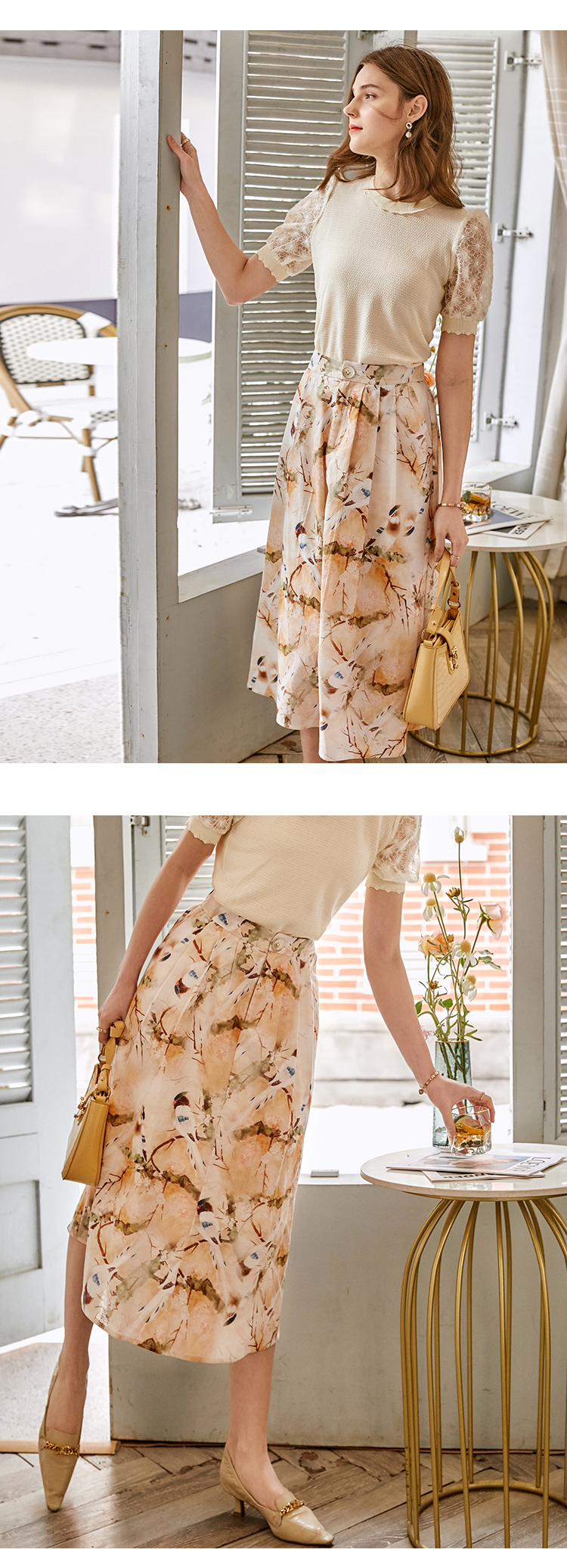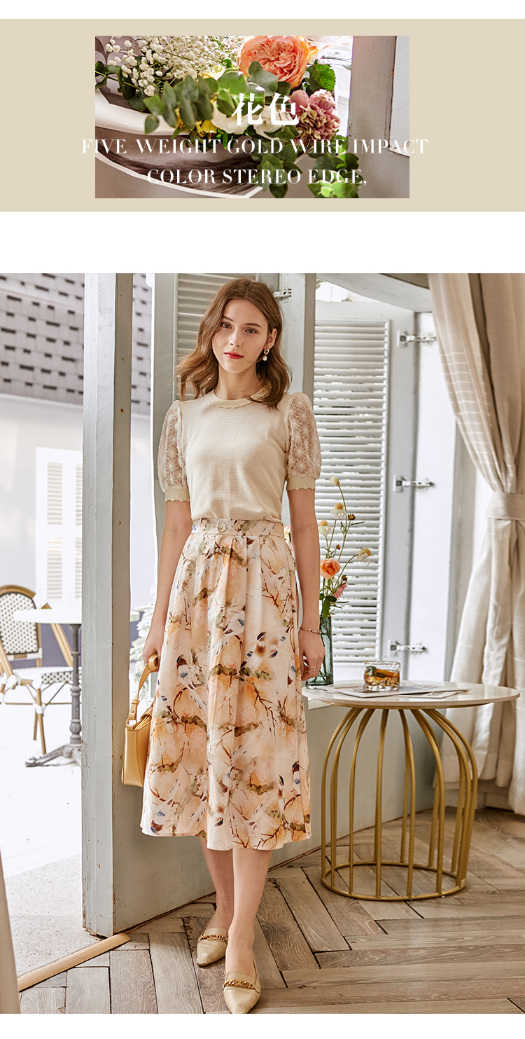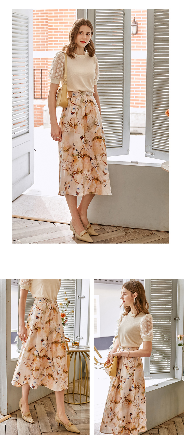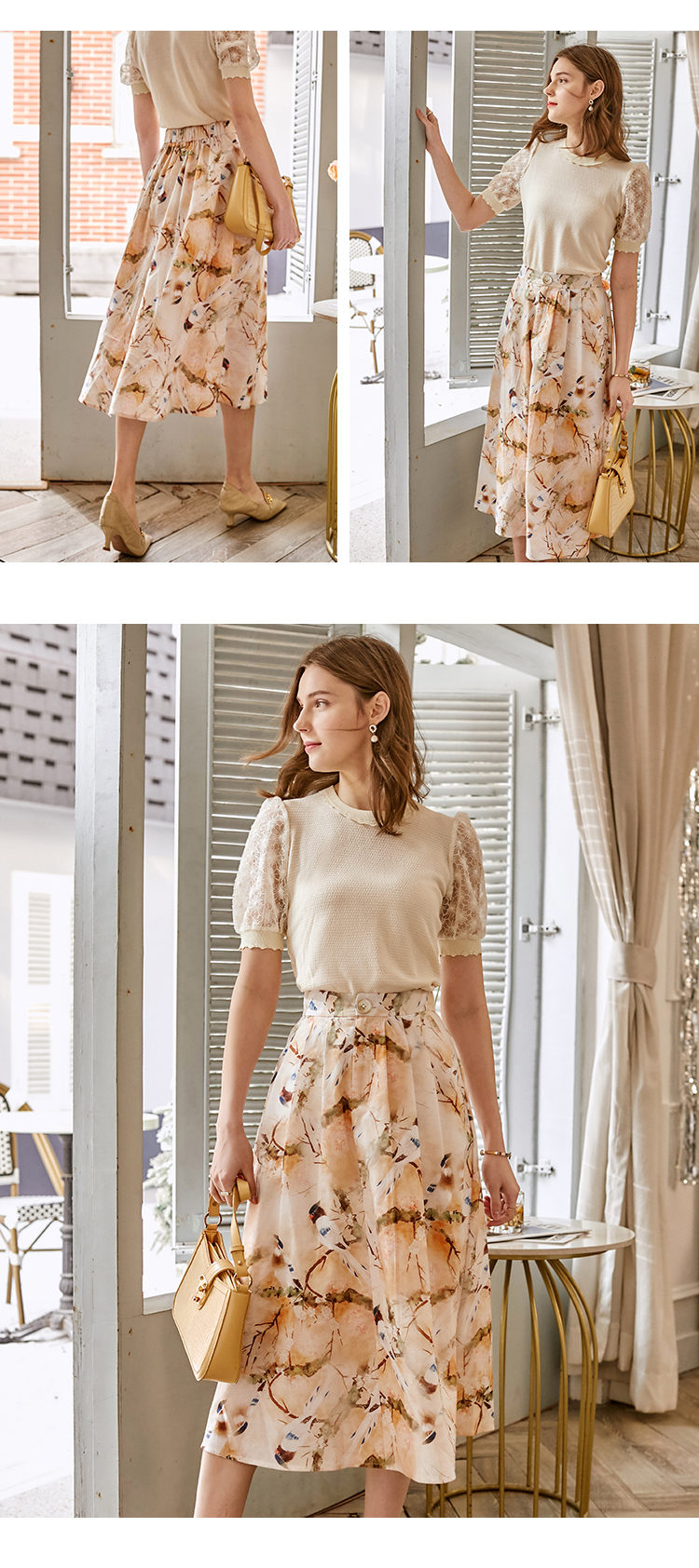 欧芮儿印花半身裙女2021春夏高腰显瘦时尚气质复古优雅收褶A字裙