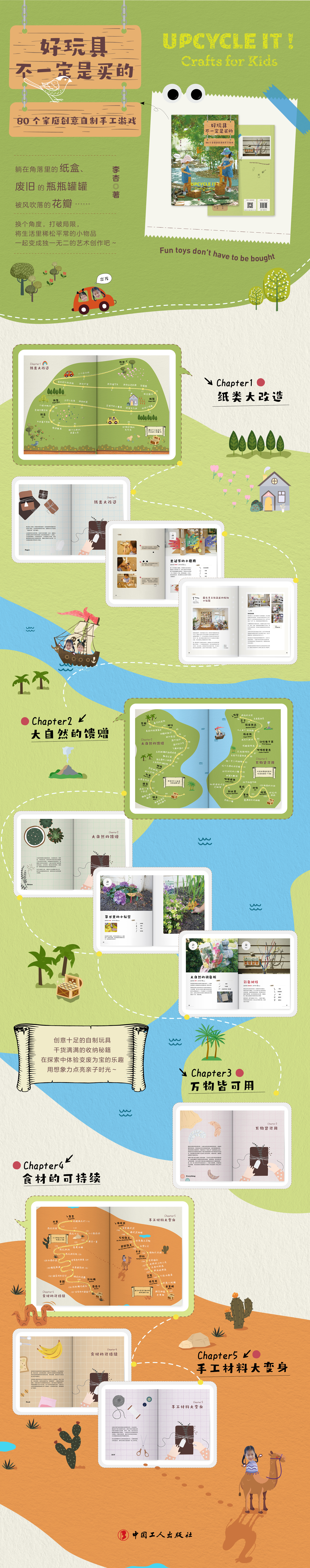 本书以环保创意为主题,包含纸类大改造、大自然的馈赠、万物皆可用、食材的可持续、手工材料大变身五个章节共80个创意十足的自制家庭手工游戏图解,同时附加了5篇干货满满的家庭收纳秘籍与材料购物清单,为想要打破思维局限、探索玩具新玩法、体验变废为宝乐趣的家庭提供灵感。