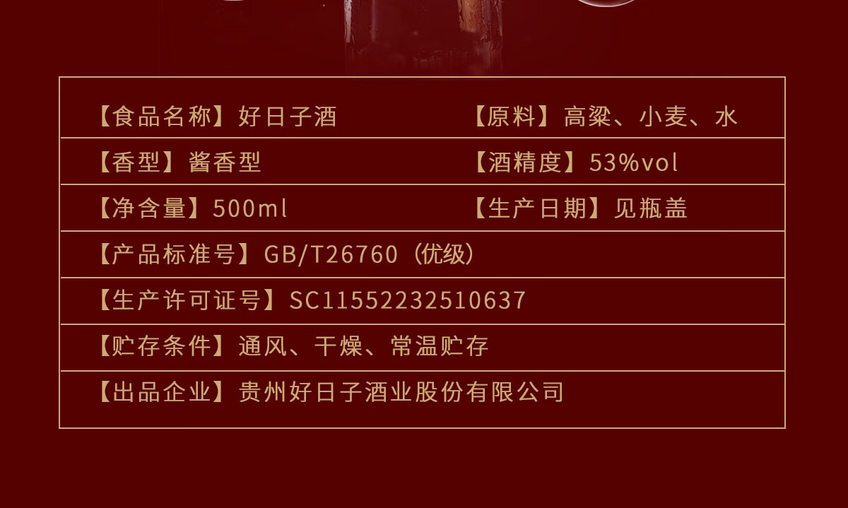53度贵州好日子酒纯粮酿造酱香型白酒500ml