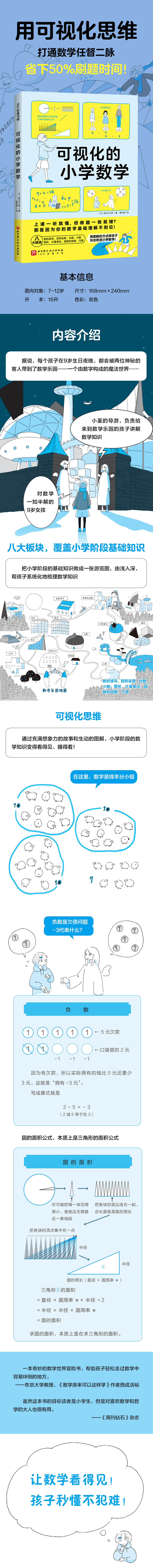 ★可视化思维让数学从抽象变具体,从而让孩子秒懂数学,爱上数学 这本书用充满想象力的童话故事和丰富的图解,把小学数学中抽象的公式、概念转化为绵羊分组、切披萨、拼瓷砖等孩子熟悉的场景,真正实现"可视化"学习。当孩子能"可视化思维看见"数学原理时,理解障碍自然消失——这是传统题海战术无法达到的教学效果。特别推荐给那些一看到数学题就喊"看不懂"的学生和家长!" ★日本教育专家匠心之作,解决中国家长辅导难题! 日本数学教育大师桥爪大三郎将多教学经验融入本书。本书涵盖小学6年核心知识点。书中的"数学乐园"就像一位随时在线的老师:加法楼、分数屋、图形城堡…每个场景都暗藏学习玄机。家长不用再为"怎么教孩子都听不懂"发愁,跟着小堇的旅程,孩子自己能开窍!" ★预防数学恐惧症的‘疫苗书’,从小培养理科思维! 90%数学厌学情绪始于小学阶段的概念困惑。这本书就像一剂"预防针":用故事消除畏难情绪,用图画建立直观认知。当孩子发现"乘法原来是数瓷砖""分数等于分蛋糕",他们会主动追问"然后呢?"——这种发自兴趣的学习动力,比刷100道题更有价值!"