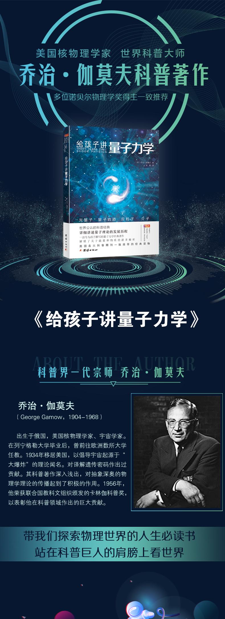 《给孩子讲量子力学》是伽莫夫的又一科普经典之作。本书讲述了伟大的物理学家们对微观量子理论发展所作出的杰出贡献。普朗克是第一个将能量的量子化概念引入到物理学的人。普朗克的光量子、玻尔的量子轨道、泡利的不相容原理、德·布罗意的导波、海森堡的不确定原理、狄拉克的反粒子、费米的粒子转换一直到汤川的介子等一系列伟大的物理学发现,本书都有详细介绍。本书译文通俗易懂,语言生动幽默,对读者来说,是一本的科普经典读物。