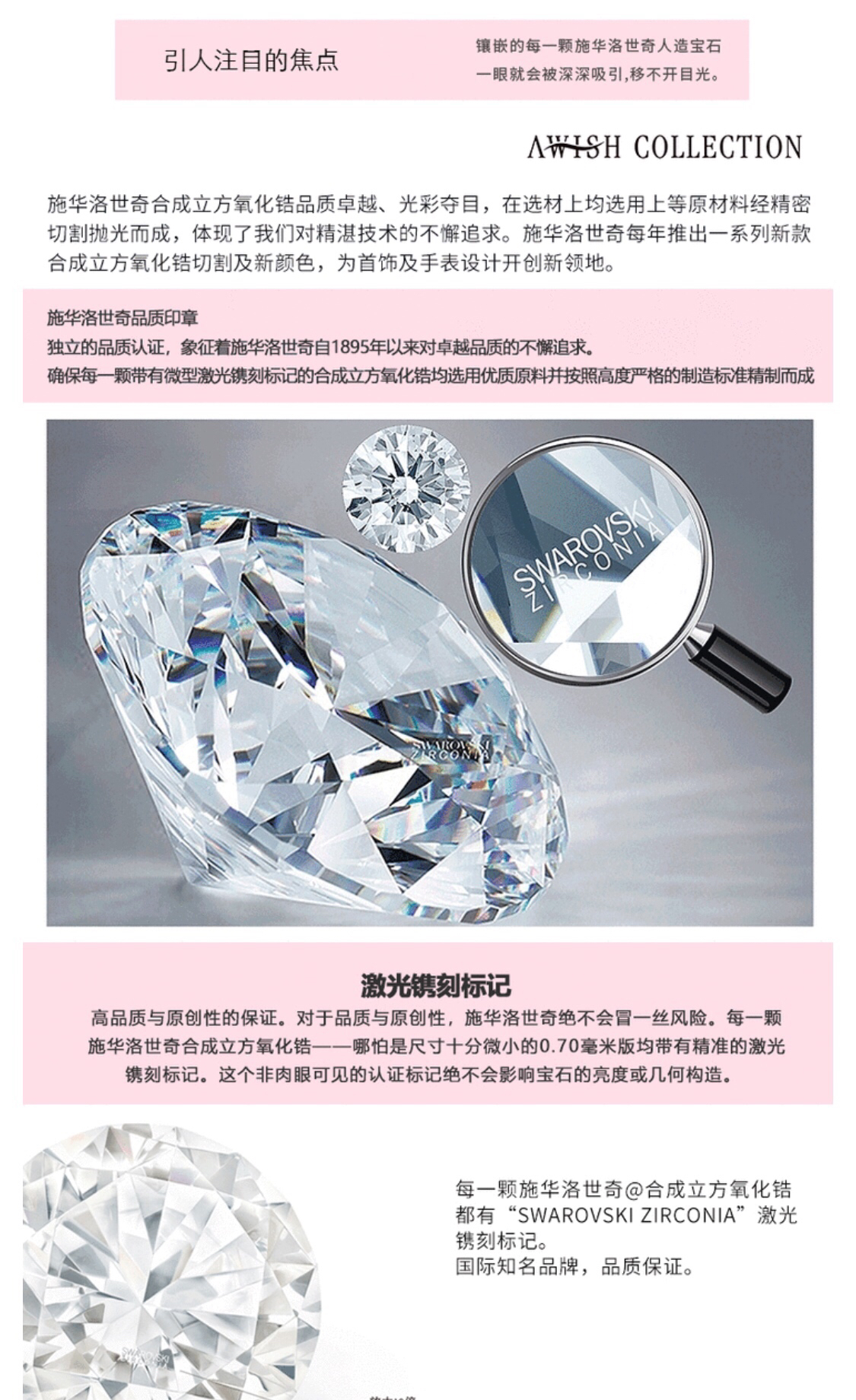 说明:1、品牌是Awish Collection,全线采用施华洛世奇水晶珠宝,每颗切割水晶都有微缩防伪,放大12倍后能看到施华洛世奇SWAROVSKI logo。该品牌属于深圳华鑫汇珠宝公司。华鑫汇是奥地利施华洛世奇中国总代理,施华洛世奇增值服务商,最大的施华洛世奇宝石以及镶嵌珠宝经销商,负责国内所有施华洛世奇专柜的运营以及日常事务。奥地利施华洛世奇总公司内地事务只与华鑫汇对接。